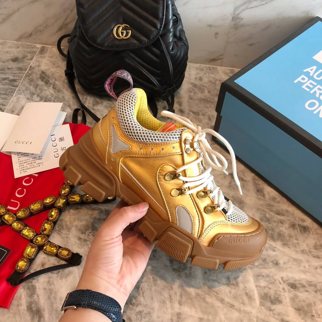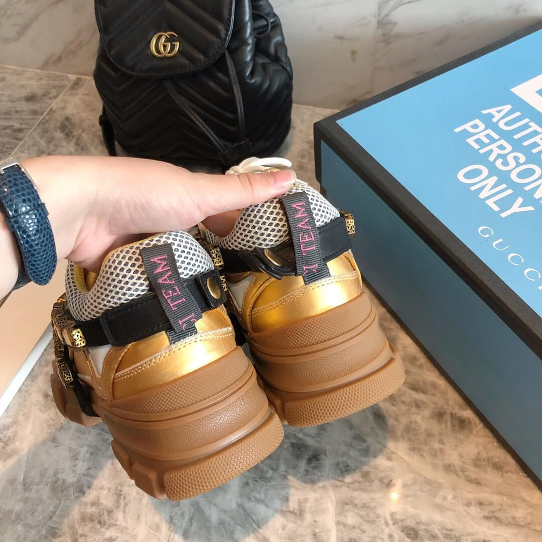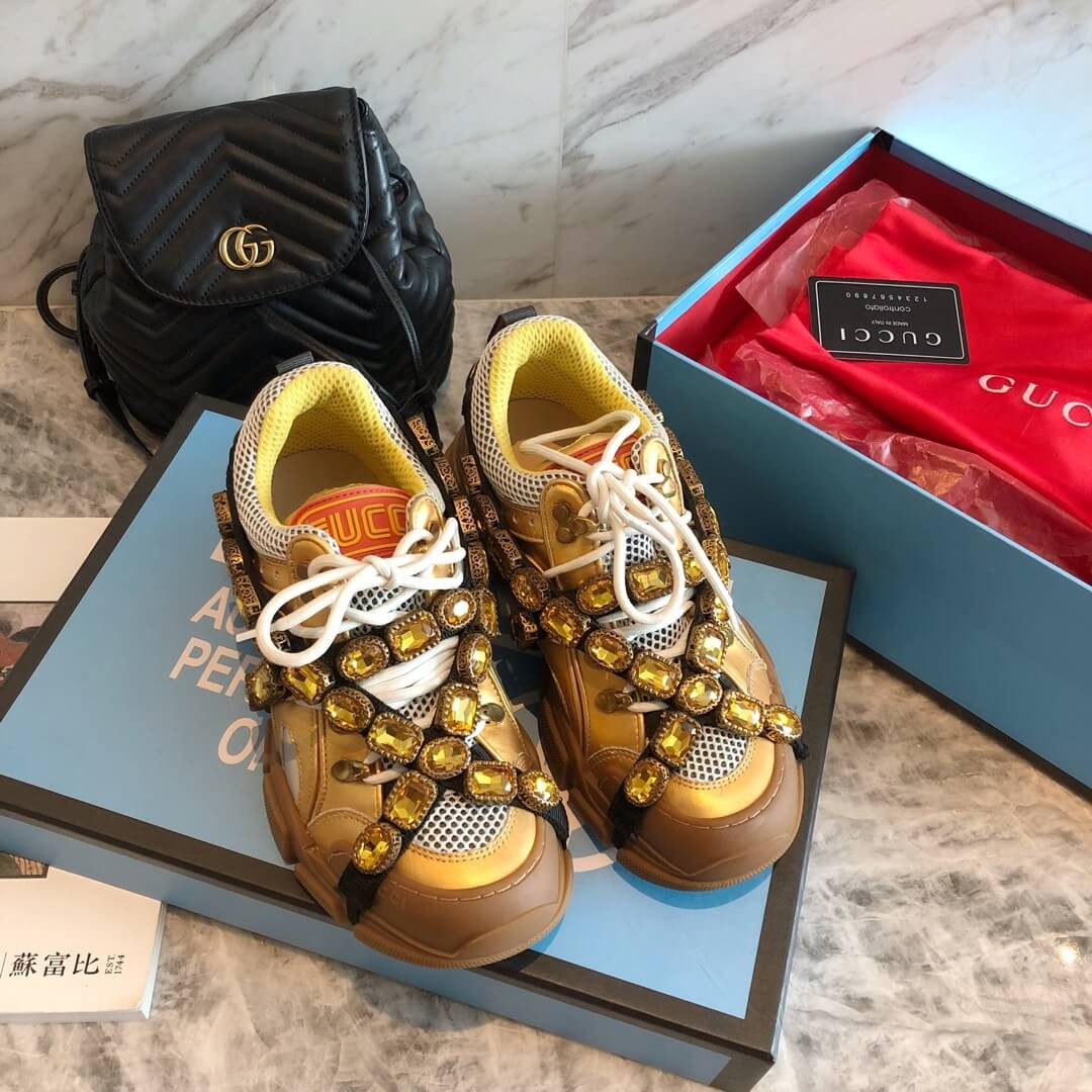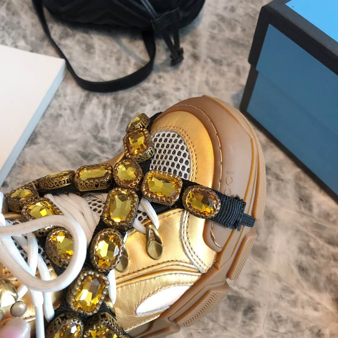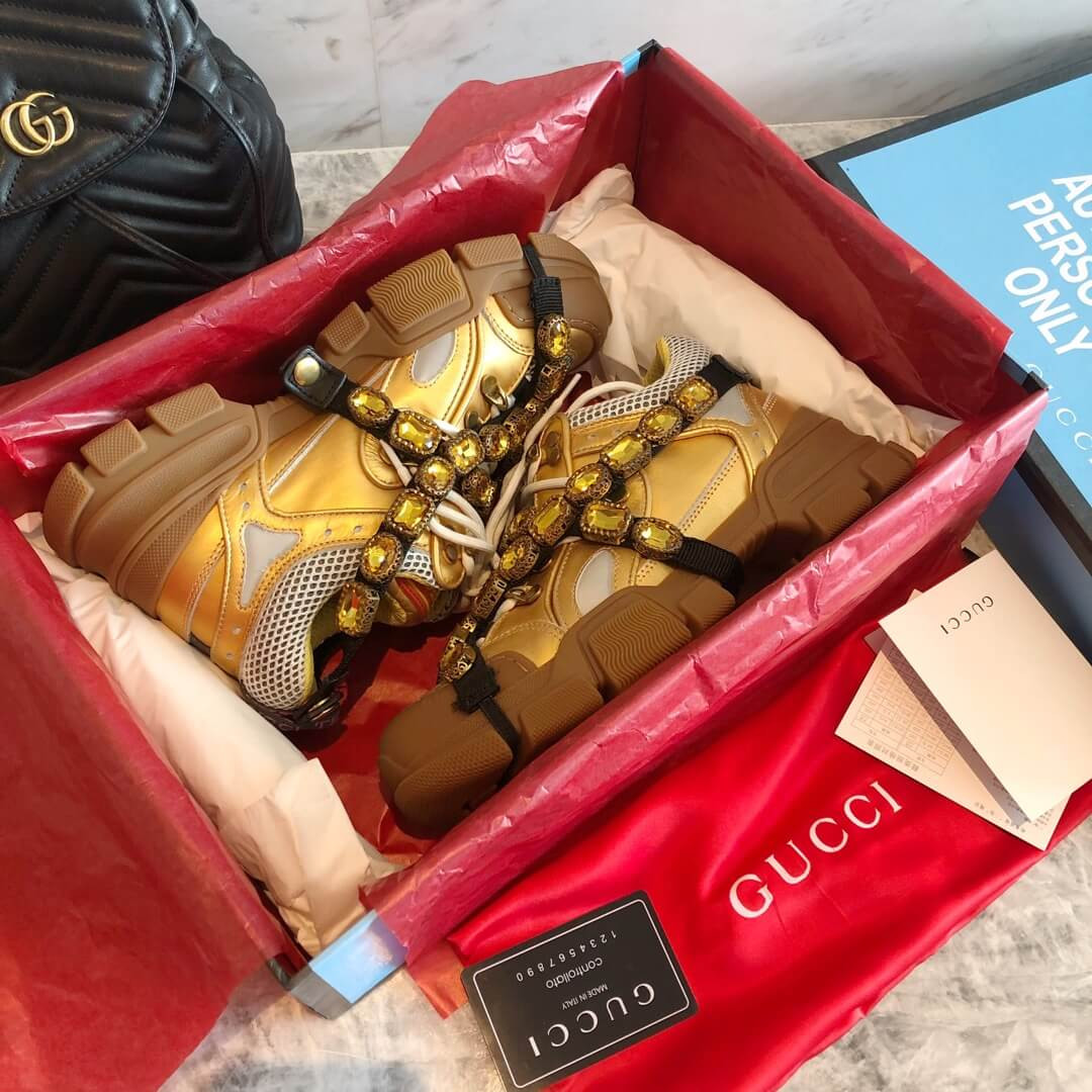 Inspired by the hiking world, this shoe line combines an oversize design with dream-like details. Crystals set in engraved metal casings have a vintage jewel effect, embroidered onto a removable elastic strap that wraps around the shoe. Featuring a mix of metallic leather, mesh and reflective fabric, the accessory is defined by the Gucci patch with the graphic font of SEGA.