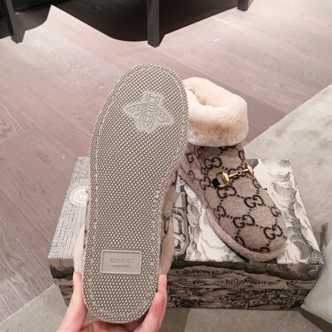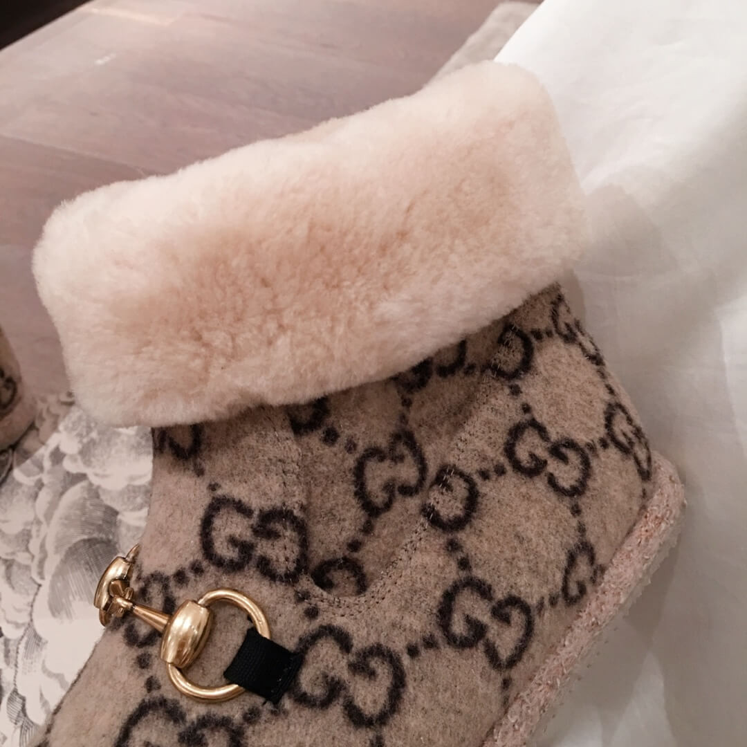The women's ankle boot is reinterpreted in textured fabrics, merino wool lining and a fabric covered midsole—elements that mimic slippers. One of gucci's signature design details, the horsebit is shown on the top of the toe. This wool is enhanced with the gg logo—first used in the 1970s its an evolution of the original gucci rhombi design from the 1930s.