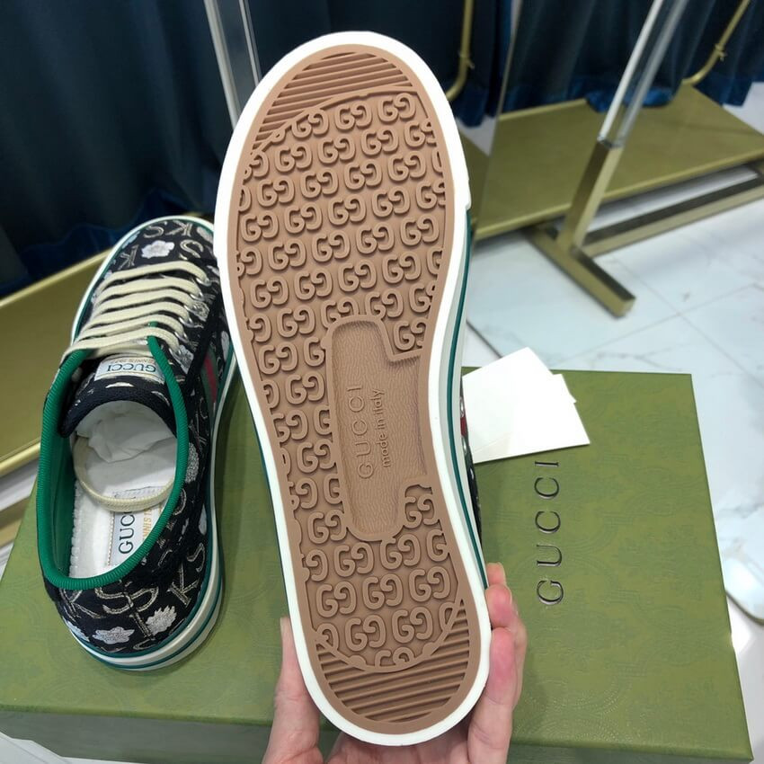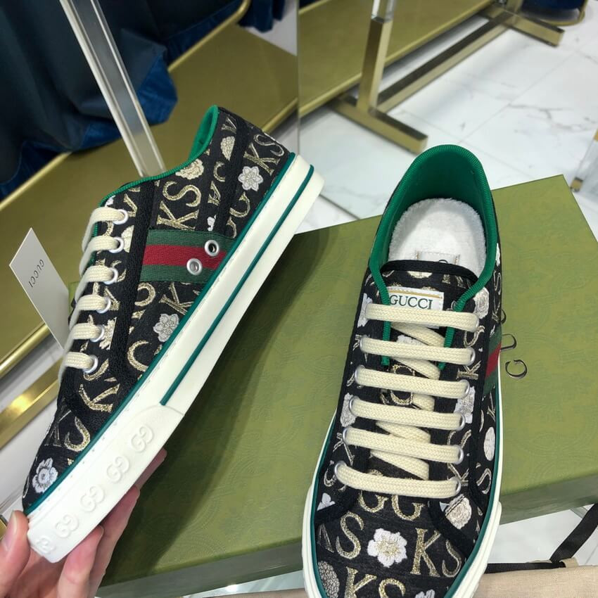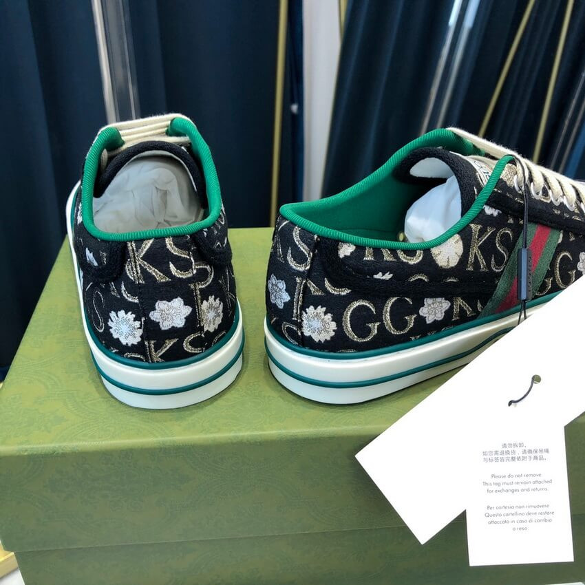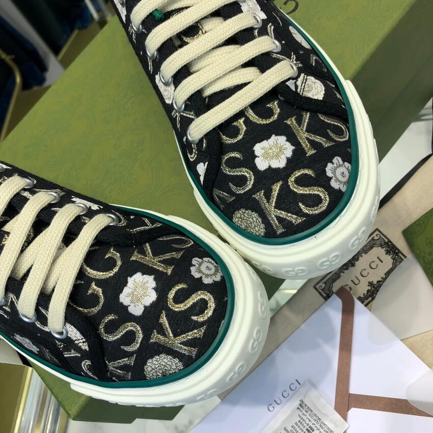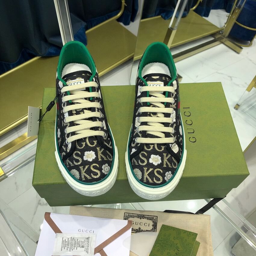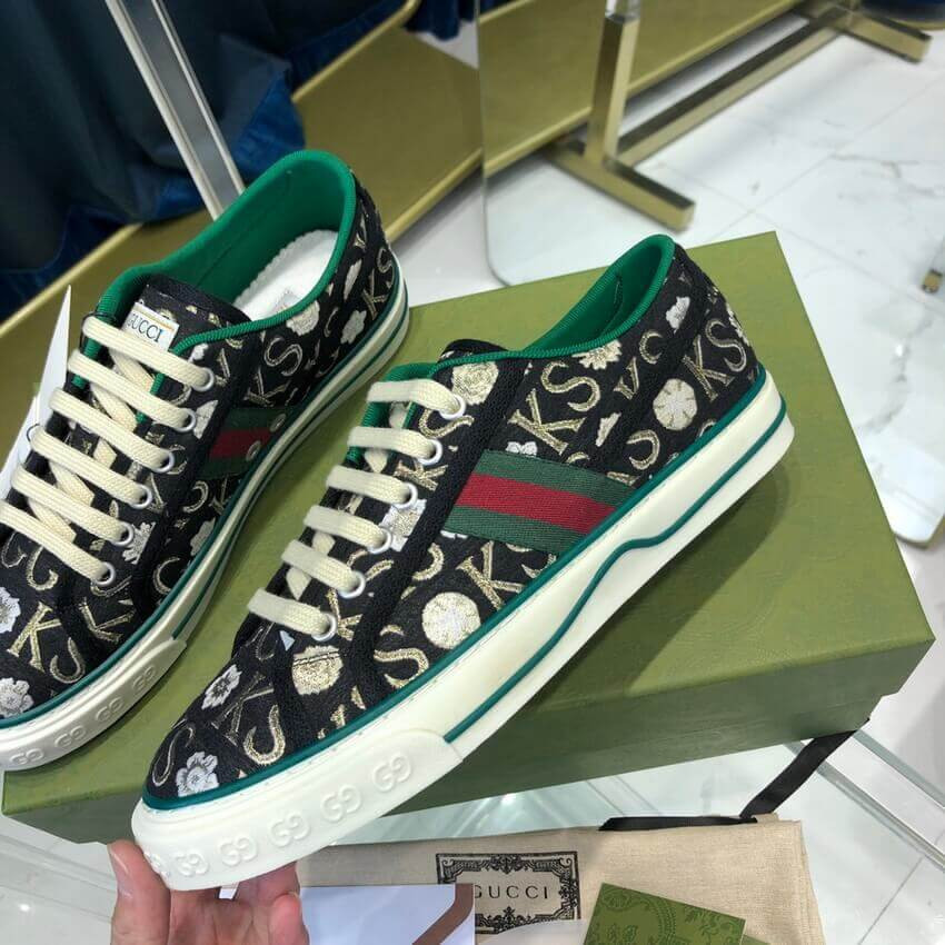 Part of the Gucci Tennis 1977 line, this sneaker is animated by a monogram print that mixies the initials of Ken Scott withflowers. Nicknamed the ‘Fashion Gardener,’ Ken Scott was an American designer who lived in Milan in the ‘60s and ‘70s and whose colorful floral drawings were reflective of his eclectic personality.