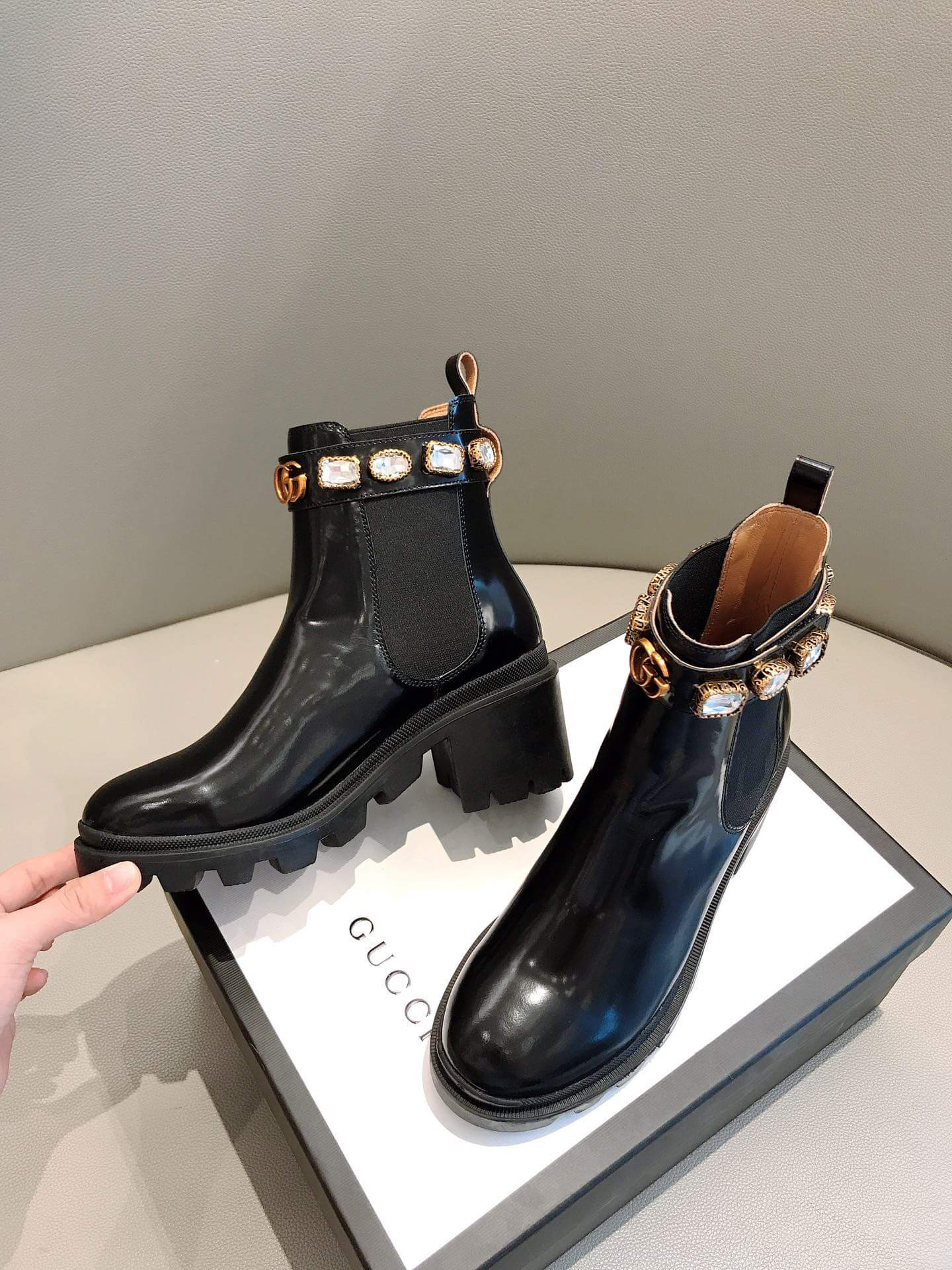 The ankle boot in shiny black leather is designed with a lug sole and elastic inserts on each side for a pull-on entry. Completed with a detachable ankle strap dotted with sparkling crystals encased within engraved trims, resembling vintage jewels. The emblematic Double G finishes the front.