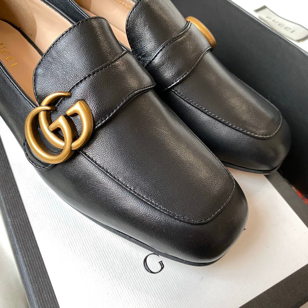 The lightwhite leather loafer has a slim shape with a rounded square toe, completed withthe Double G hardware along the strap. Since the introduction of its classic shape in 1950s, the preppy-inspired shoe has continued its influence, redesigned with different details, in new forms and materials.