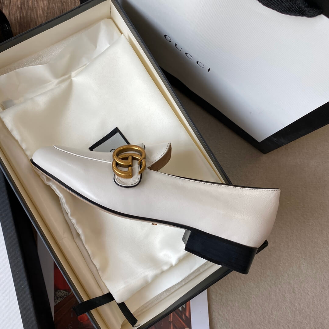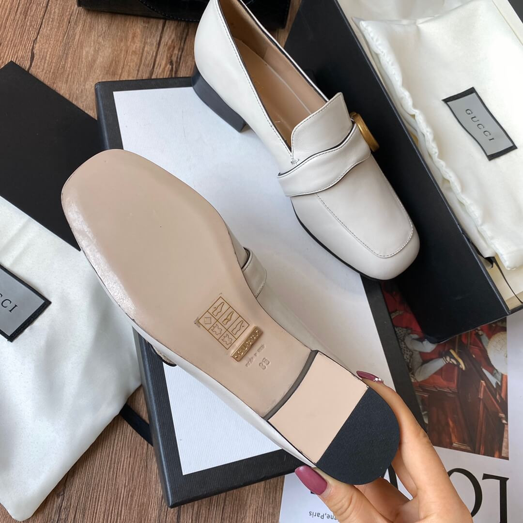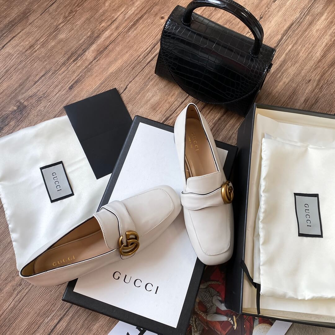 The lightwhite leather loafer has a slim shape with a rounded square toe, completed withthe Double G hardware along the strap. Since the introduction of its classic shape in 1950s, the preppy-inspired shoe has continued its influence, redesigned with different details, in new forms and materials.