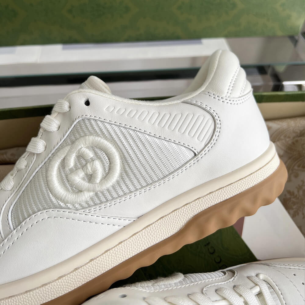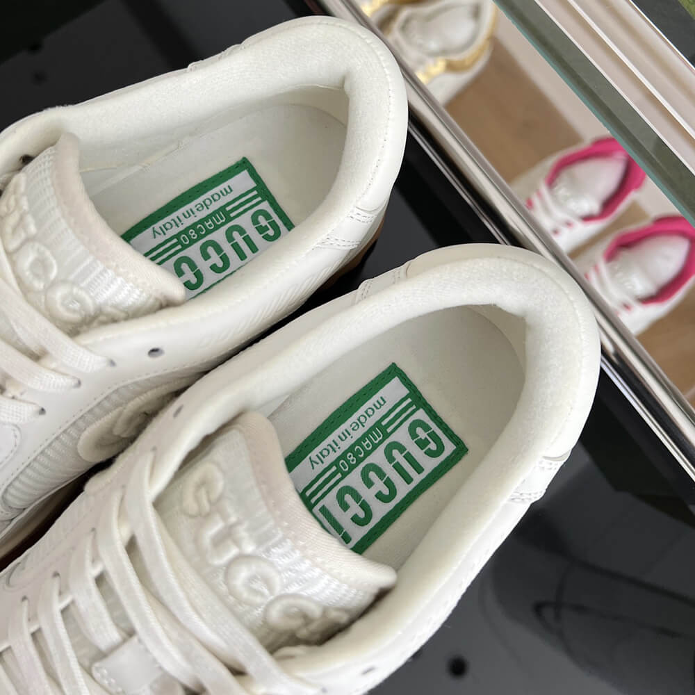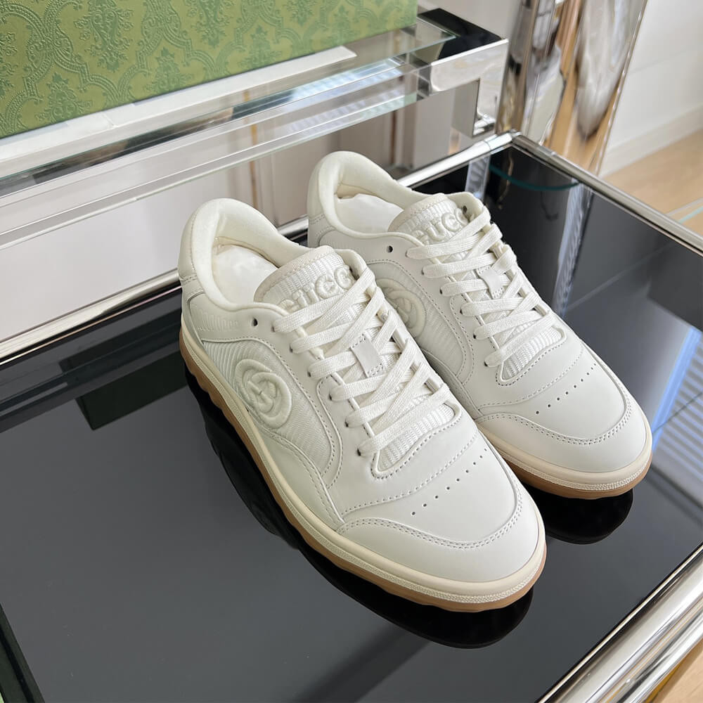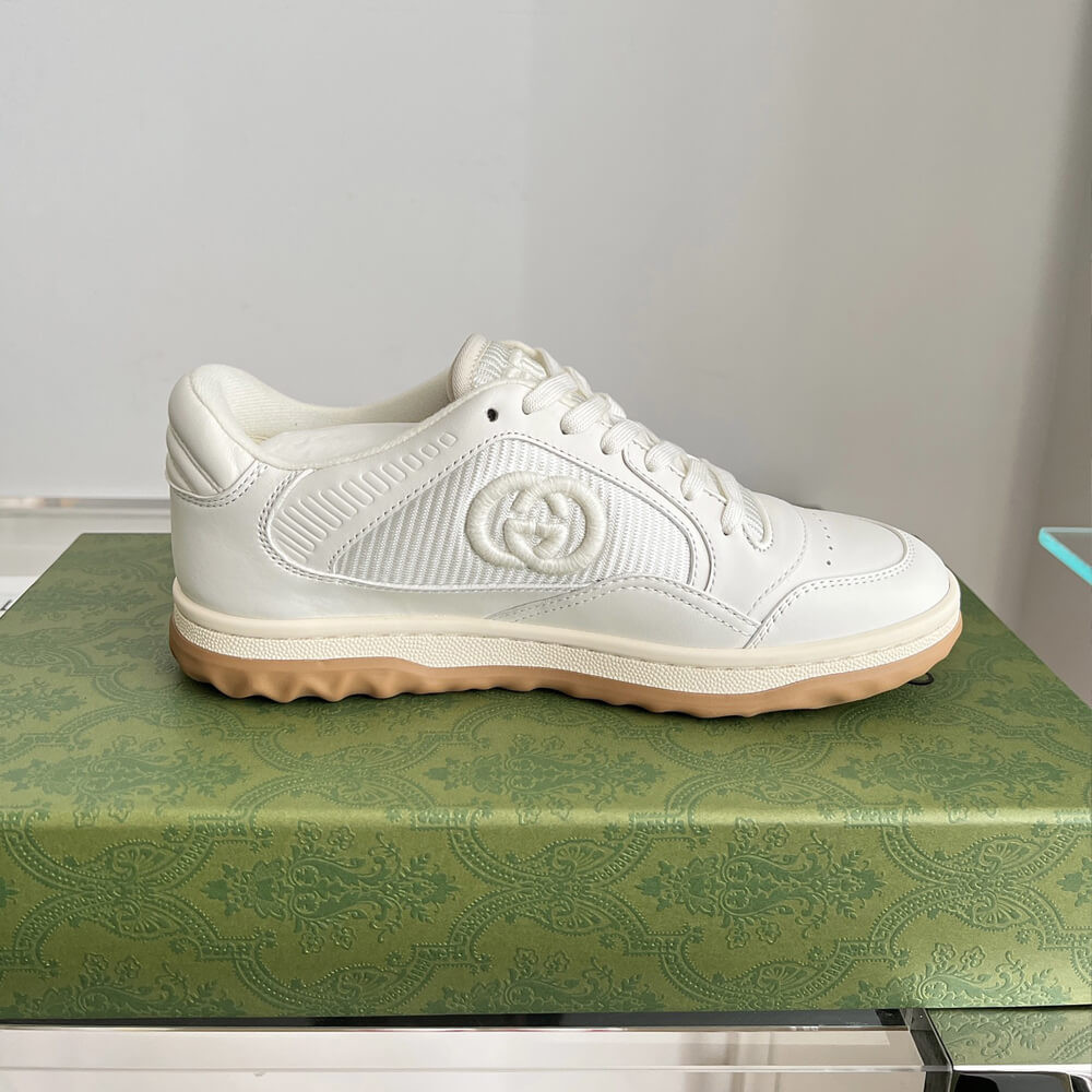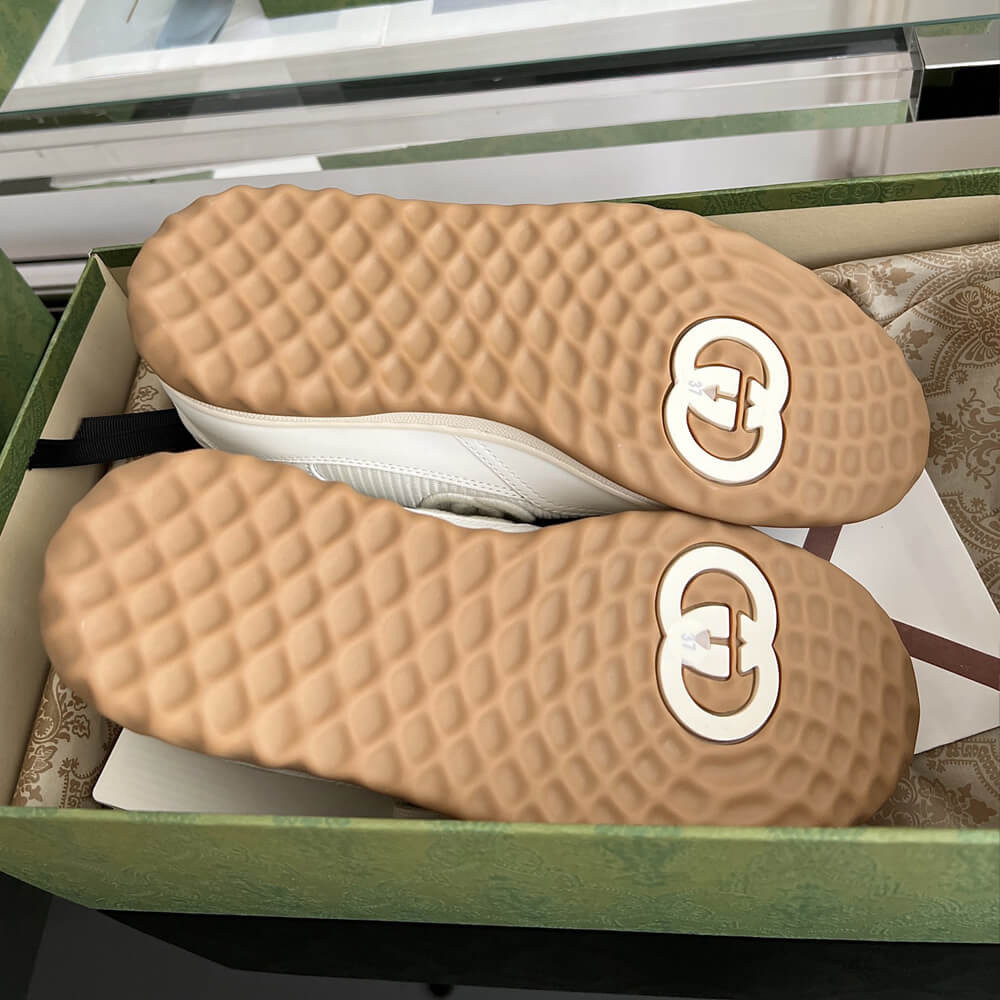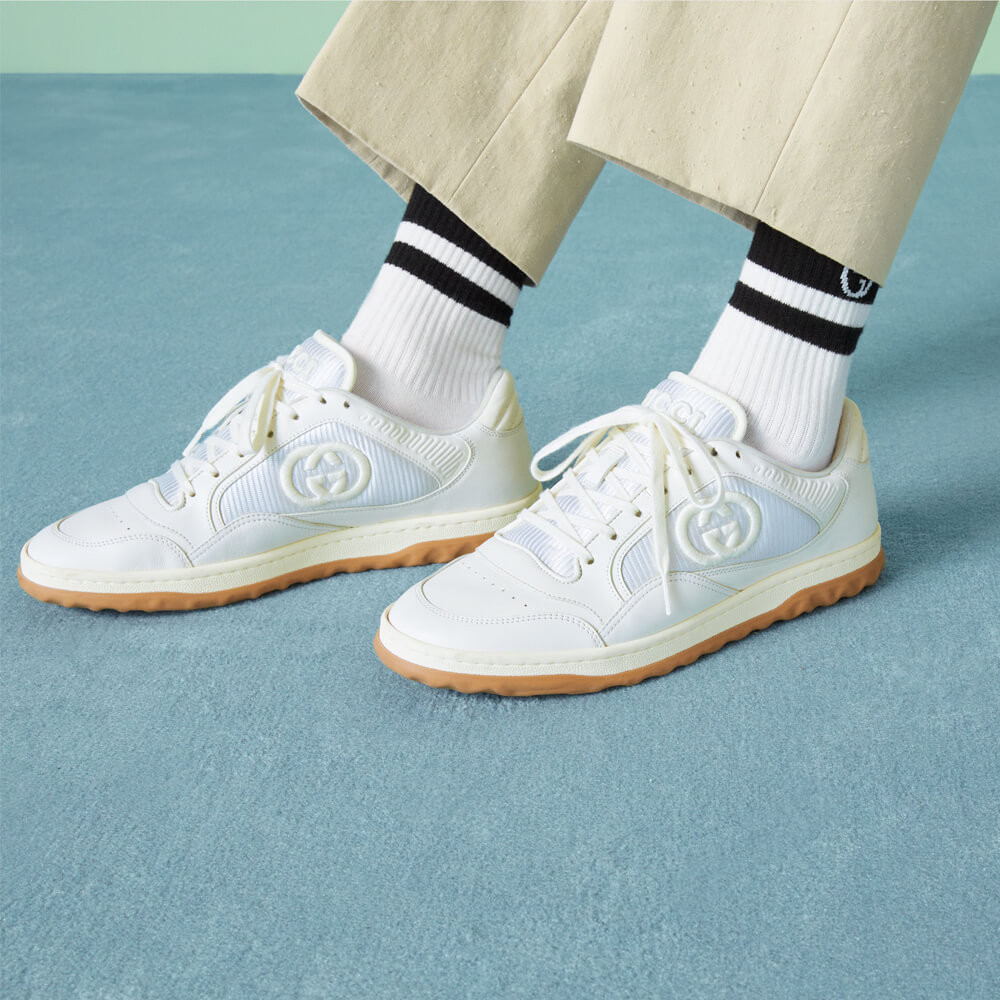 A discreet Interlocking G speaks to the subtle narrative that runs through the collection. Presented against off white leather, the motif brings the House logo to the fore in this retro-inspired sneaker design.