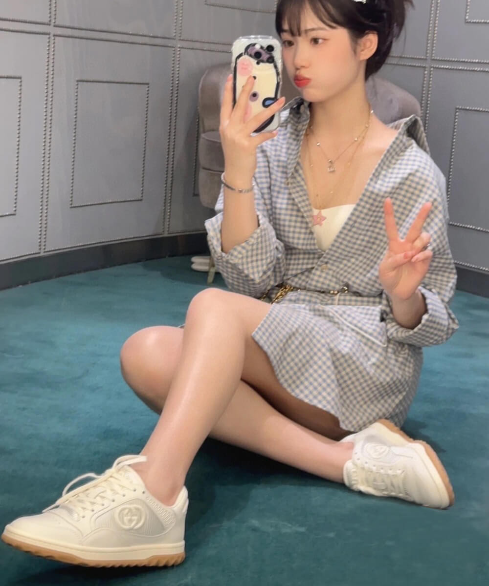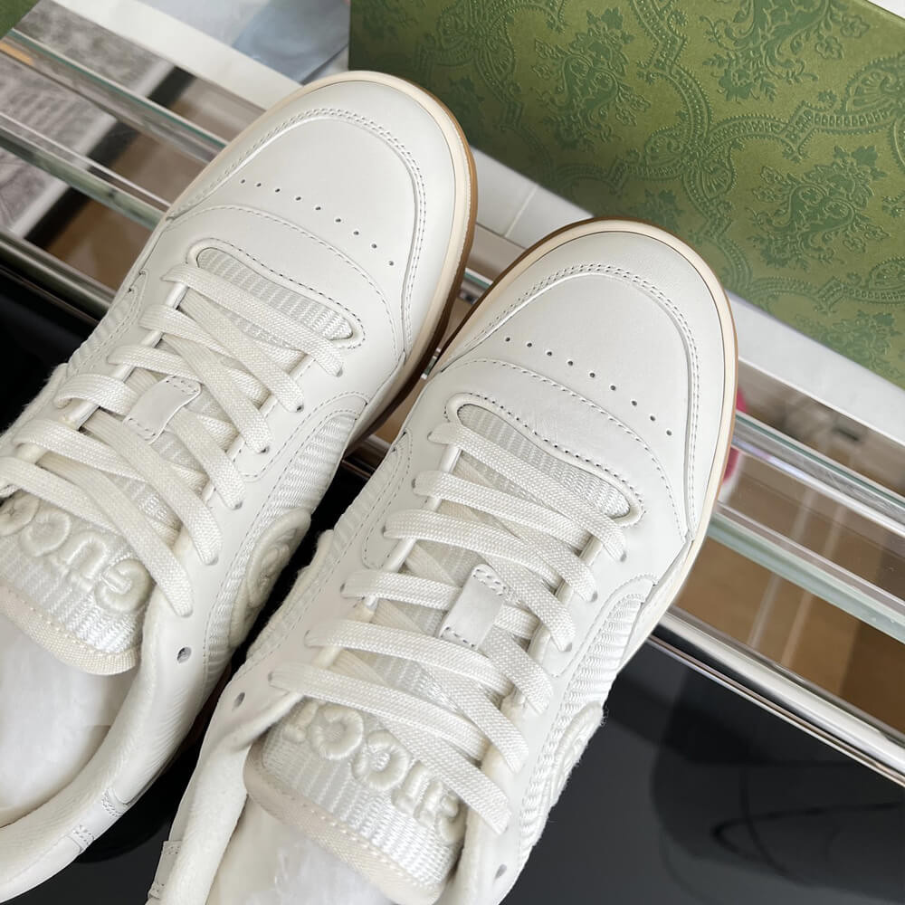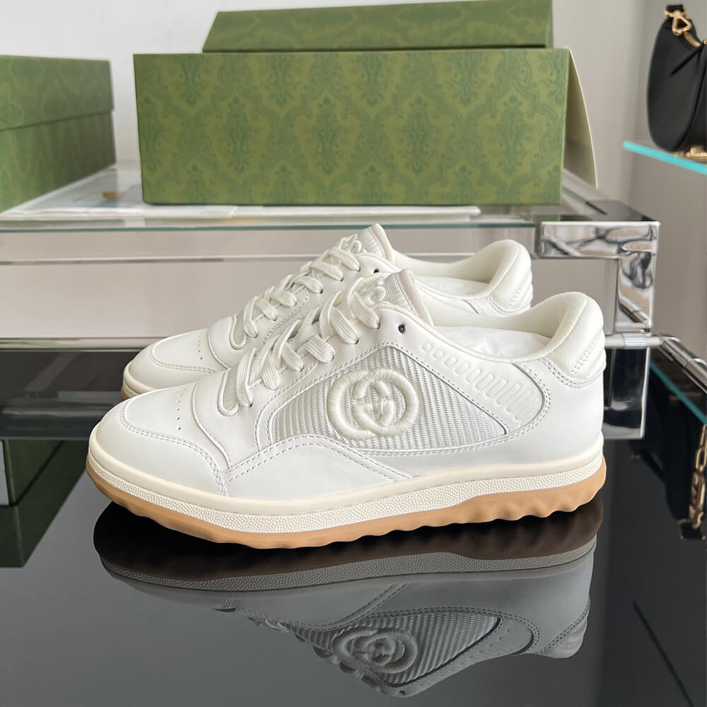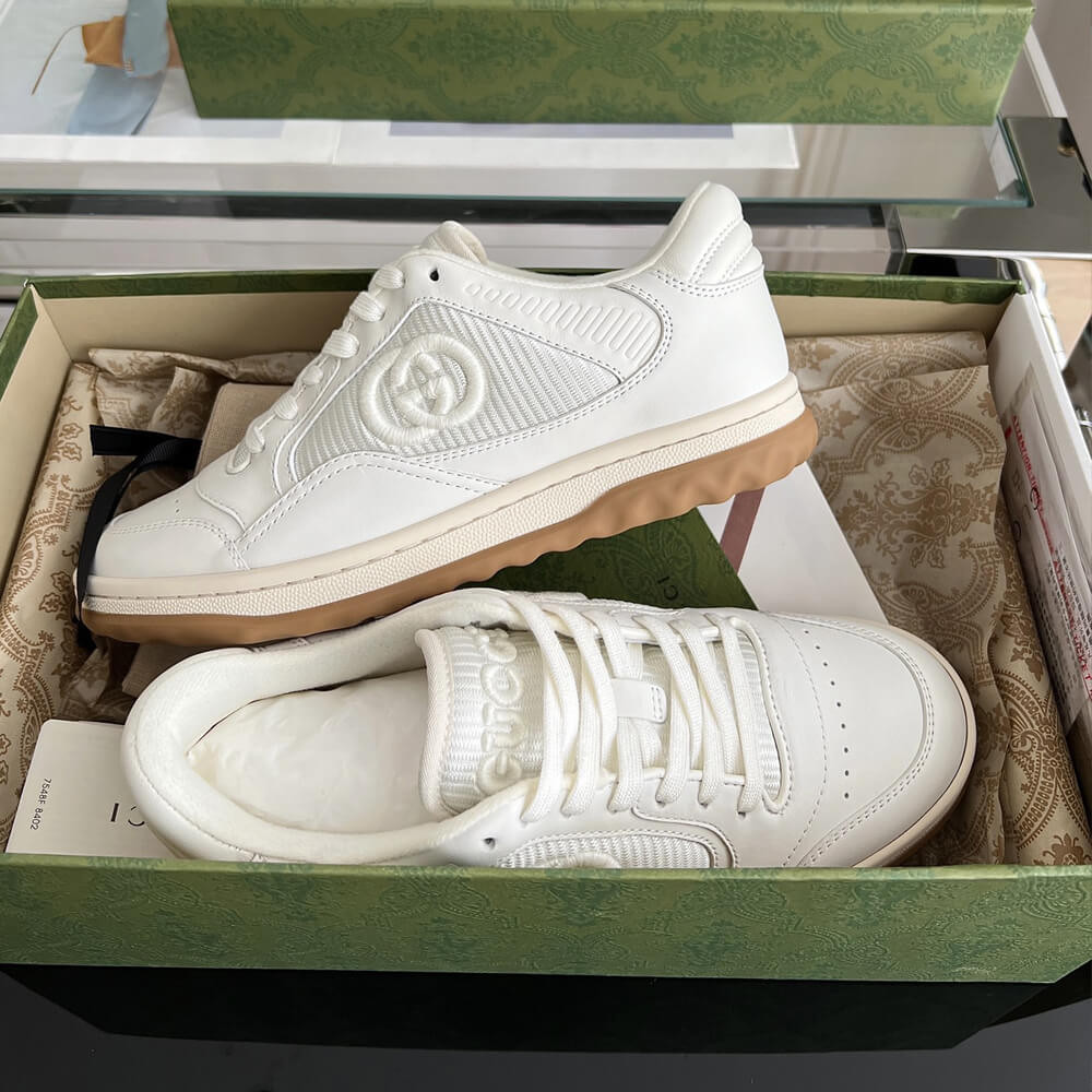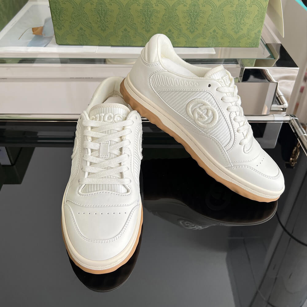 A discreet Interlocking G speaks to the subtle narrative that runs through the collection. Presented against off white leather, the motif brings the House logo to the fore in this retro-inspired sneaker design.