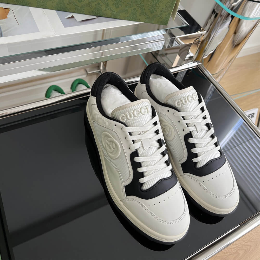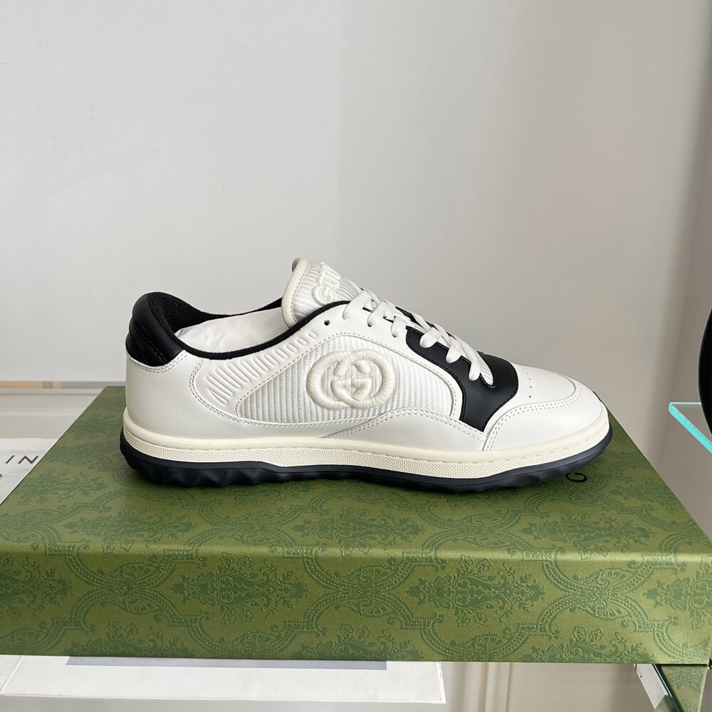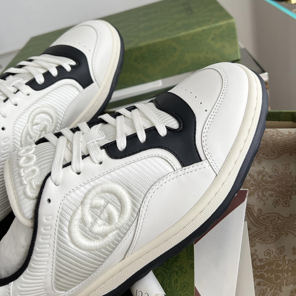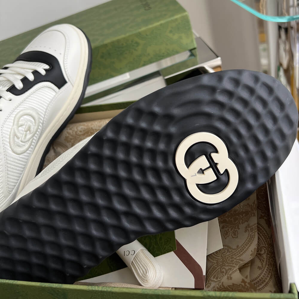 A discreet Interlocking G speaks to the subtle narrative that runs through the collection. Presented against off white leather, the motif brings the House logo to the fore in this retro-inspired sneaker design.