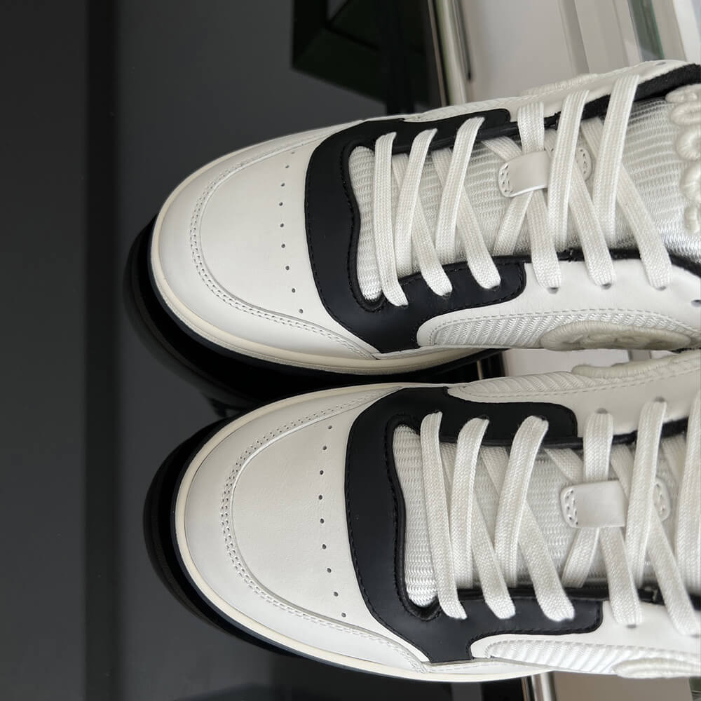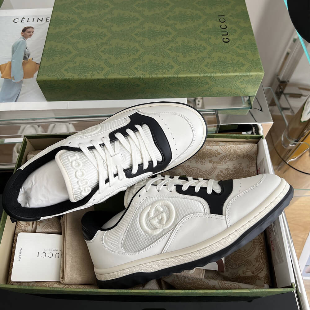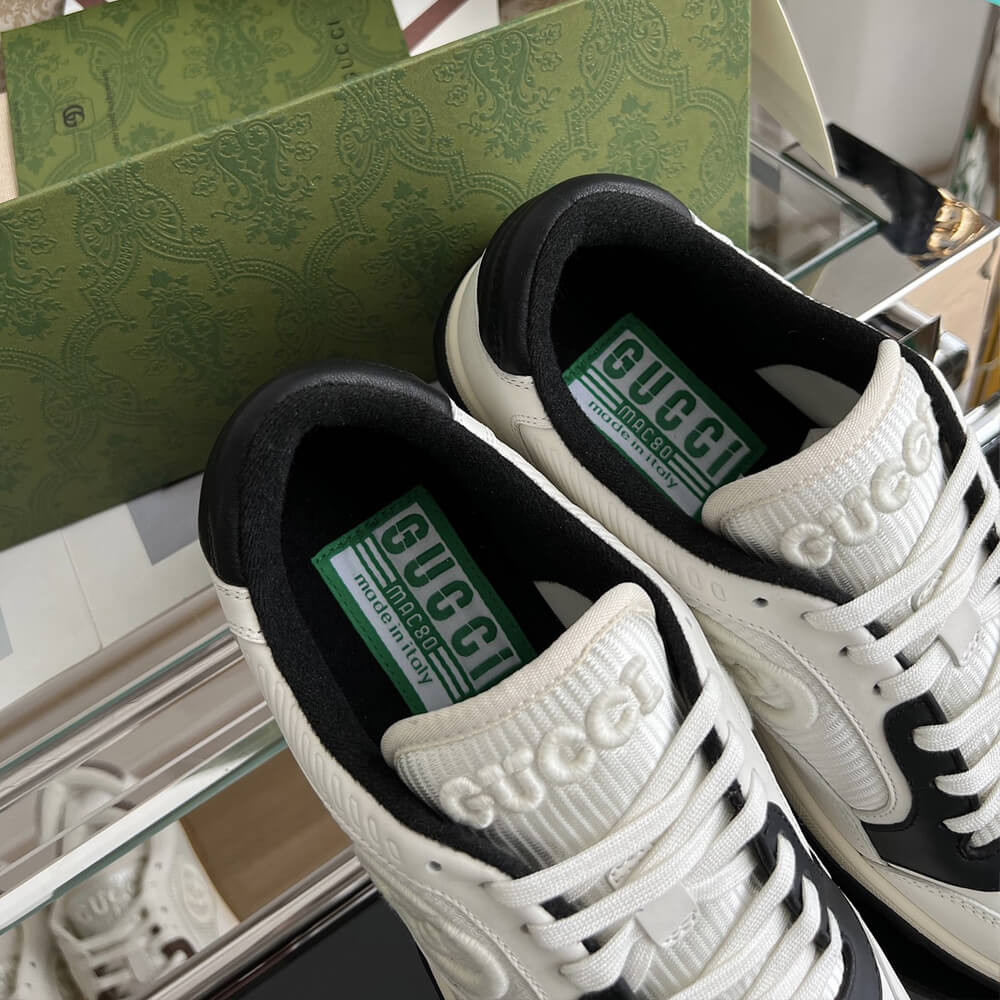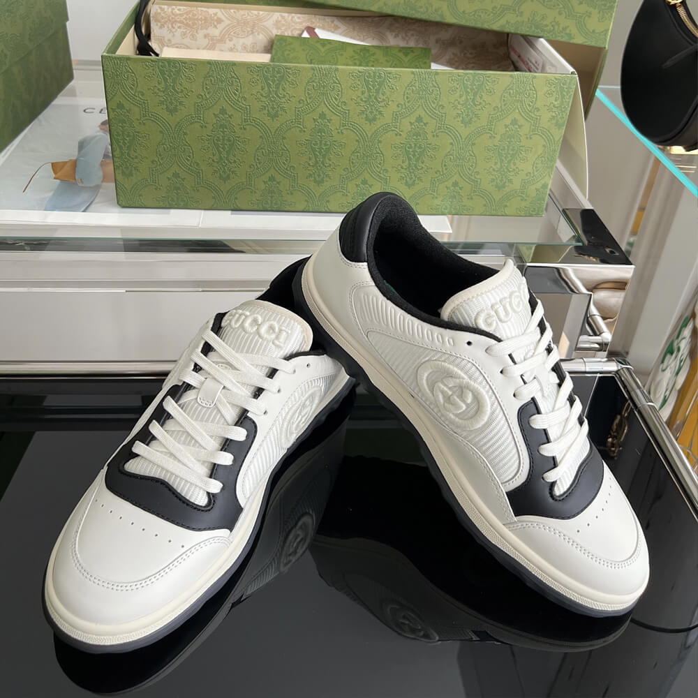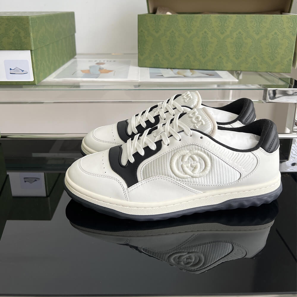 A discreet Interlocking G speaks to the subtle narrative that runs through the collection. Presented against off white leather, the motif brings the House logo to the fore in this retro-inspired sneaker design.