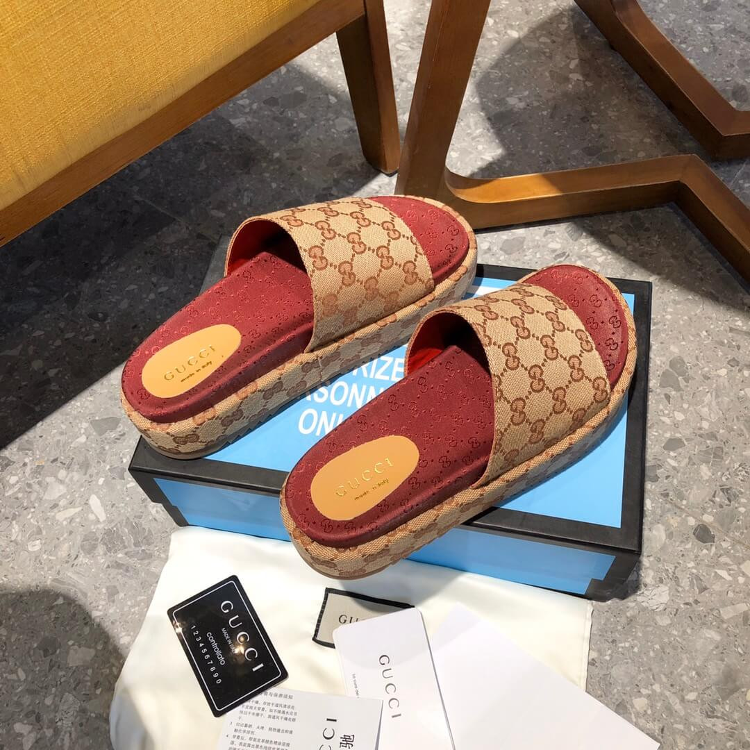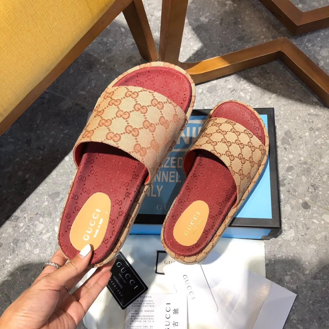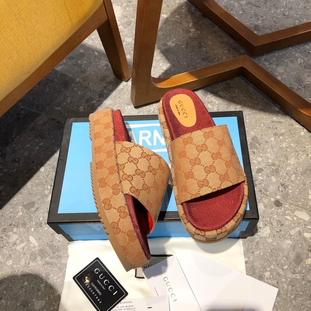 Crafted from Original GG canvas, the slide sandal features a wide strap set on a platform with rubber sole. First used in the 1970s, the GG logo was an evolution of the original Gucci rhombi design from the 1930s, and from then it's been an established symbol of Gucci's heritage.
