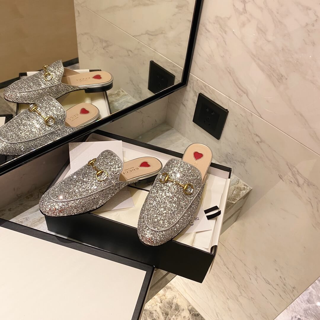 These chic loafers are crafted of metallic silver glitter. They feature a an aged goldhorsebit embellishment, a rounded toe, and a 0.5 inch wedge heel. These have a unique look for the right occasion,