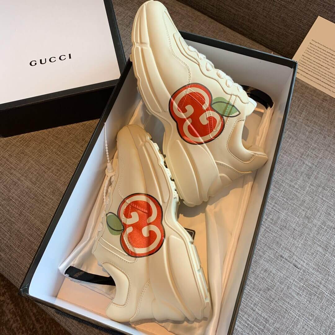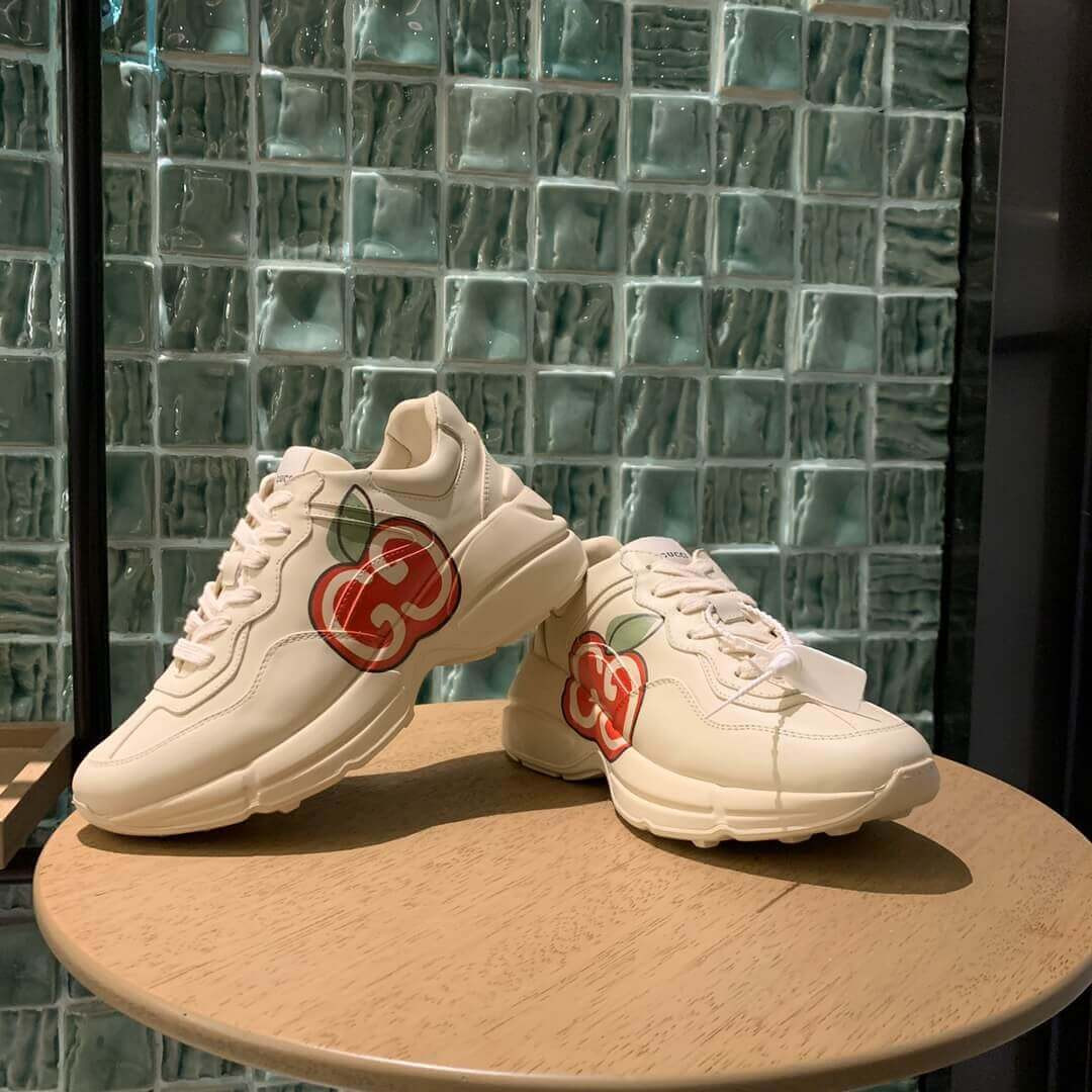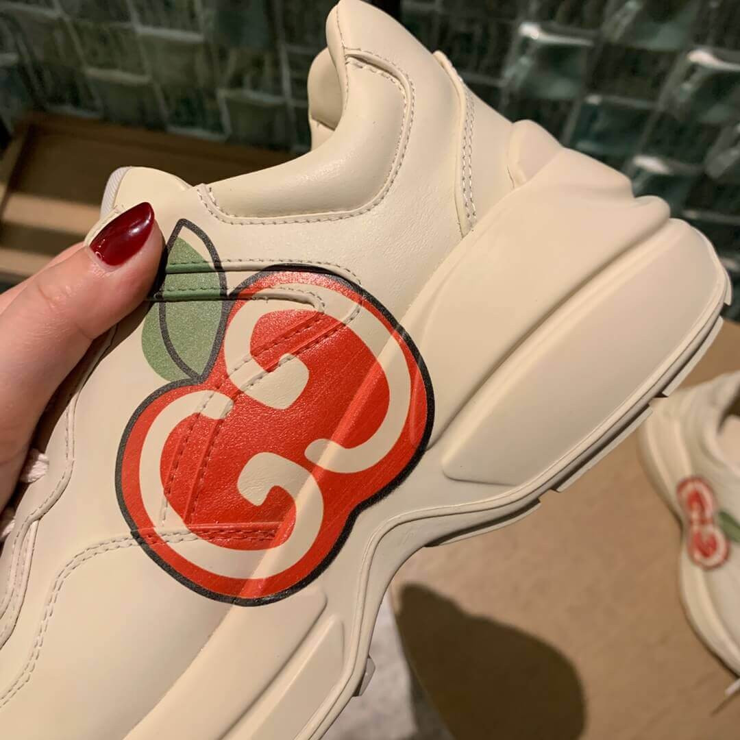 A new interpretation of the GG logo is introduced for Cruise 2020, incorporating the House code within a cartoon inspired drawing of a red apple. The print is set along the sides of the women's Rhyton sneaker—the coveted silhouette is crafted from ivory leather with a thick sole and chunky contraction.