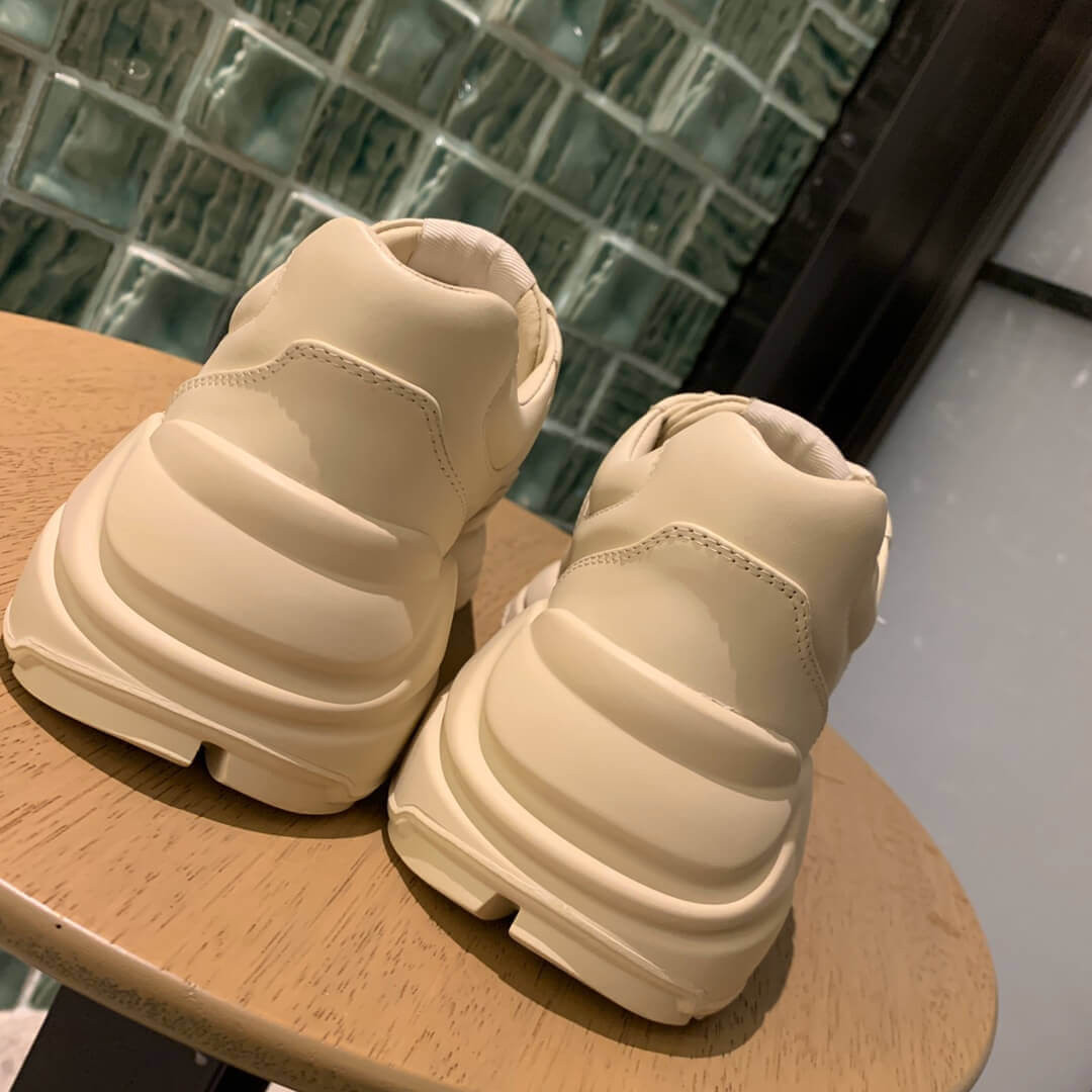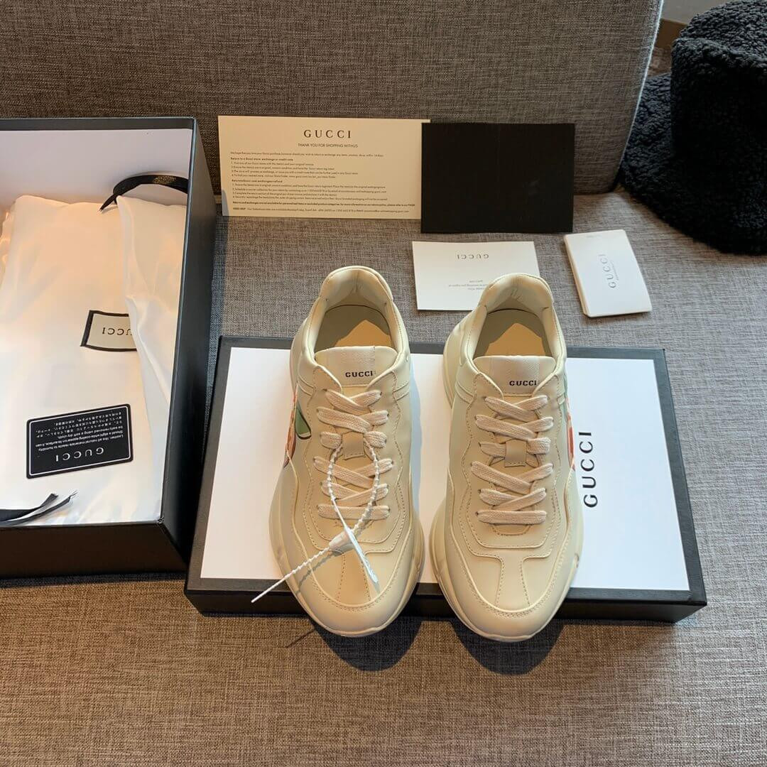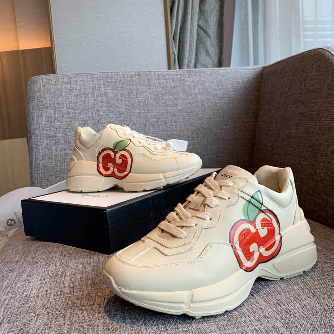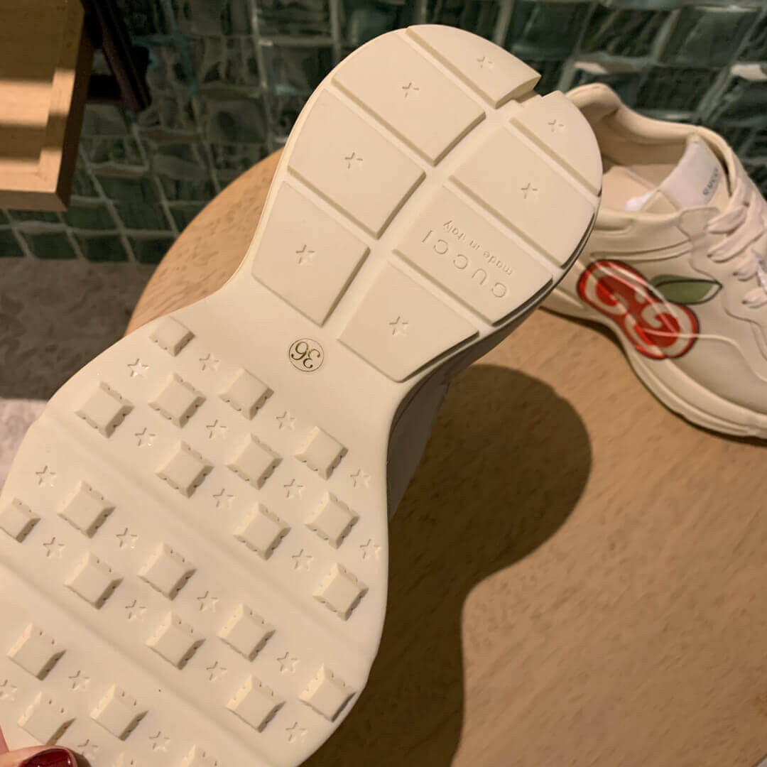 A new interpretation of the GG logo is introduced for Cruise 2020, incorporating the House code within a cartoon inspired drawing of a red apple. The print is set along the sides of the women's Rhyton sneaker—the coveted silhouette is crafted from ivory leather with a thick sole and chunky contraction.
