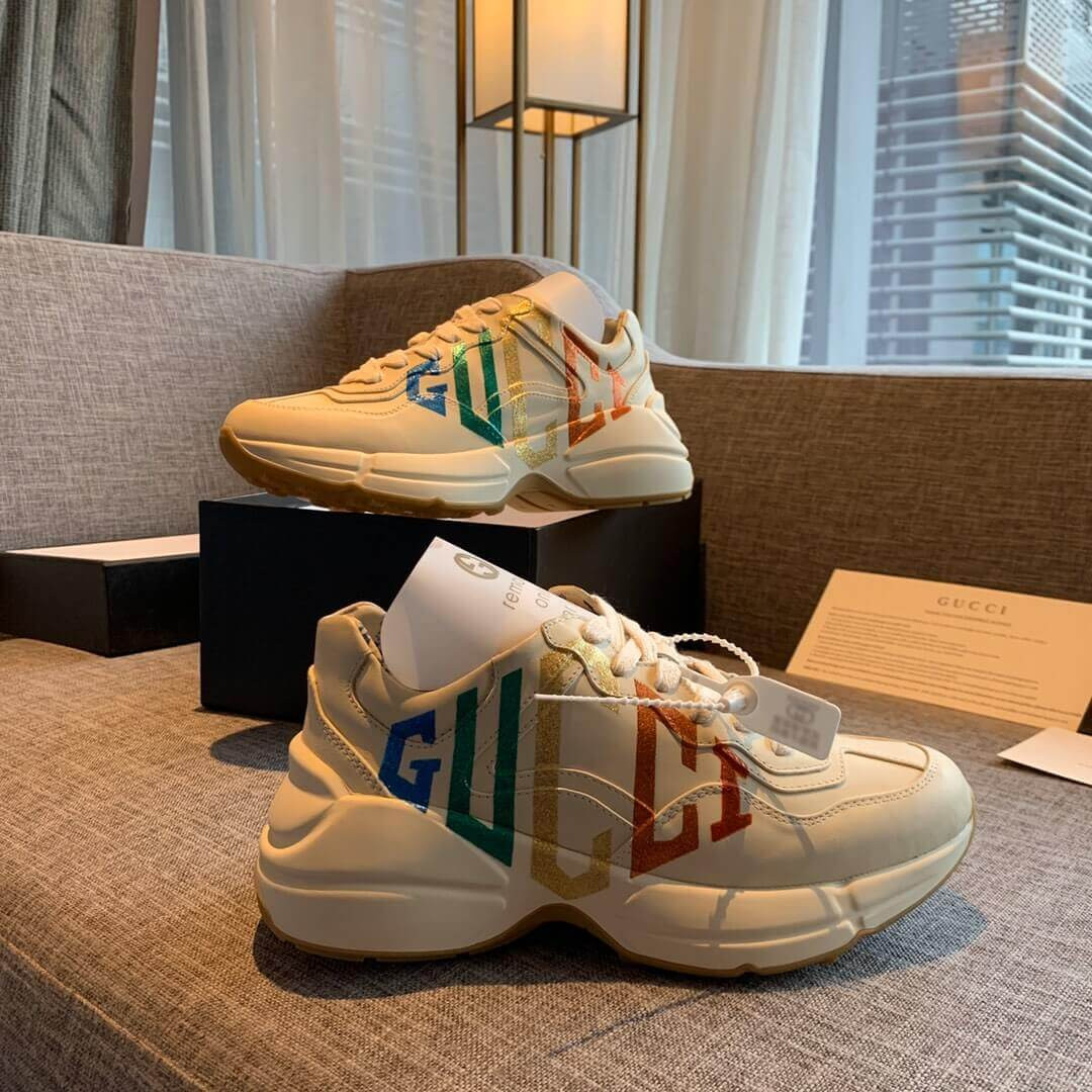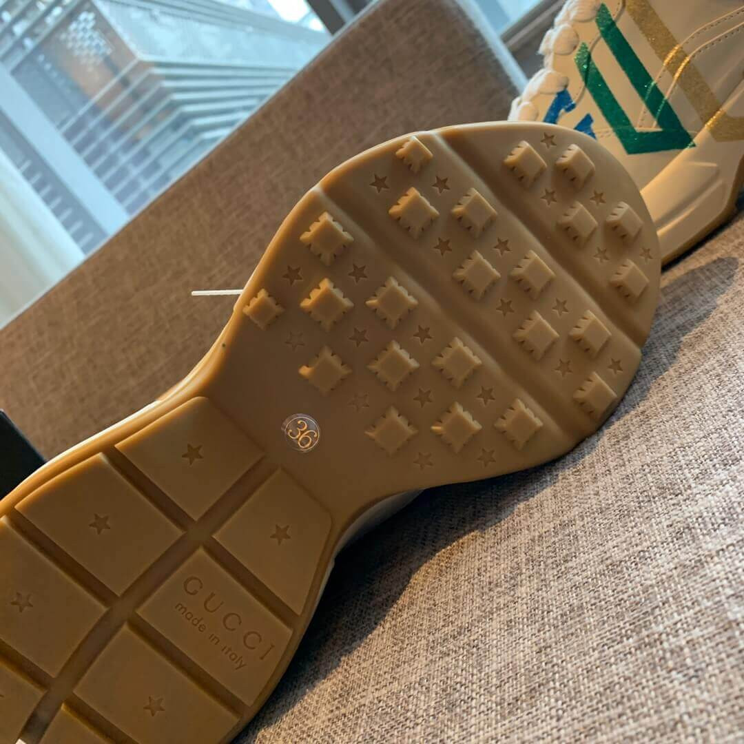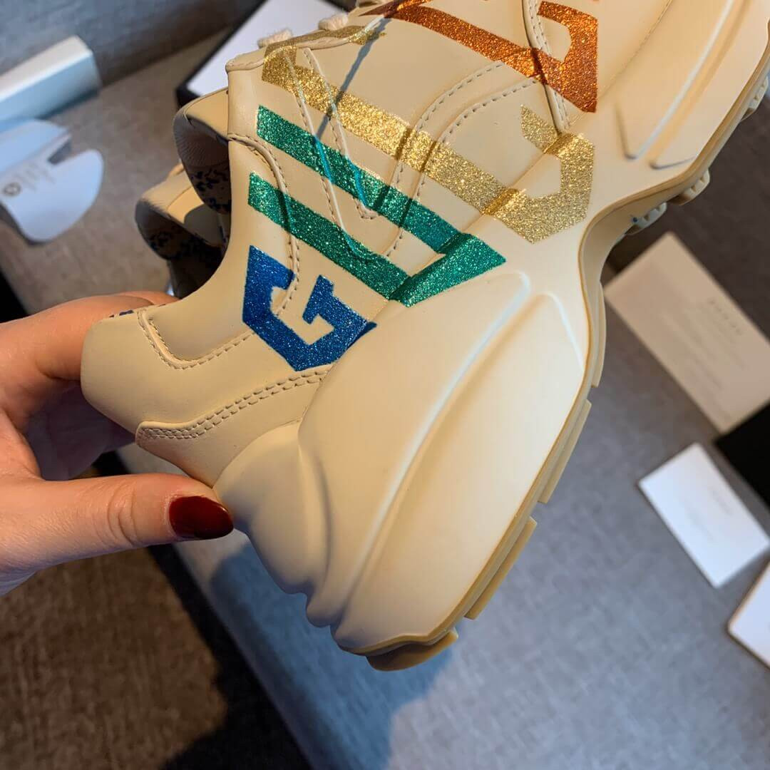 Designed with a thick sole and bulky construction, the leather sneaker is remindful of the old school hip-hop scene and embodiesthe '90s influence pervading the Pre-Fall 2018 collection. Inspired by the tags decorating retro athletic uniforms, the glitterGucci game motif enhances the side of the shoe.