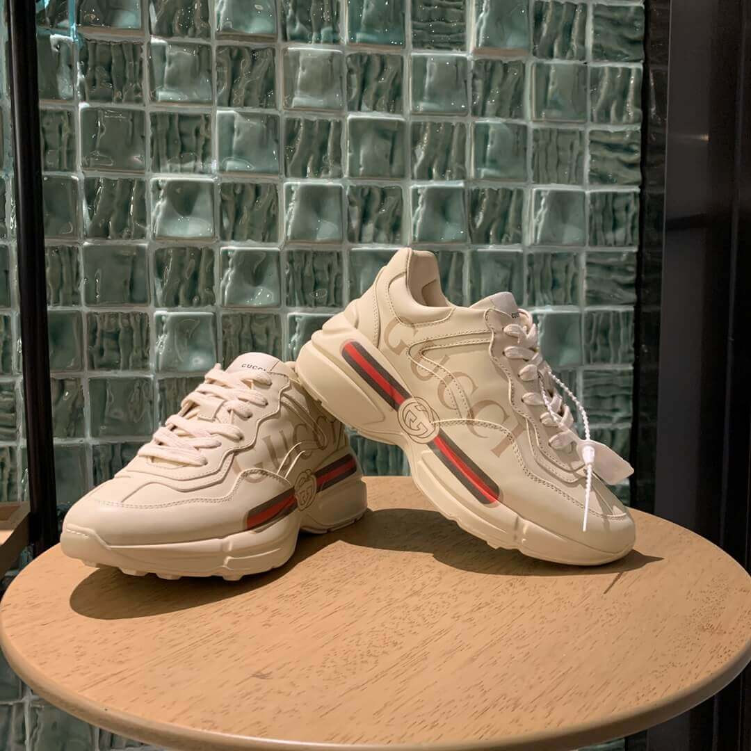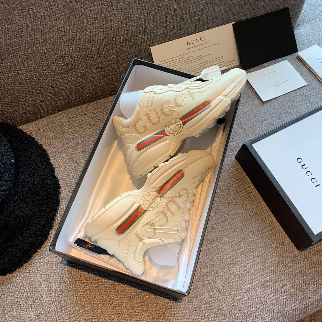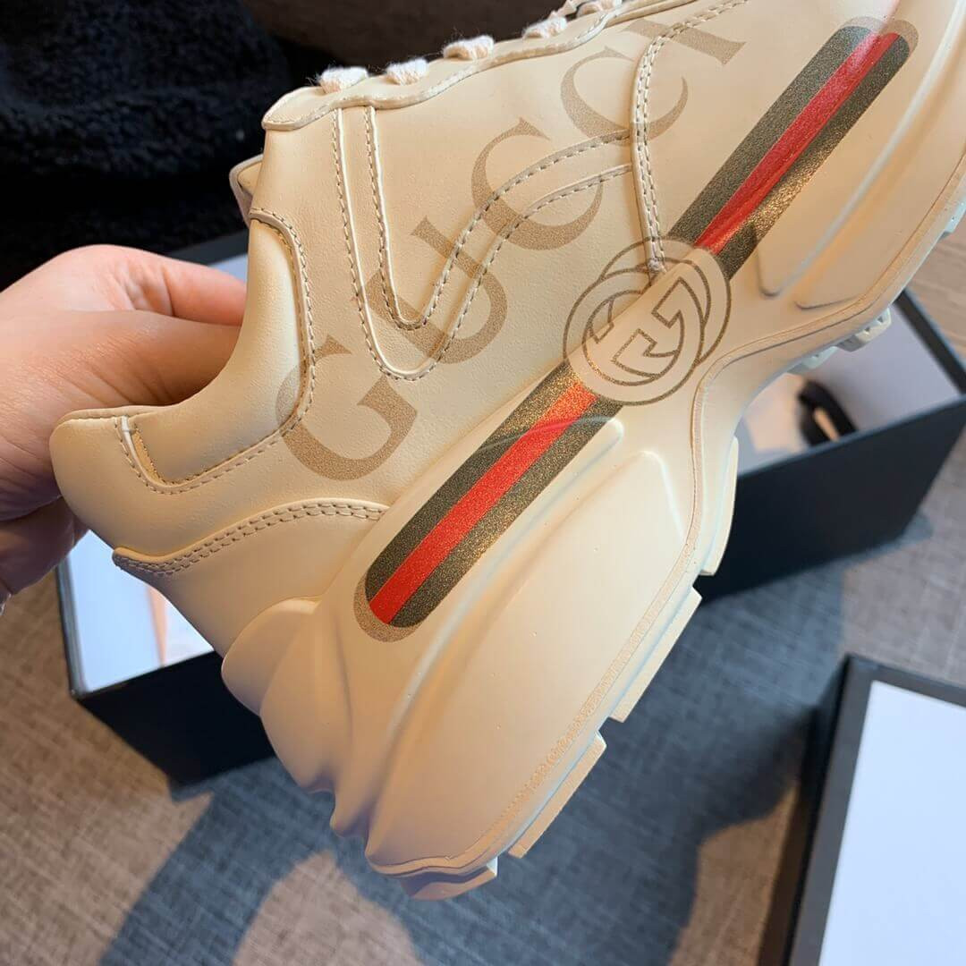 Designed with a thick sole and bulky construction, the sneaker has a retro influence in leather with a vintage Gucci logo inspiredby prints from the 1980s.