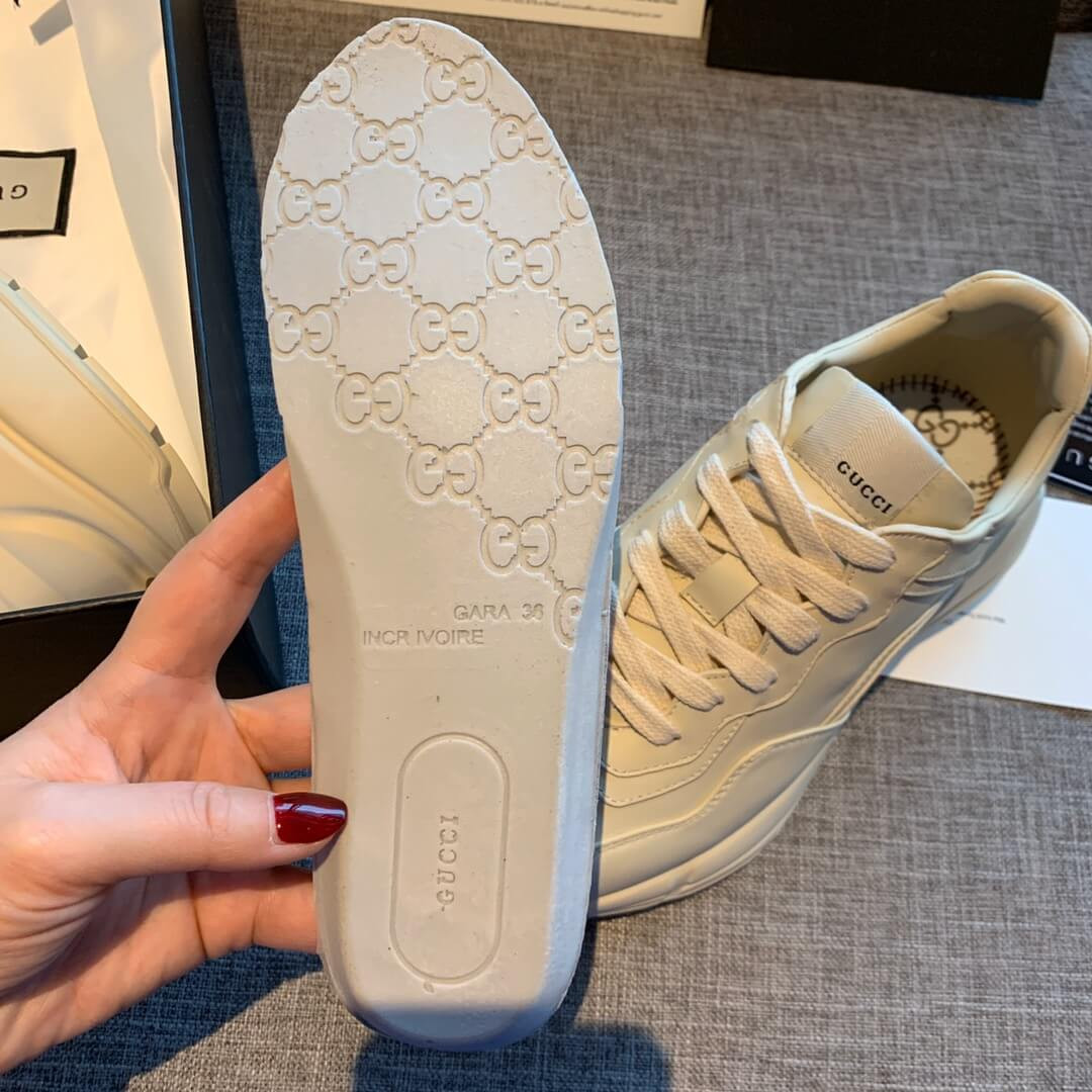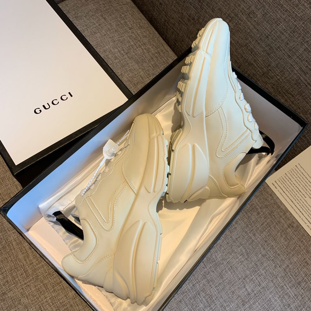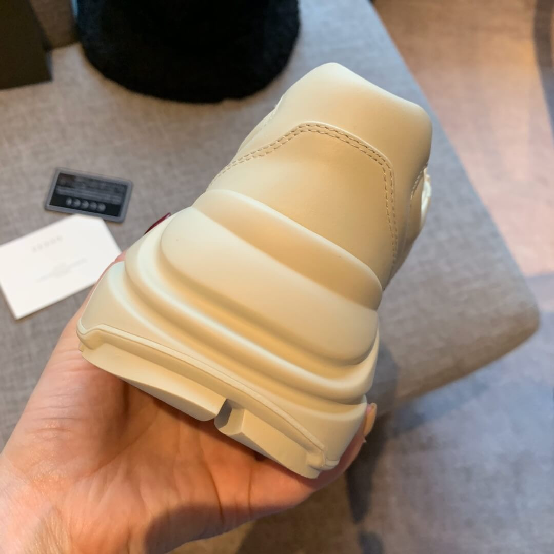 This chunky off-white Gucci sneaker takes inspiration from the old school styles of the '90s and, using luxe materials, dresses itup for a serious high fashion hit. Crafted from soft, supple leather and carefully distressed for a thrift-store vibe, the pair sits proudly on tall rubber outsoles and are finished with a subtle brand tab at the tongue.