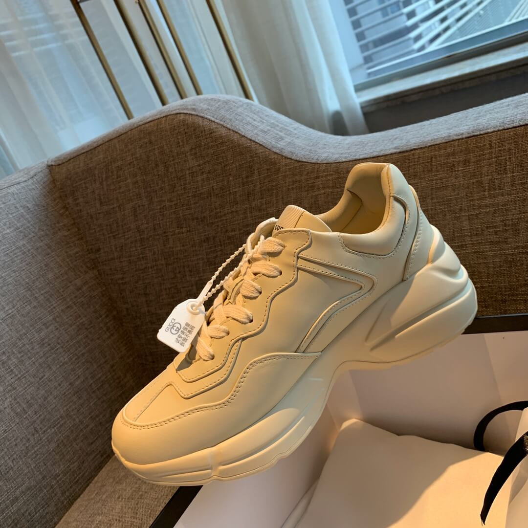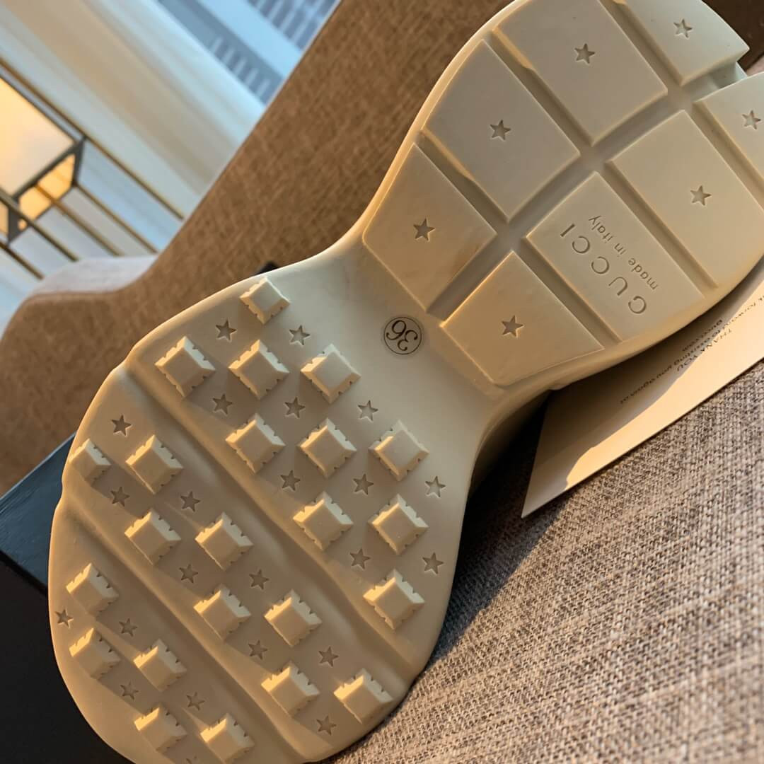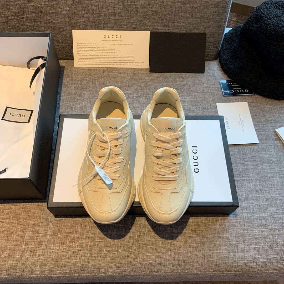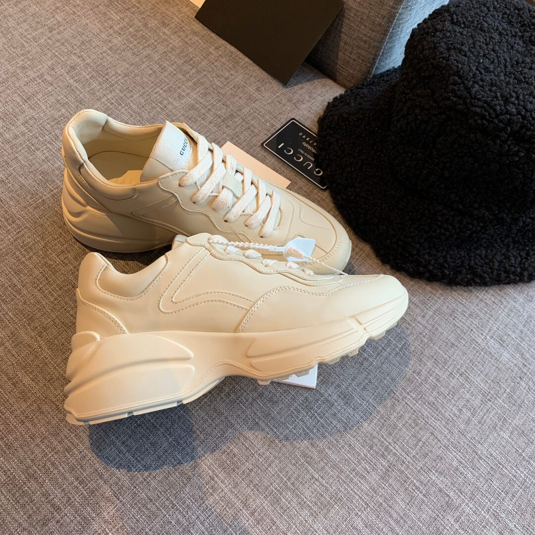 This chunky off-white Gucci sneaker takes inspiration from the old school styles of the '90s and, using luxe materials, dresses itup for a serious high fashion hit. Crafted from soft, supple leather and carefully distressed for a thrift-store vibe, the pair sits proudly on tall rubber outsoles and are finished with a subtle brand tab at the tongue.