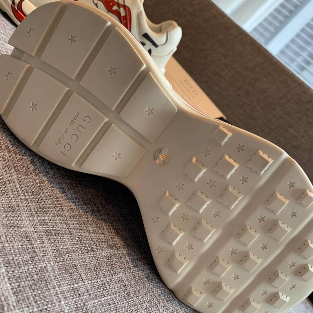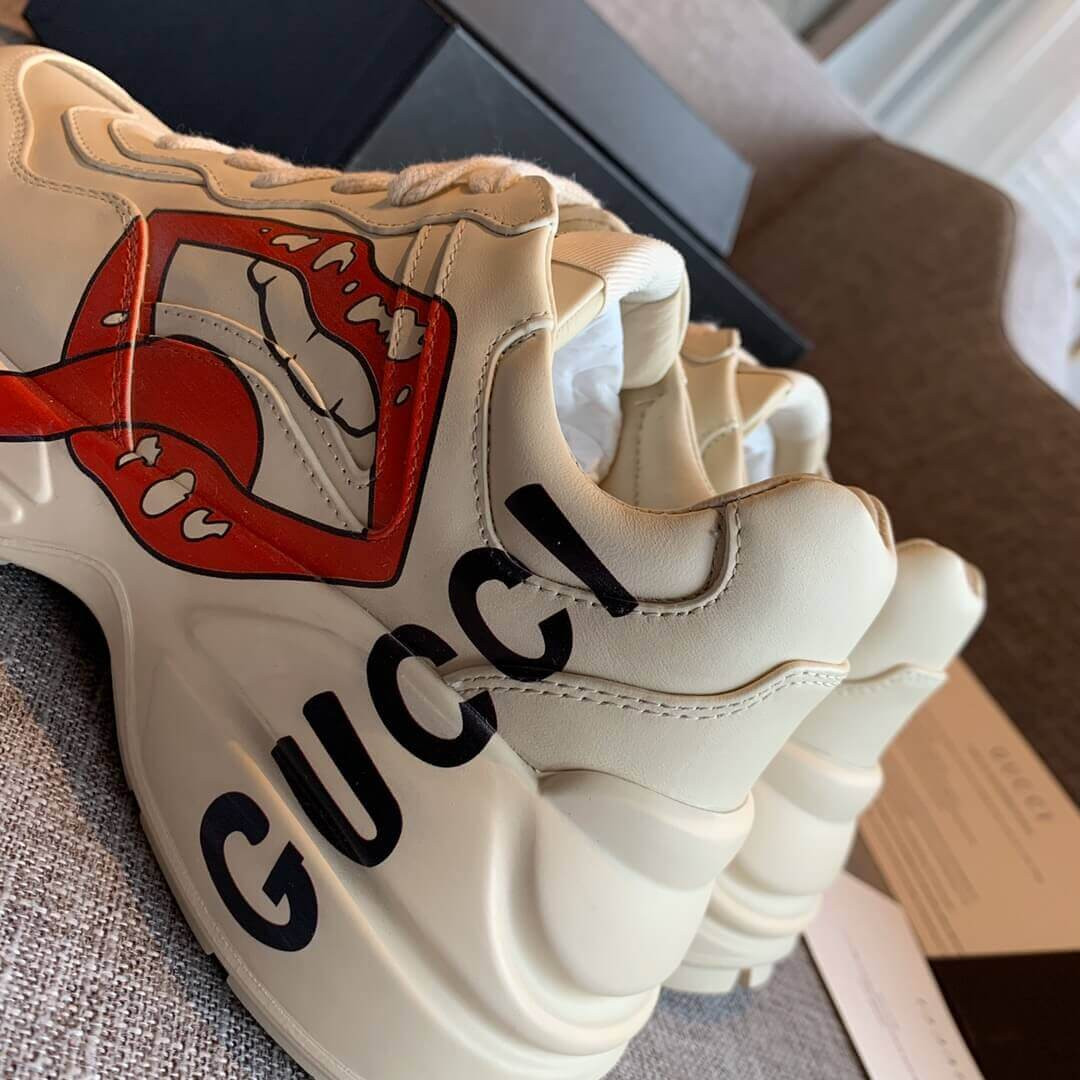 For Cruise 2019, Gucci staged a rave among the ancient graves of Alyscamps' Roman necropolis, in Arles. In the decadent setting,models walked a runway divided by flames, playing rock stars with looks that brought back ‘80s glam mainstays: thick makeup, spikes, laced-up leather, narrow denim and daring animal prints. The sneaker speaks to an era of metal in a distinctly Gucci way, with a rock band inspired print. Designed with a thick sole and chunky construction in distressed leather.