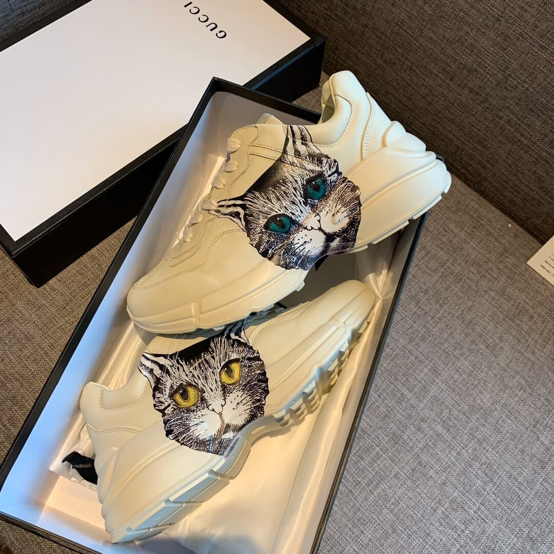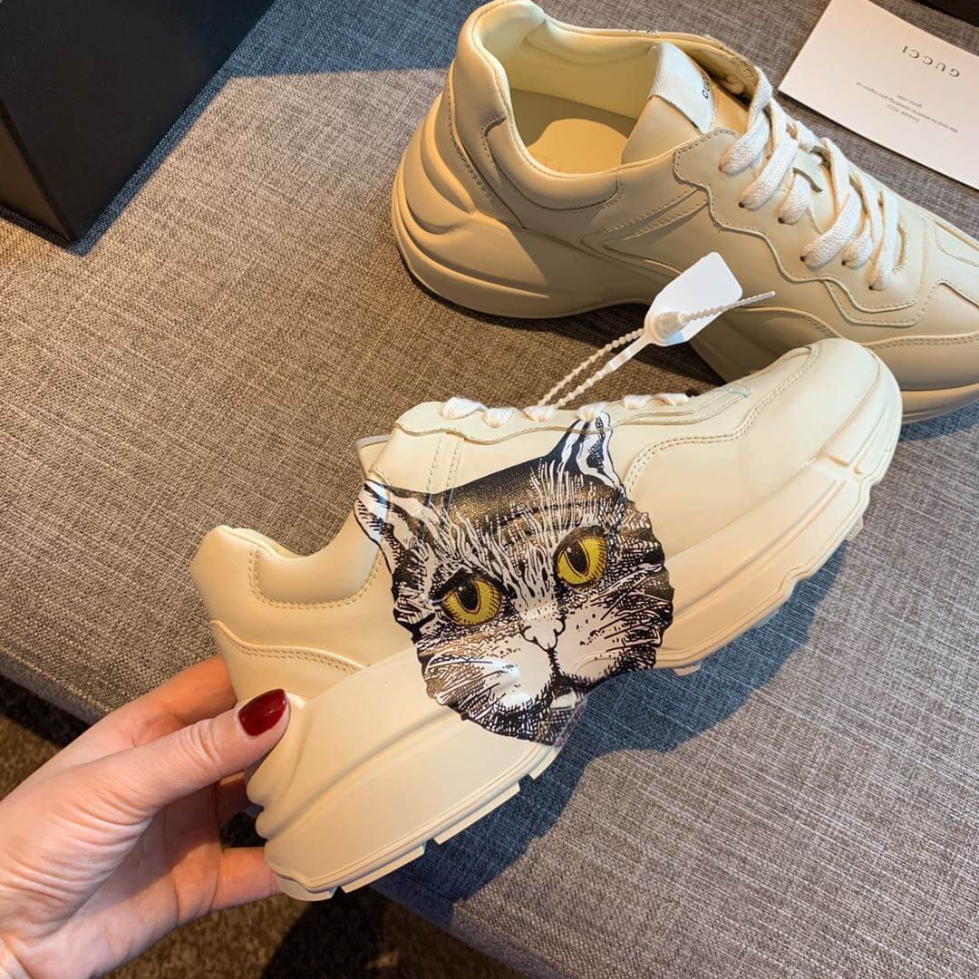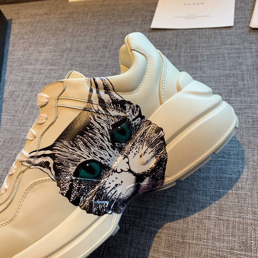 Crafted in white leather, the Rhyton sneaker features the Mystic Cat print – a motif first introduced in Cruise 2018 – influencedby vintage postcards. Designed with a thick sole and bulky construction, the sneaker continues to embody the '90s influencepervading Gucci's collections.