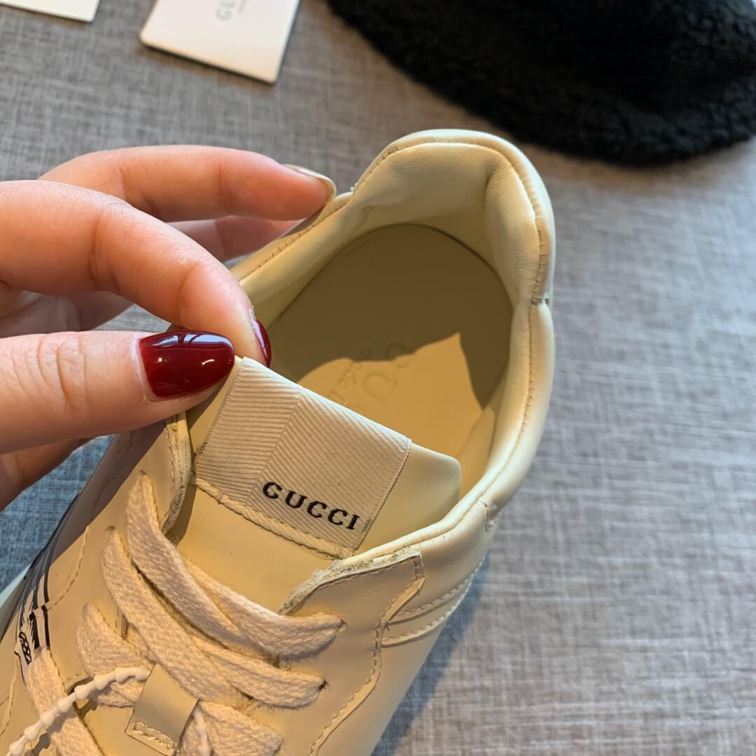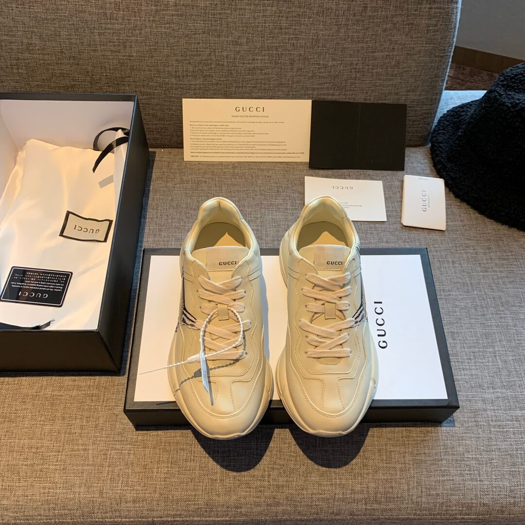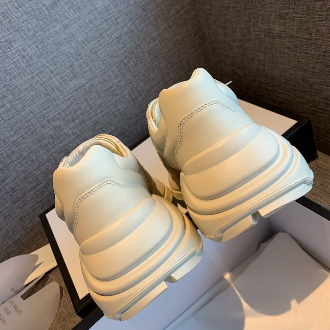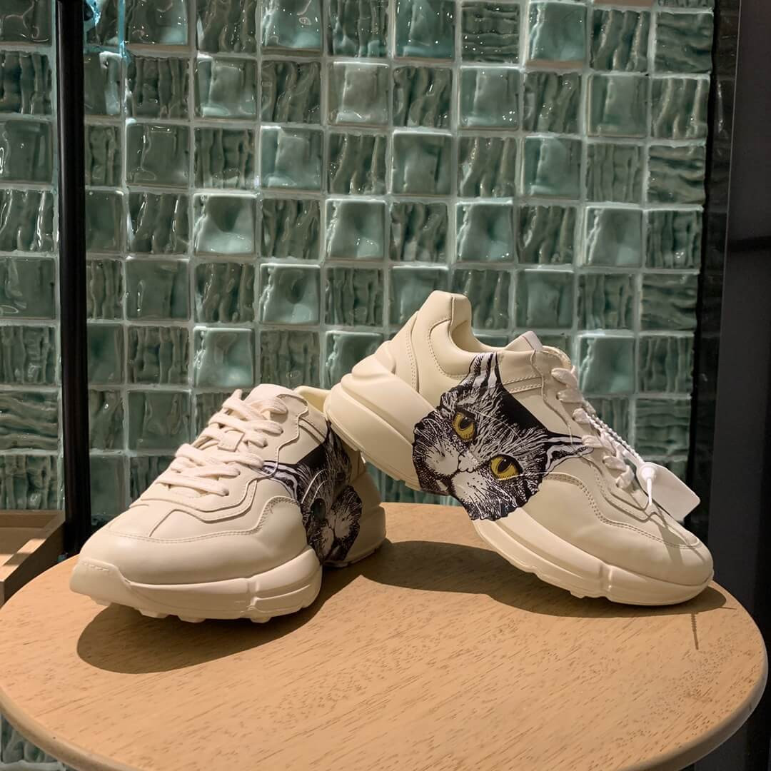 Crafted in white leather, the Rhyton sneaker features the Mystic Cat print – a motif first introduced in Cruise 2018 – influencedby vintage postcards. Designed with a thick sole and bulky construction, the sneaker continues to embody the '90s influencepervading Gucci's collections.