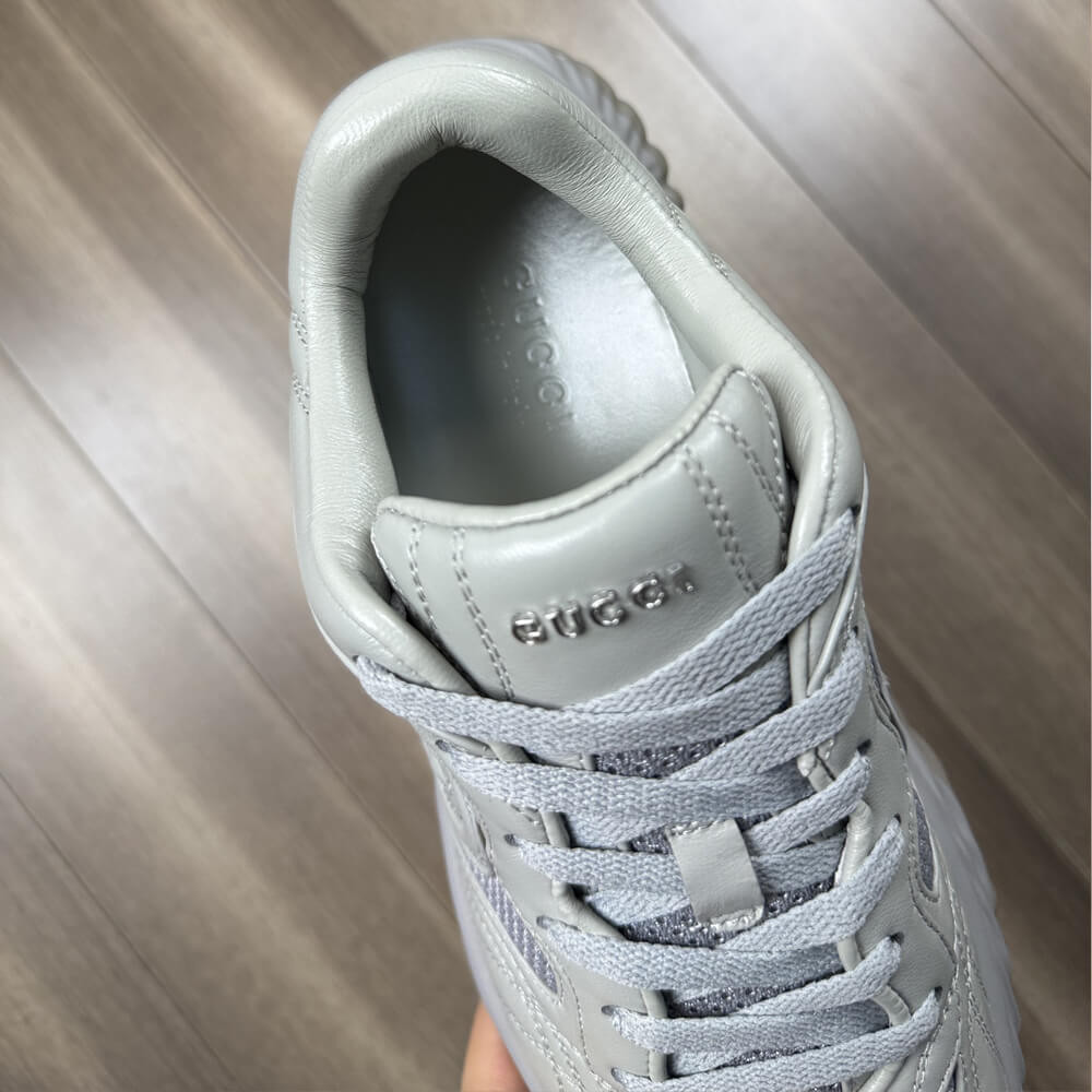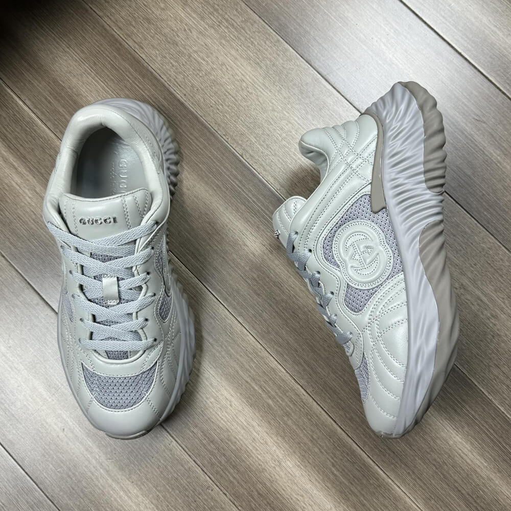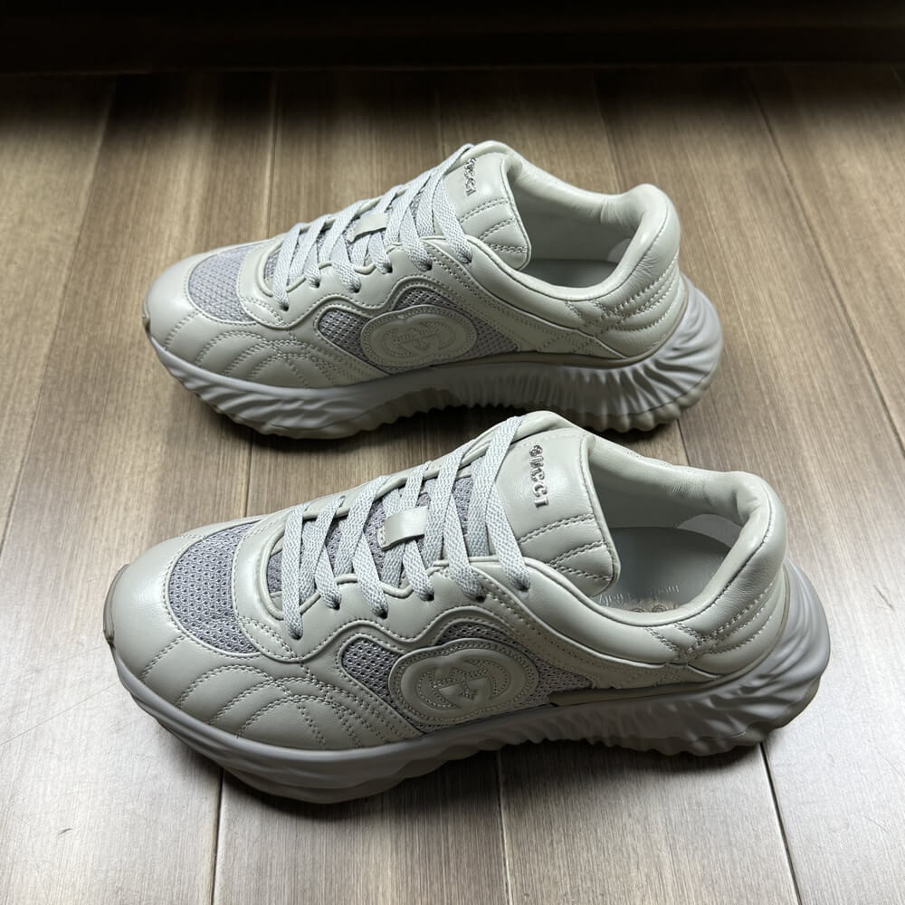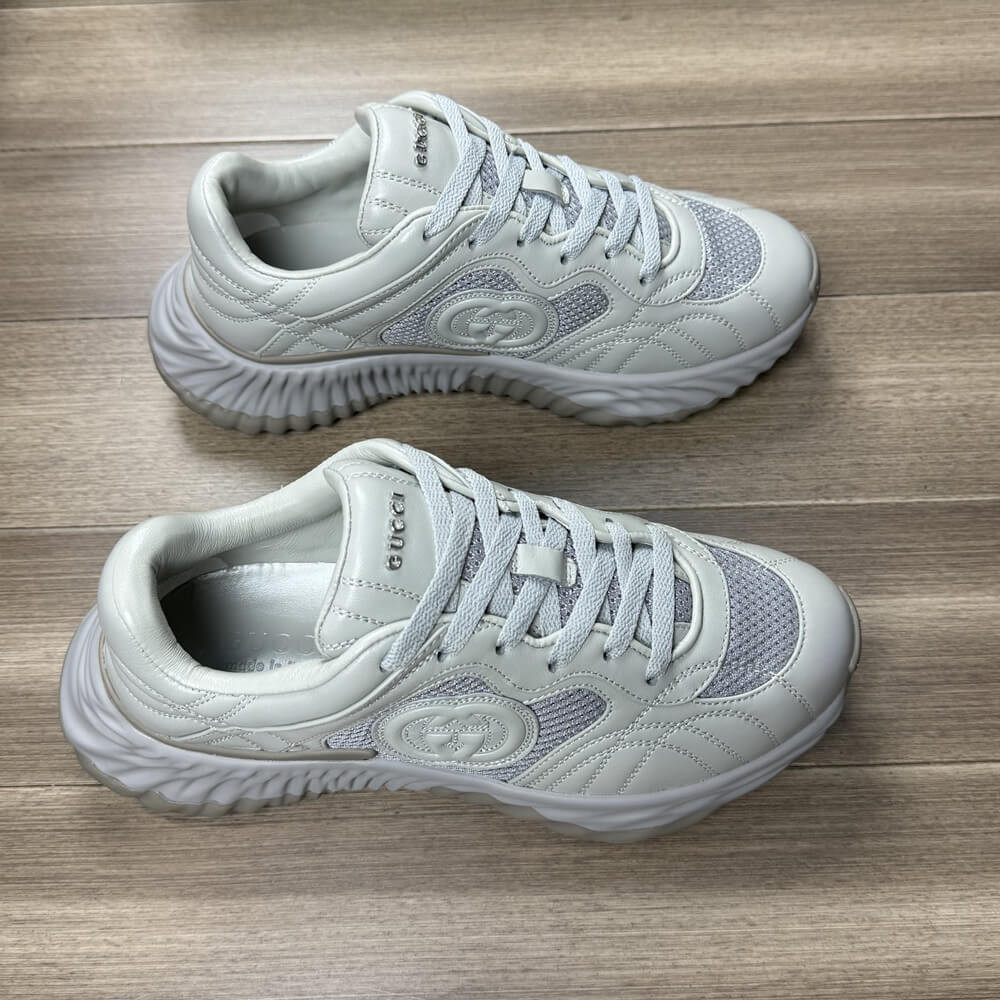 The Gucci Ripple sneaker features innovative stitching techniques which emulate the fluidity of water. The leather design is complete with three-dimensional elements which flow from the upper to the outsole, such as an Interlocking G leather patch with a 3D effect and a Gucci lettering metal hardware.