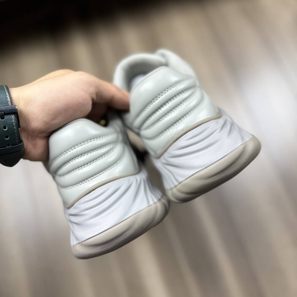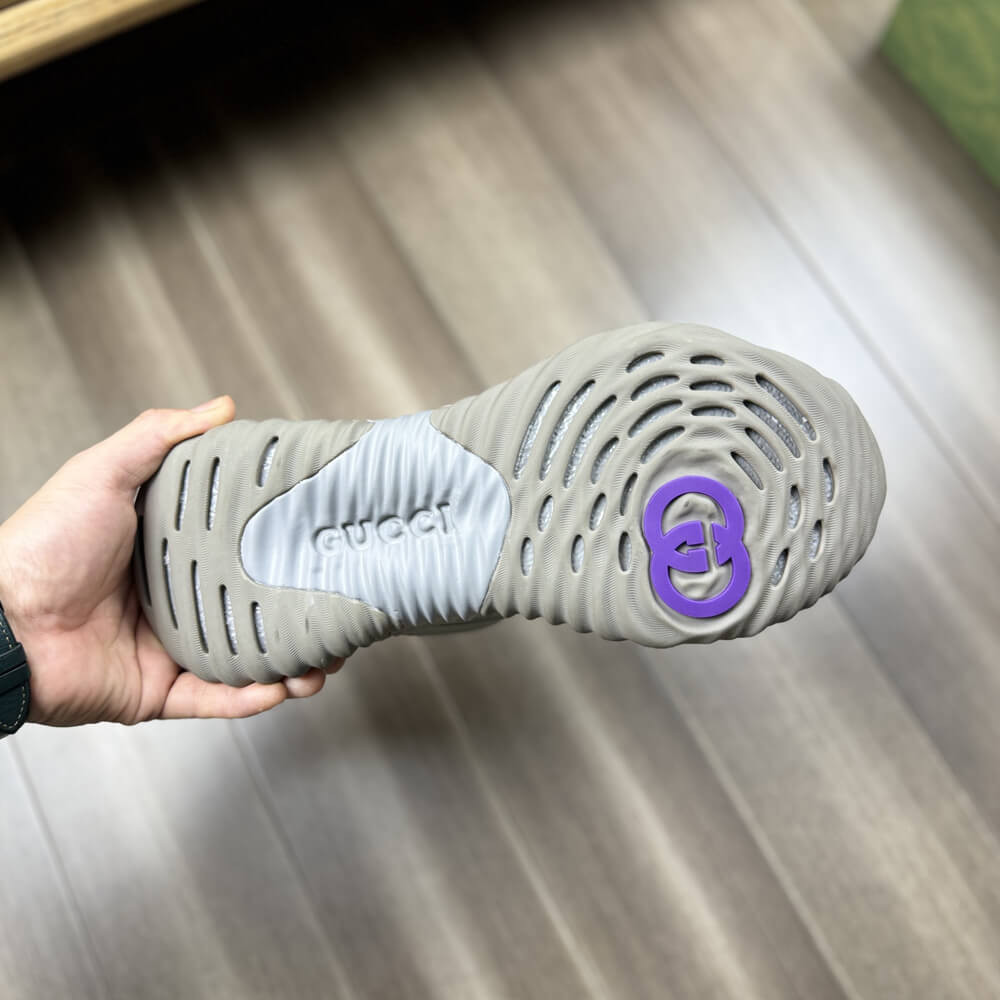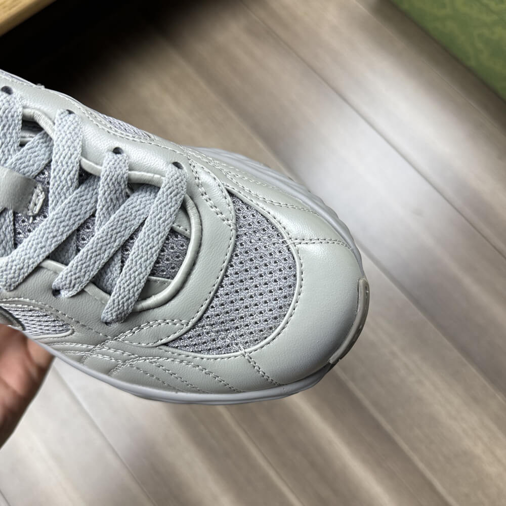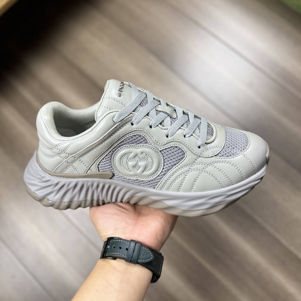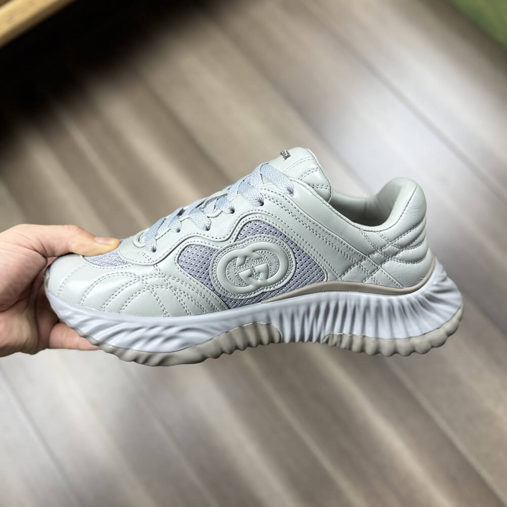 The Gucci Ripple sneaker features innovative stitching techniques which emulate the fluidity of water. The leather design is complete with three-dimensional elements which flow from the upper to the outsole, such as an Interlocking G leather patch with a 3D effect and a Gucci lettering metal hardware.