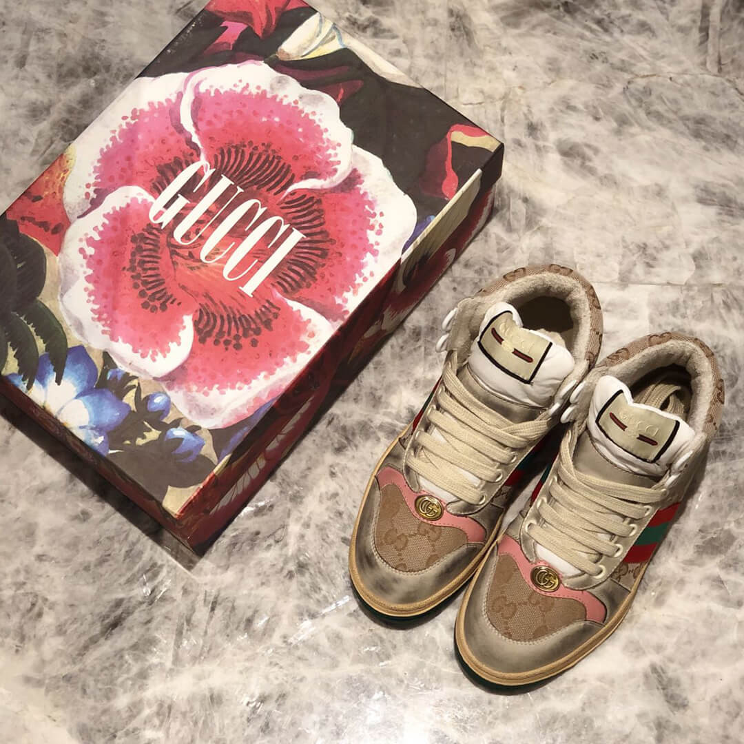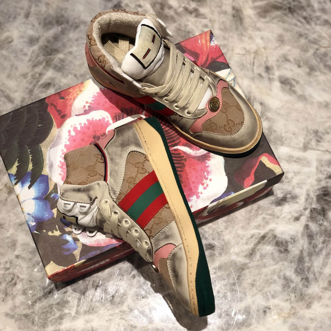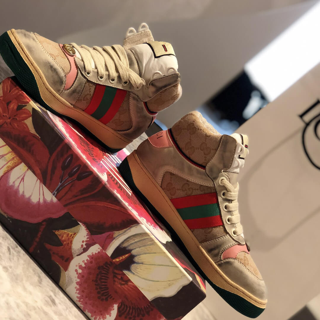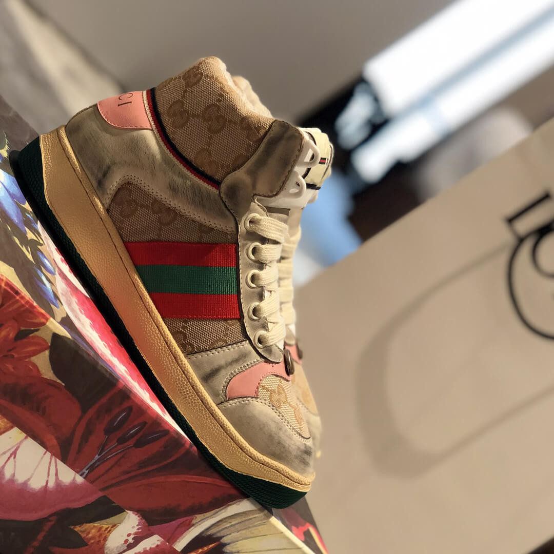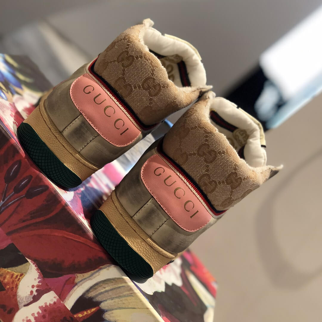 The Spring Summer 2019 collection continues to reference old school shapes and materials inspired by vintage sportswear. Influenced by classic trainers from the '70s, and named for the defensive sports move, these high-top sneakers in GG canvas feature the Web stripe on the side and vintage Gucci logo, treated for an allover distressed effect.