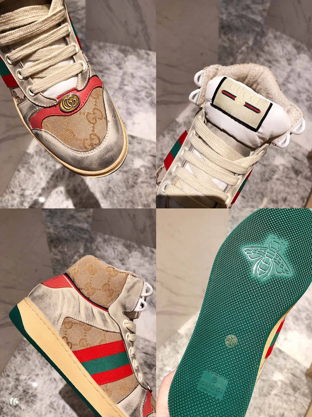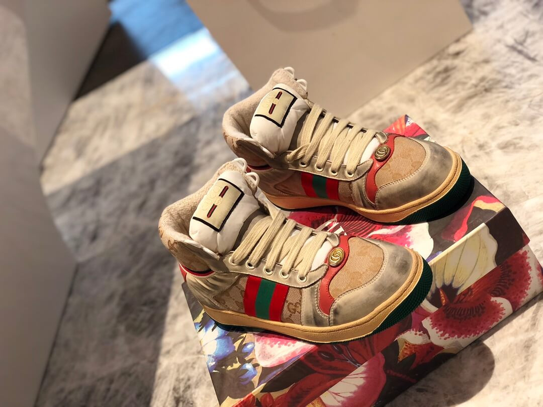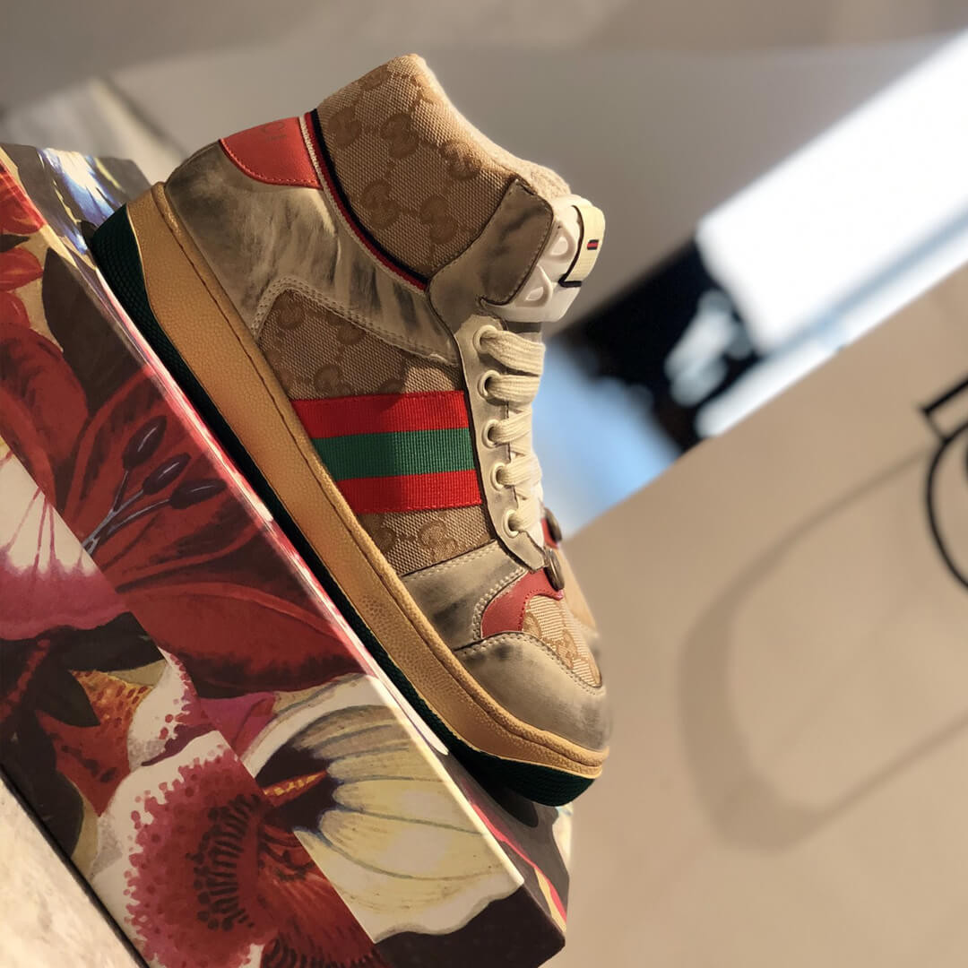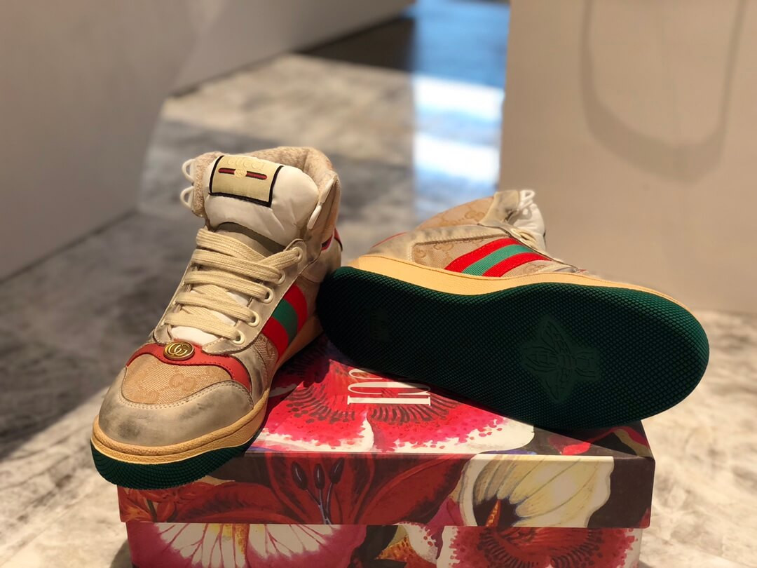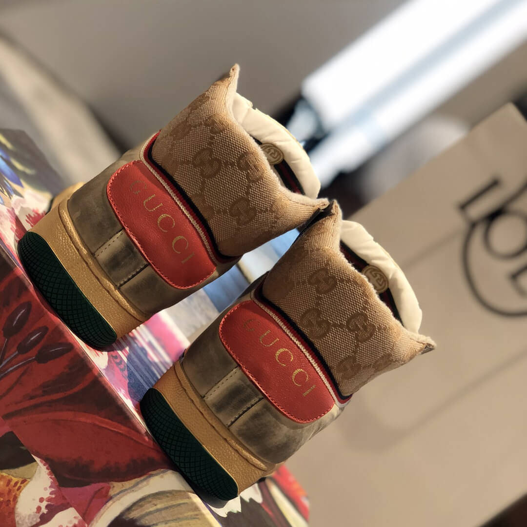 The Spring Summer 2019 collection continues to reference old school shapes and materials inspired by vintage sportswear. Influenced by classic trainers from the '70s, and named for the defensive sports move, these high-top sneakers in GG canvas feature the Web stripe on the side and vintage Gucci logo, treated for an allover distressed effect.