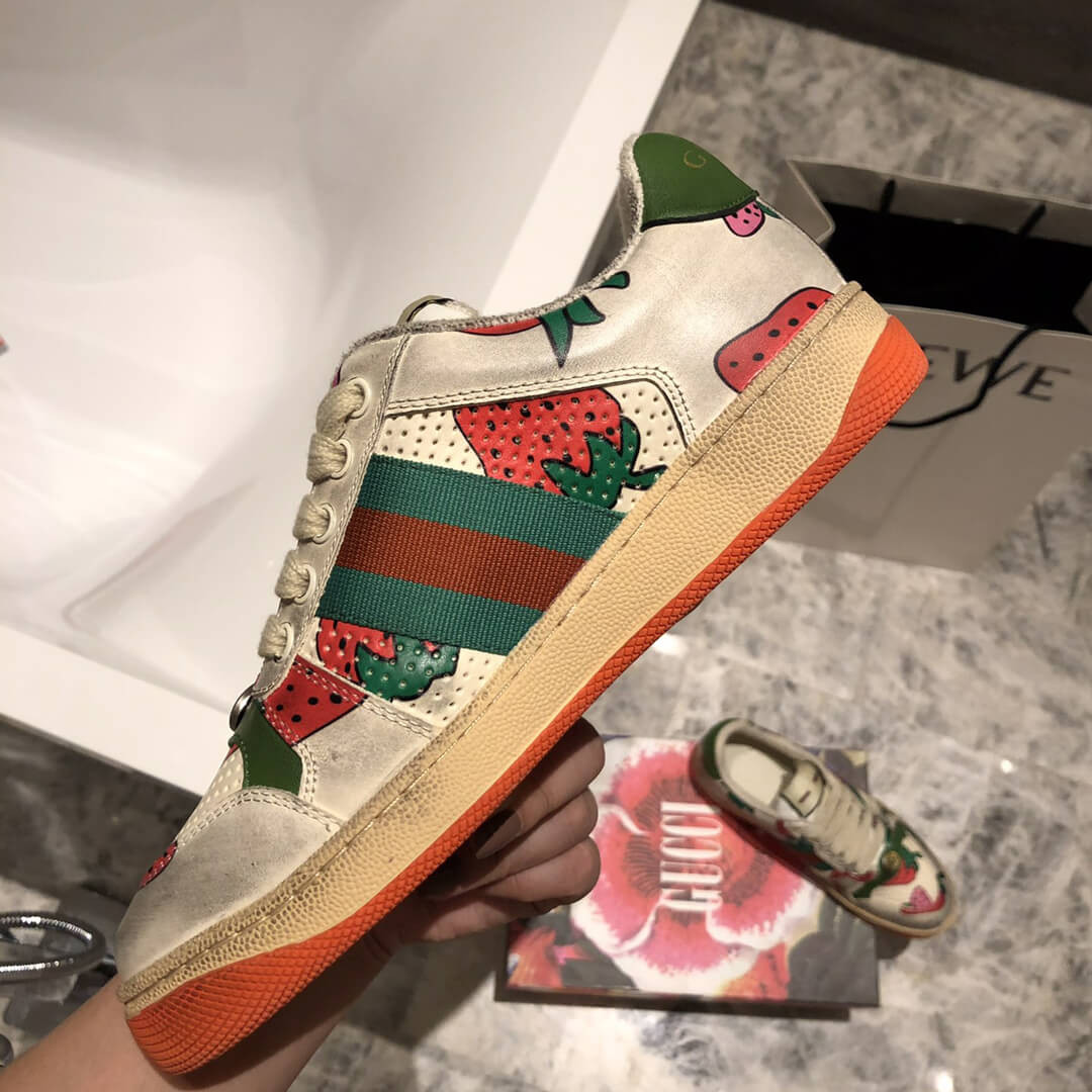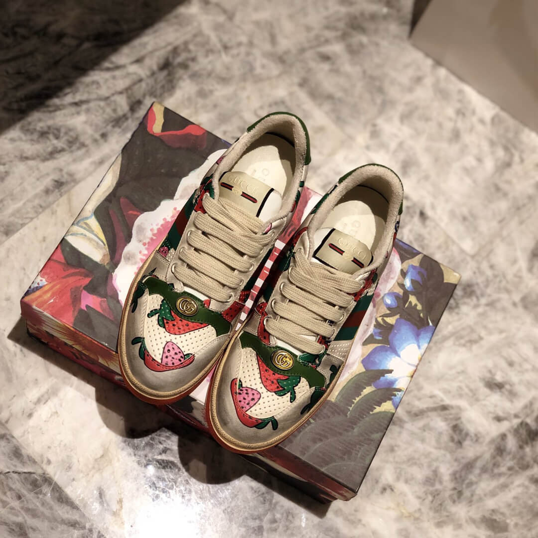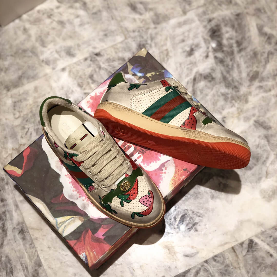 Influenced by classic trainers from the '70s, the Screener sneakers—named for the defensive sports move—feature the Web stripe on the side and vintage Gucci logo, treated for an allover distressed effect. A pastiche of different influences that span across decades, the Pre-Fall 2019 collection continues to reference old school shapes and materials inspired by vintage sportswear.