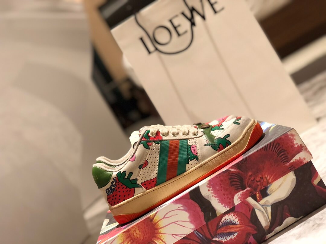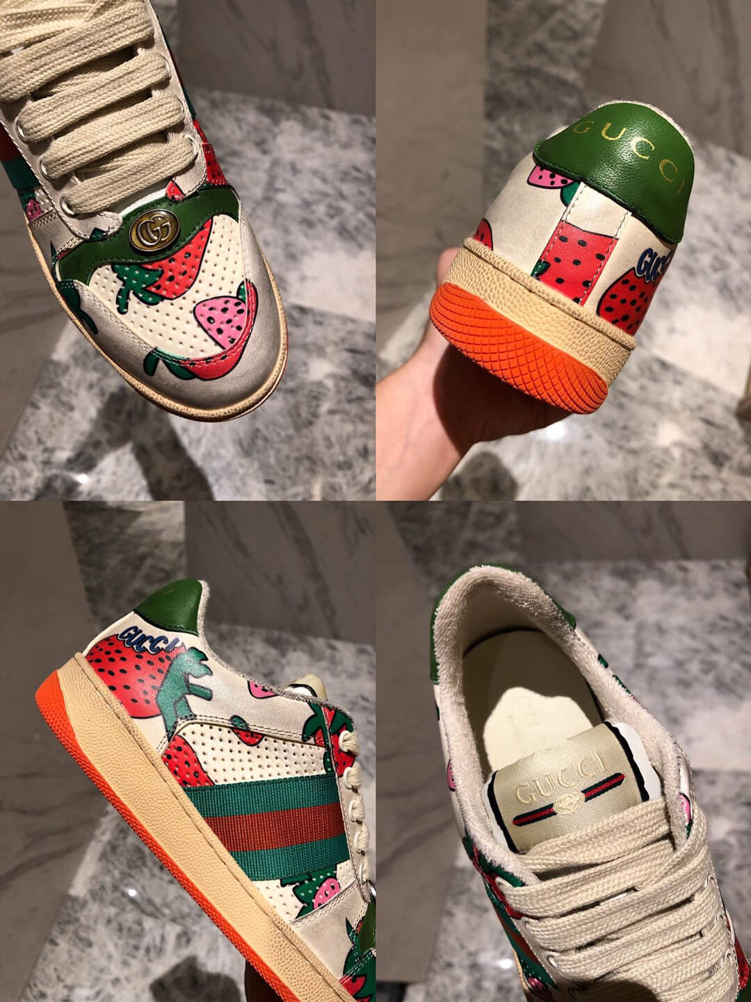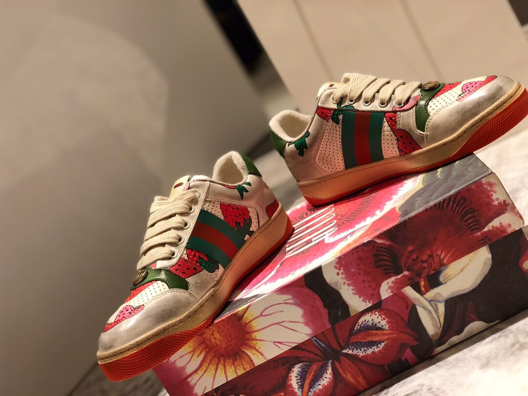 Influenced by classic trainers from the '70s, the Screener sneakers—named for the defensive sports move—feature the Web stripe on the side and vintage Gucci logo, treated for an allover distressed effect. A pastiche of different influences that span across decades, the Pre-Fall 2019 collection continues to reference old school shapes and materials inspired by vintage sportswear.