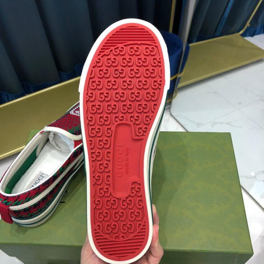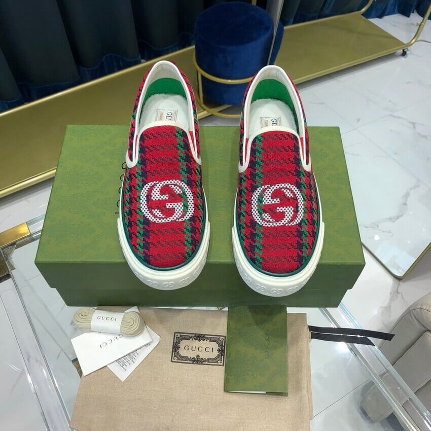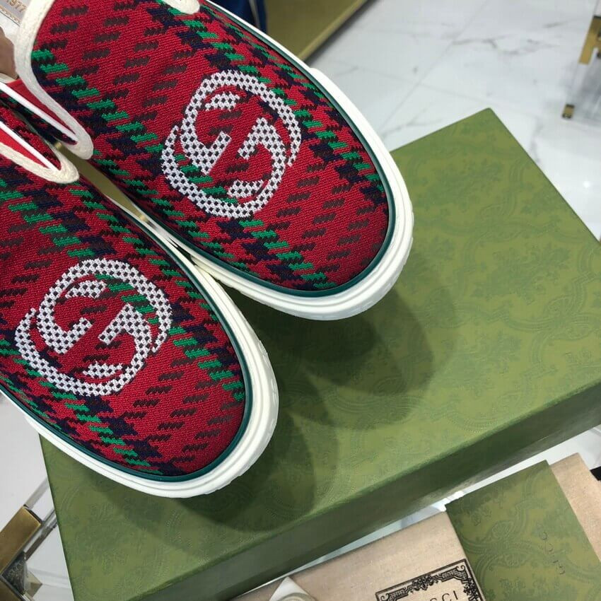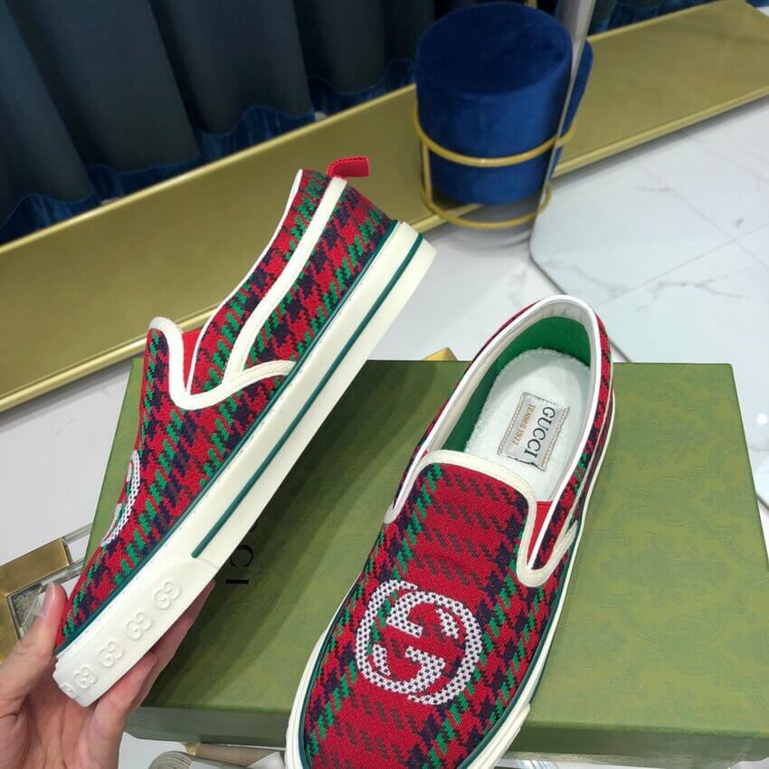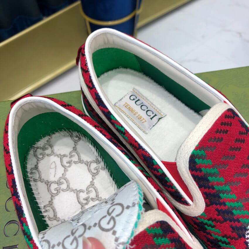 A slip-on sneaker in red and green houndstooth wool with an Interlocking G on the front. The style combines different elements from the House's heritage such as the Gucci Tennis 1977 label, a textured GG motif at the sole and the House Web—details which recall the House's connection to the world of sports and leisure.