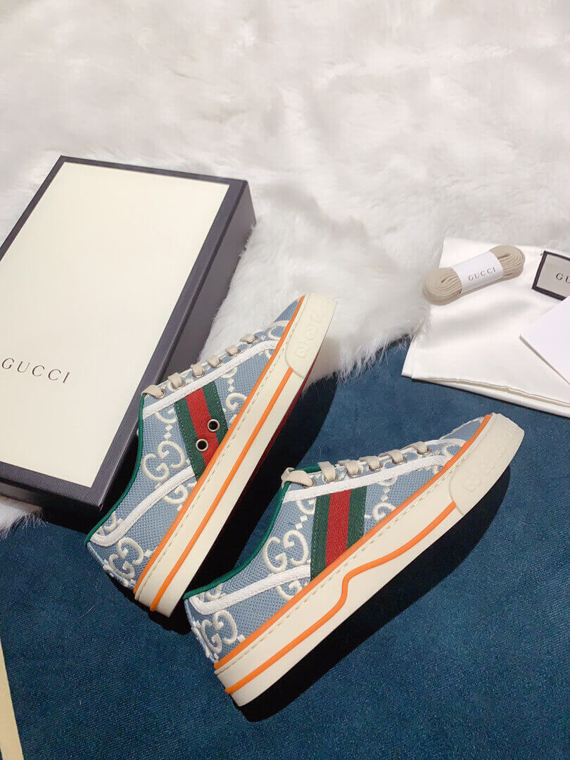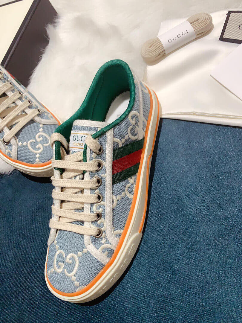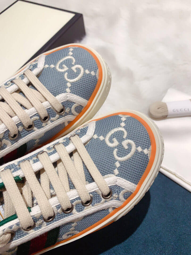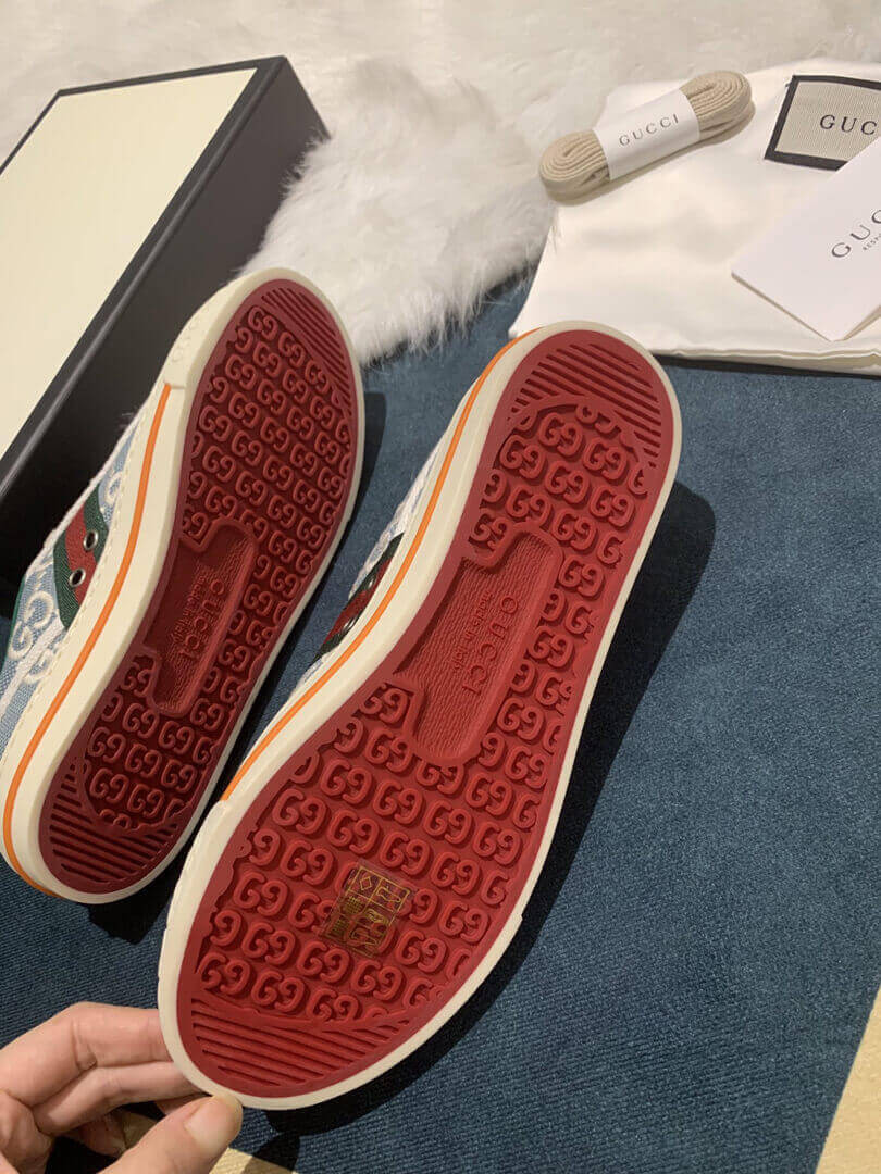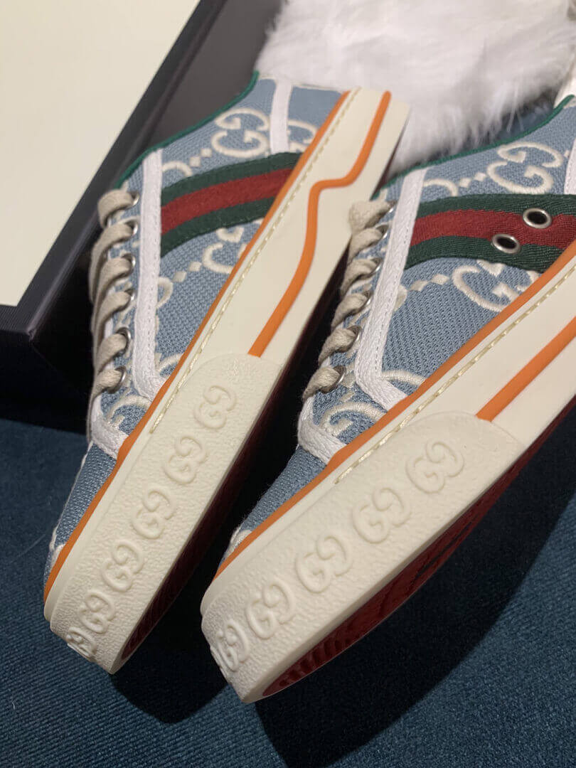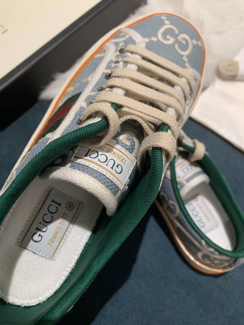 A low-top sneaker in off-white cotton. The style combines different elements from the House'sheritage such as the Gucci Tennis 1977 label, a textured GG motif at the sole and the House Web—details which recall the House's connection to the world of sports and leisure.