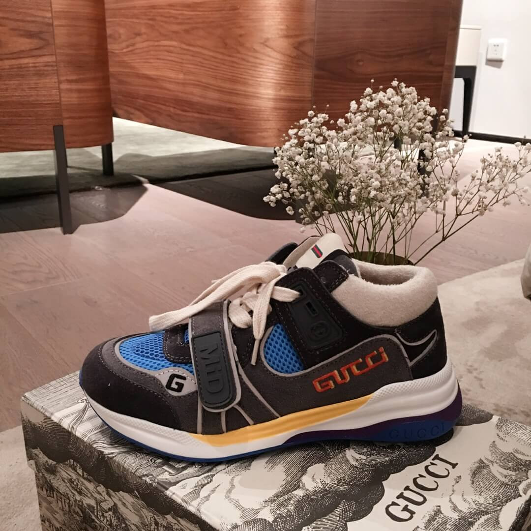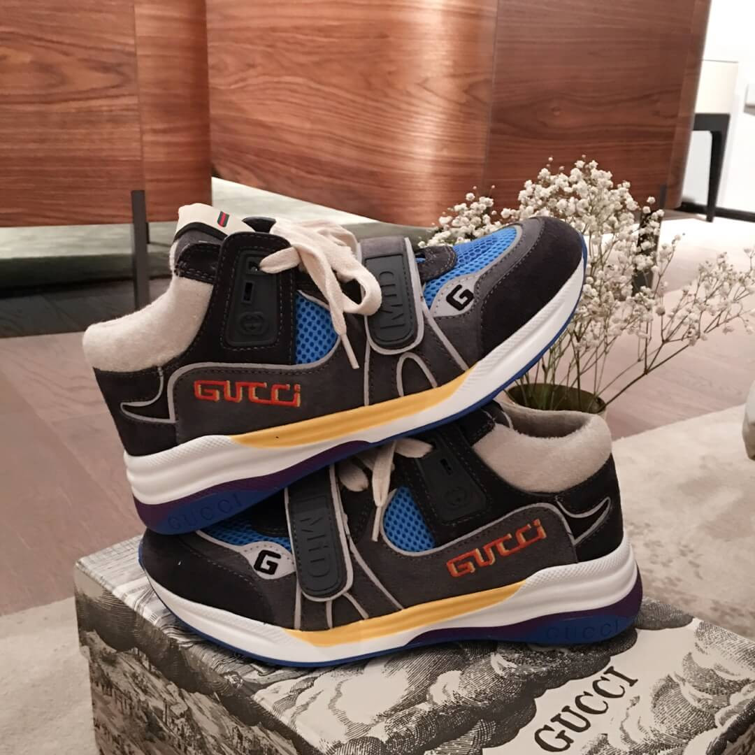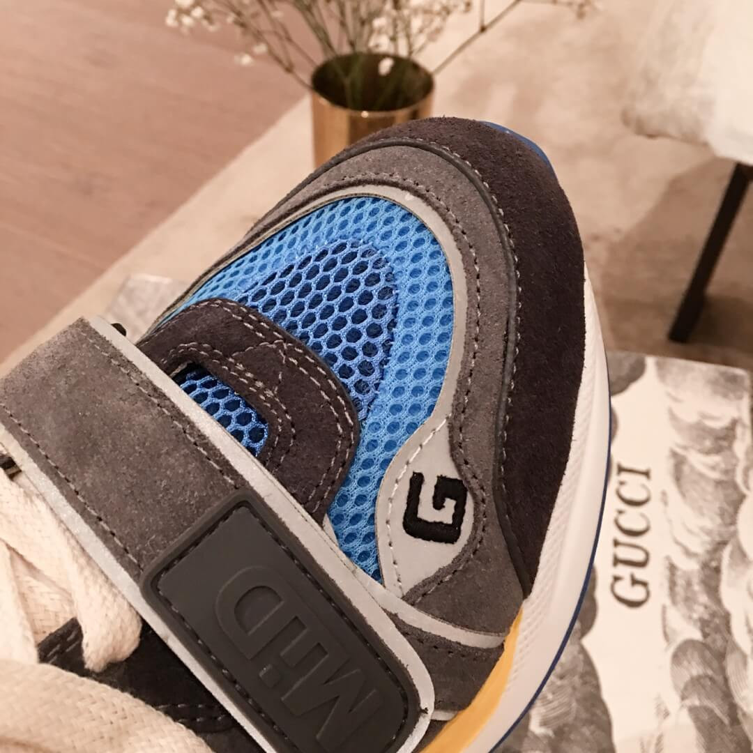 Constructed in a diverse mix of suede and fabrics, this women's sneaker borrows inspirationfrom the classic running shoe. The shoe blends different colored suede, reflective fabric and mesh trims and has a distressed effect for a vintage appeal. Various House details further enrich the sports influenced shape, with embroidered Gucci and G, Interlocking G rubber detail and Gucci vintage logo label. The style is finished with a terry cloth lining.
