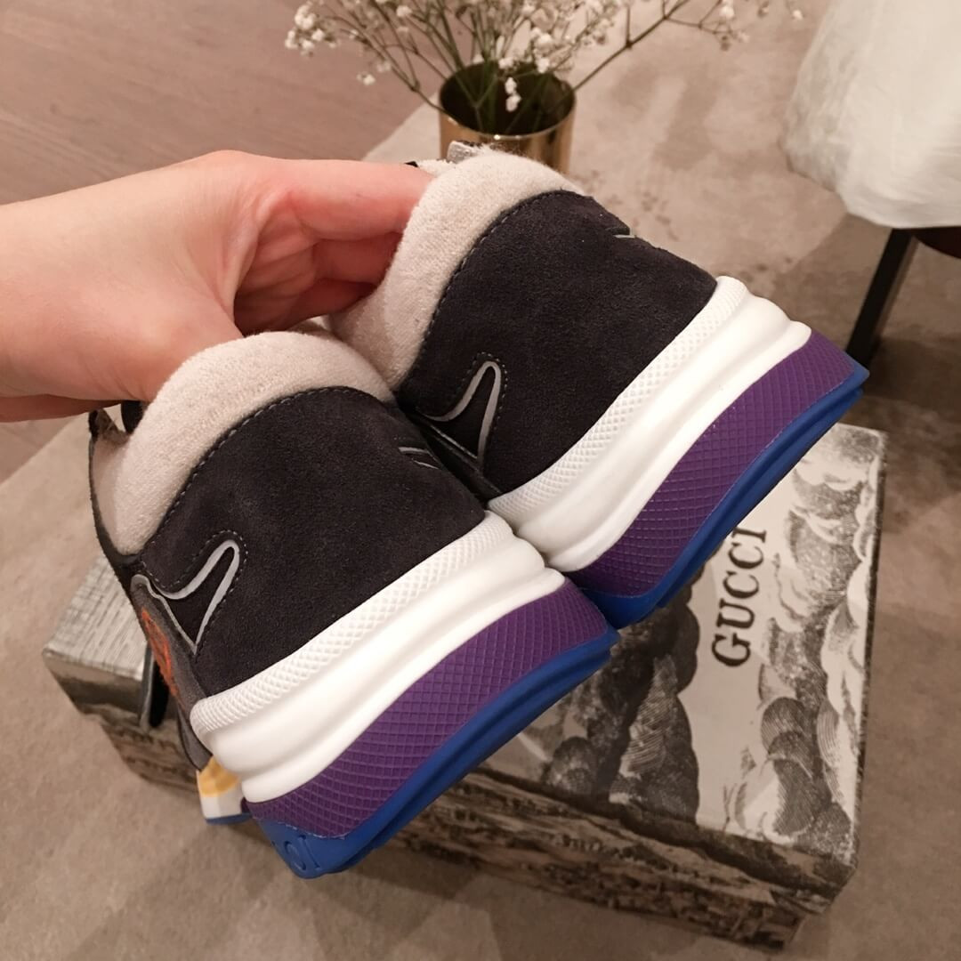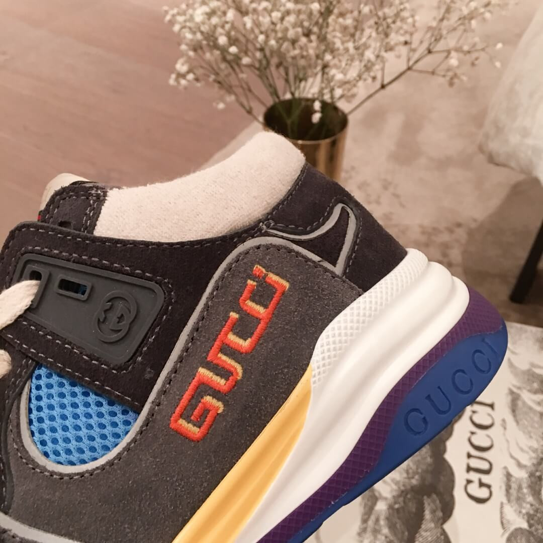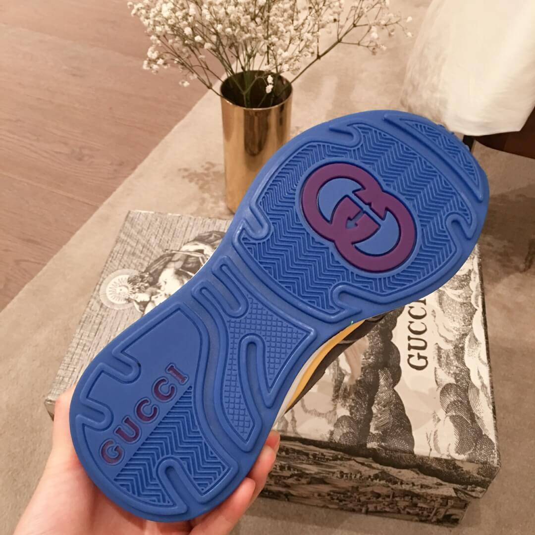 Constructed in a diverse mix of suede and fabrics, this women's sneaker borrows inspirationfrom the classic running shoe. The shoe blends different colored suede, reflective fabric and mesh trims and has a distressed effect for a vintage appeal. Various House details further enrich the sports influenced shape, with embroidered Gucci and G, Interlocking G rubber detail and Gucci vintage logo label. The style is finished with a terry cloth lining.