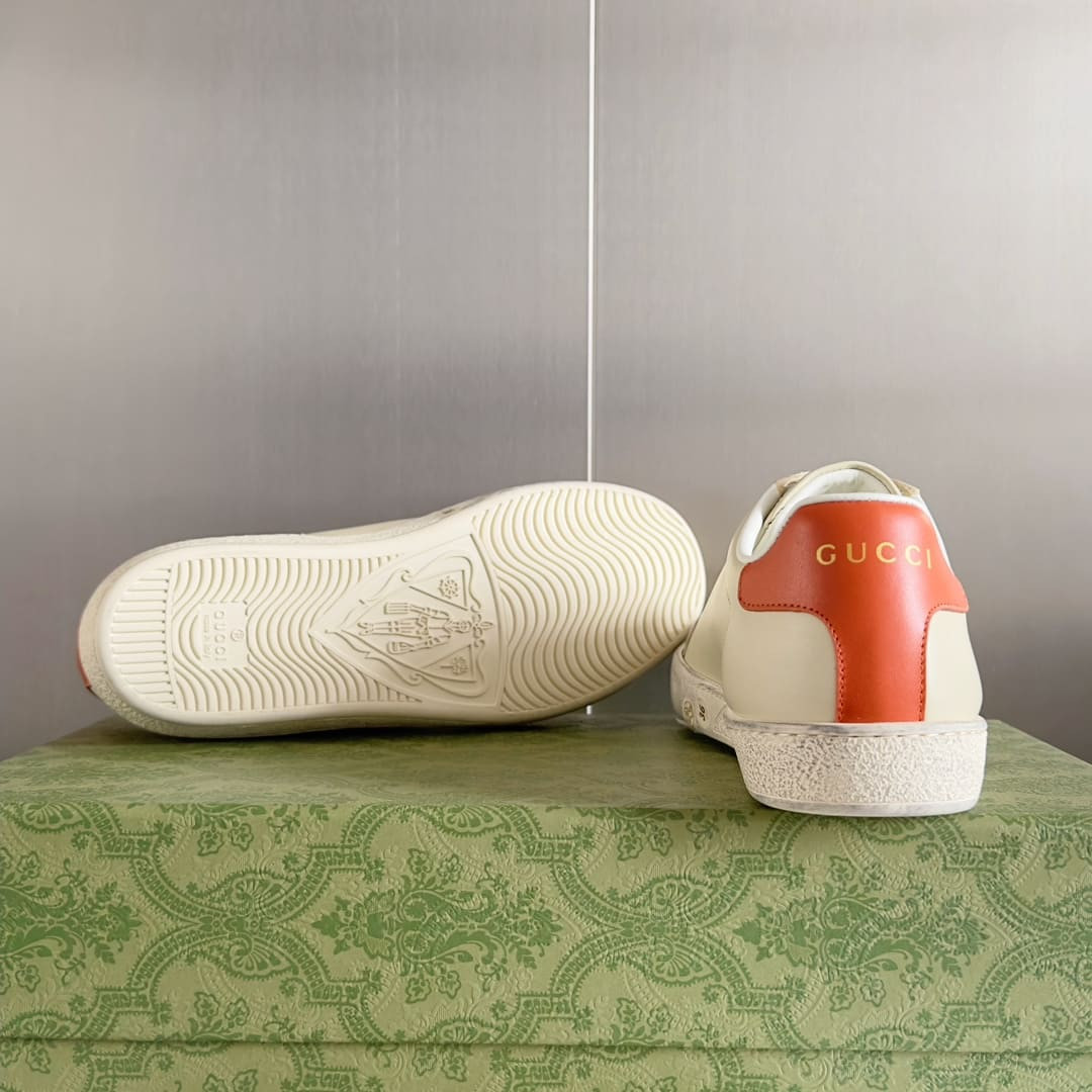These stylish sneakers are crafted of ivory calfskin leather, with Disney's Mickey Mouse printed on the side and an orange heel cap.