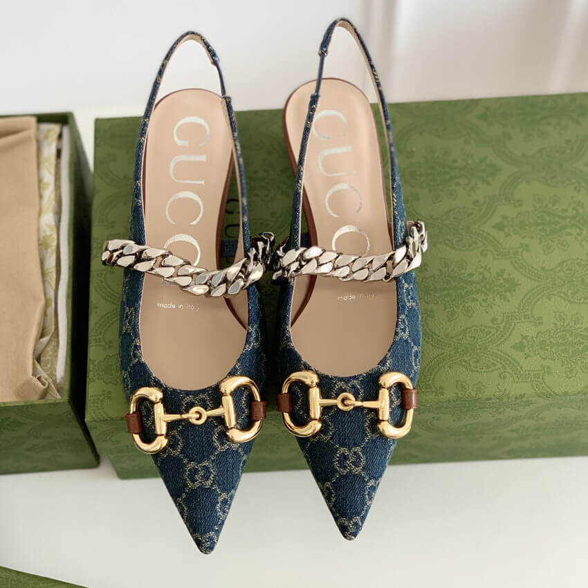 Gucci GG Horsebit Denim Low Slingback Strap Pumps