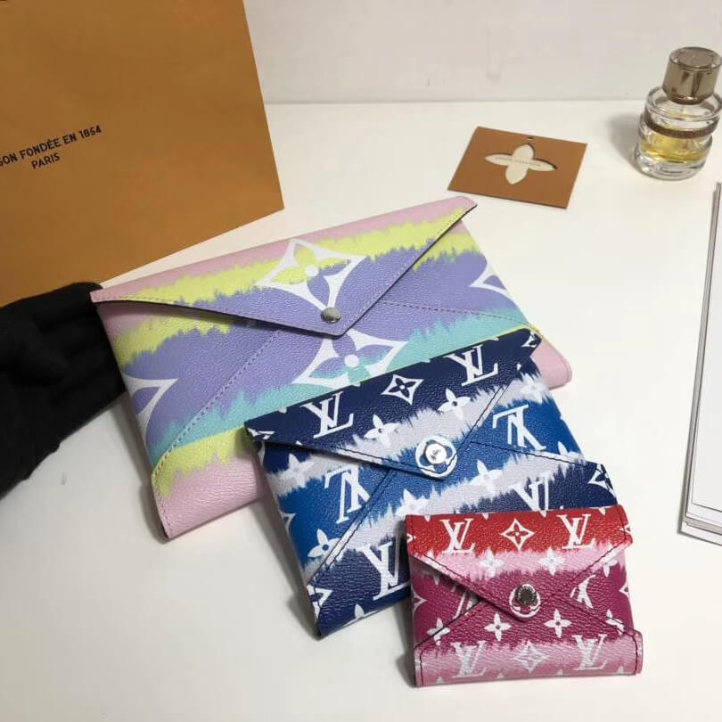 For Summer 2020, the Pochette Kirigami comes in a special edition belonging to the LV Escale collection of accessories and leather goods. The three envelope-style pouches in Monogram canvas are printed with a tie-dye effect in summer shades. The largest pouch will hold a tablet, the medium one a passport, and the small one cards.