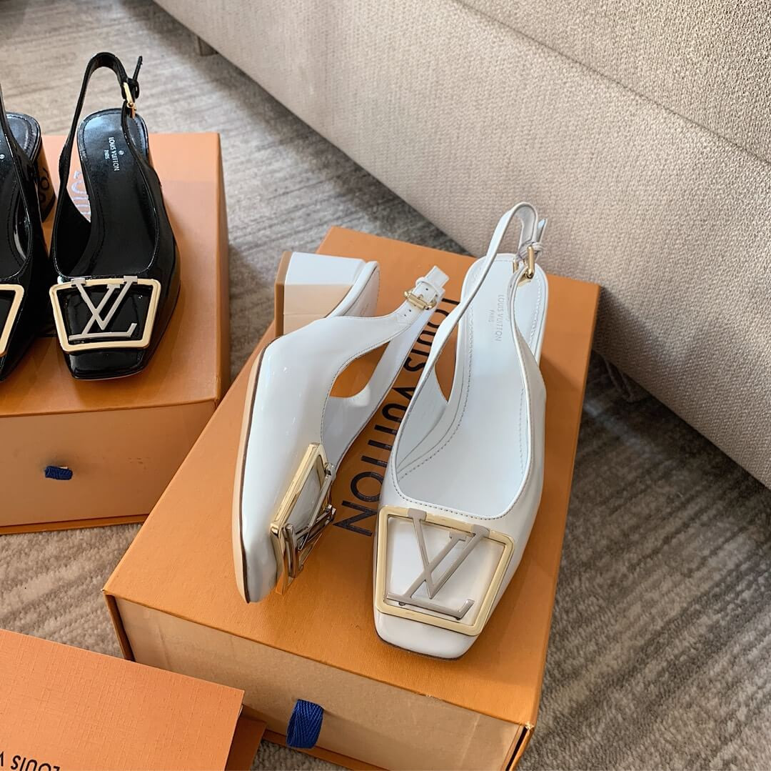 The Madeleine slingback pump in glossy patent calf leather is a reinterpretation of one of Louis Vuitton's most emblematic lines,distinguished by its square toe and low block heel. The feminine slingback, whose strap is adjusted with a tiny buckle, is complemented by a square LV Initials accessory in silver- and gold-tone metal.
