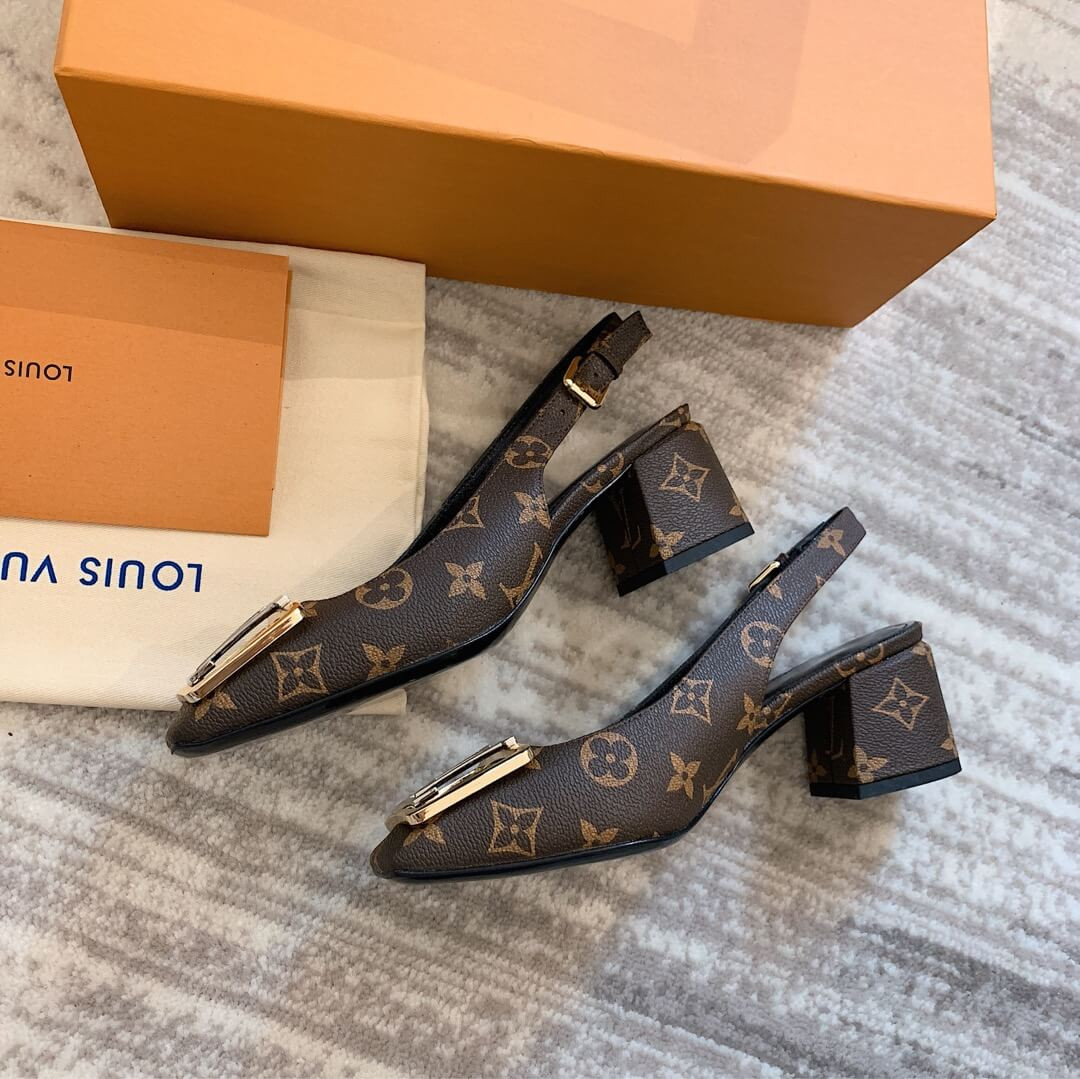 The Madeleine slingback pump in glossy patent calf leather is a reinterpretation of one of Louis Vuitton's most emblematic lines,distinguished by its square toe and low block heel. The feminine slingback, whose strap is adjusted with a tiny buckle, is complemented by a square LV Initials accessory in silver- and gold-tone metal.