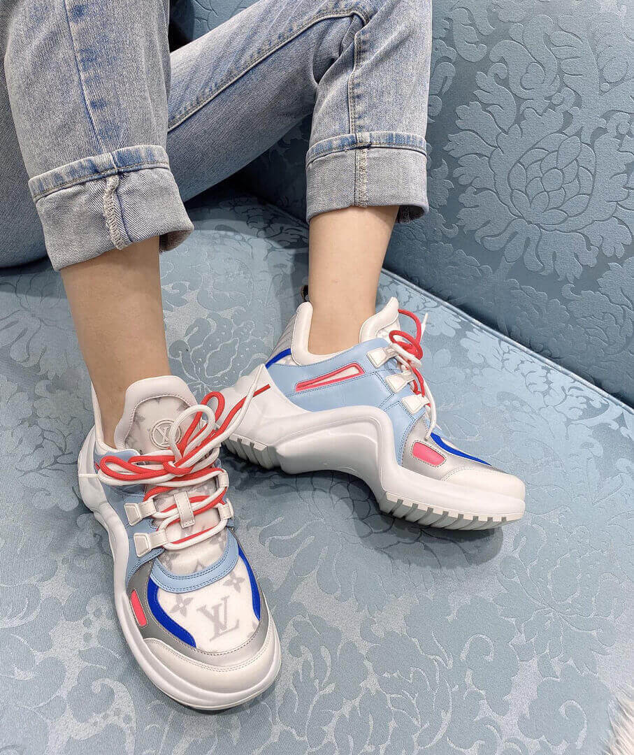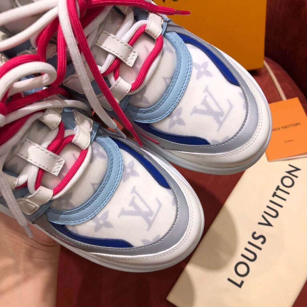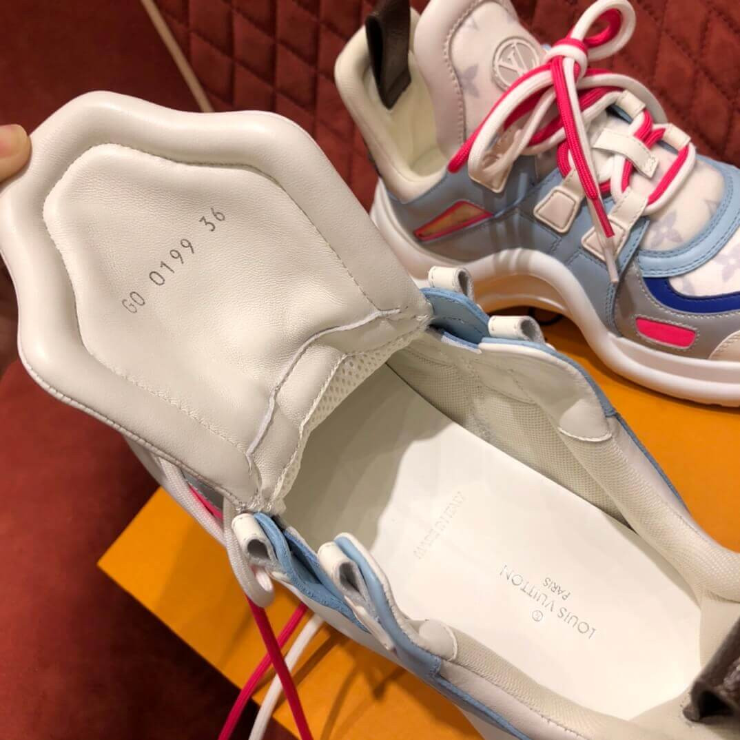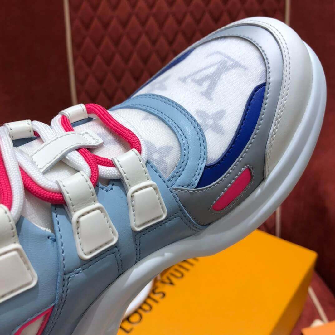 This seasonal interpretation of the iconic LV Archlight sneaker comes in leather and technical fabric with a Monogram print. Flashes of pop color complement this futuristic design, whose key features are an oversized tongue, low cut around the ankle and turbo outsole. It is finished with a back loop in Monogram canvas.