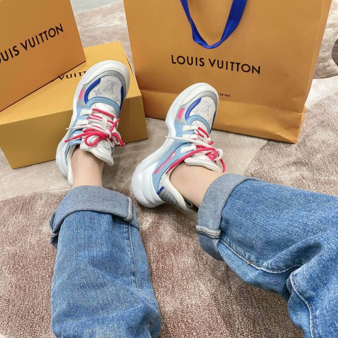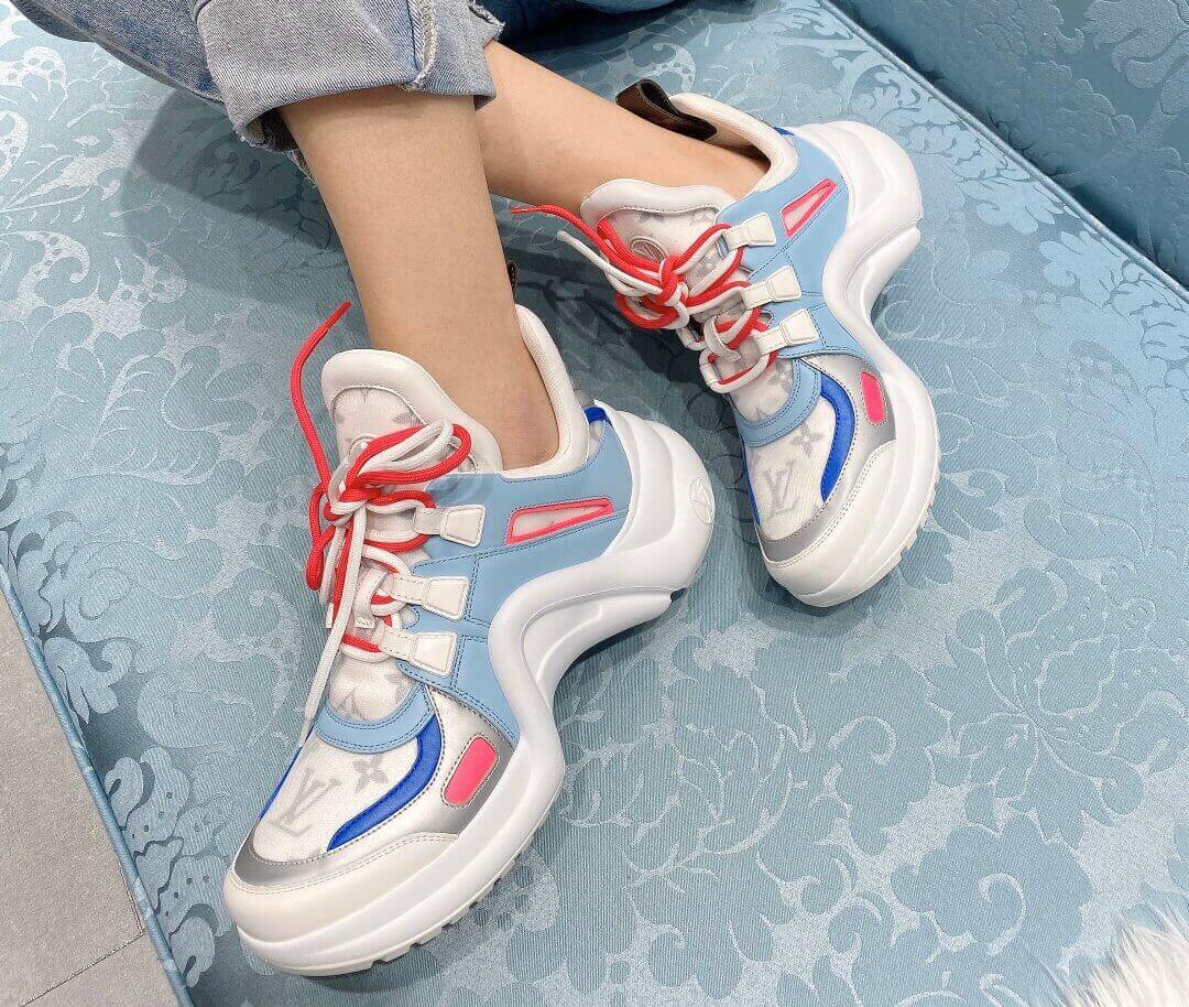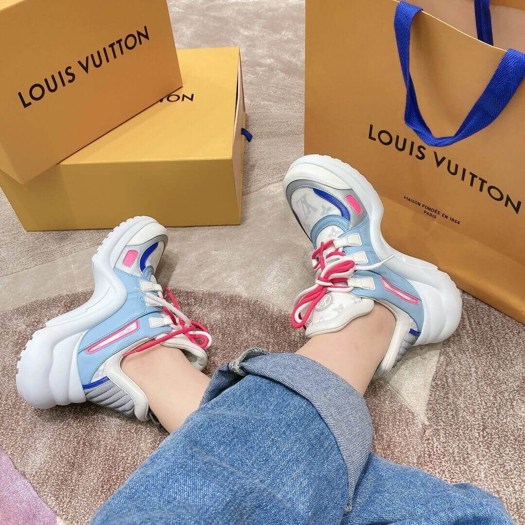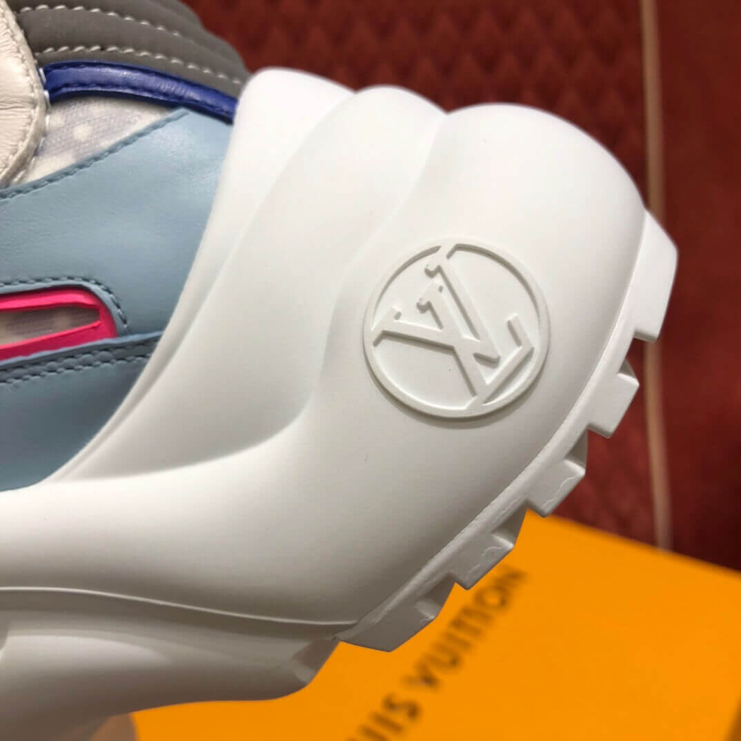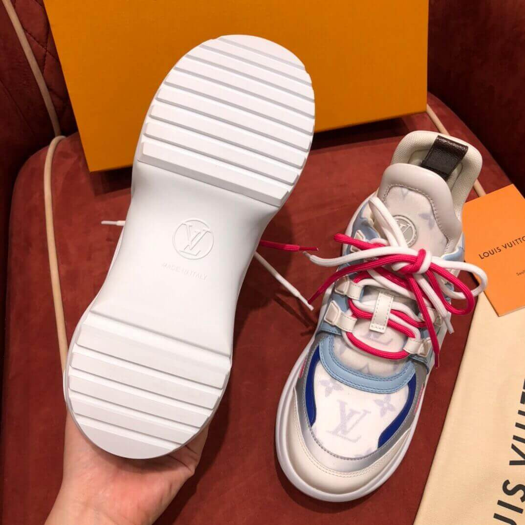 This seasonal interpretation of the iconic LV Archlight sneaker comes in leather and technical fabric with a Monogram print. Flashes of pop color complement this futuristic design, whose key features are an oversized tongue, low cut around the ankle and turbo outsole. It is finished with a back loop in Monogram canvas.