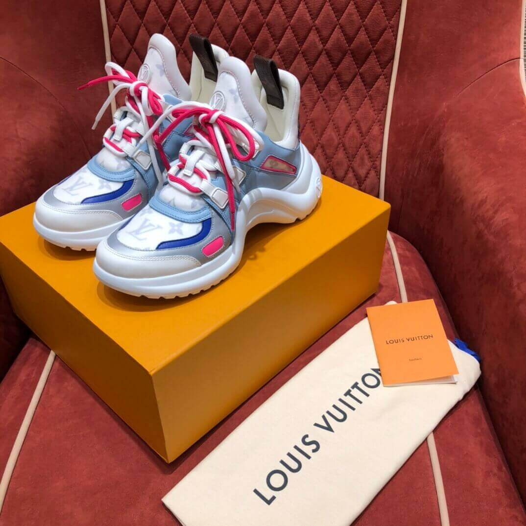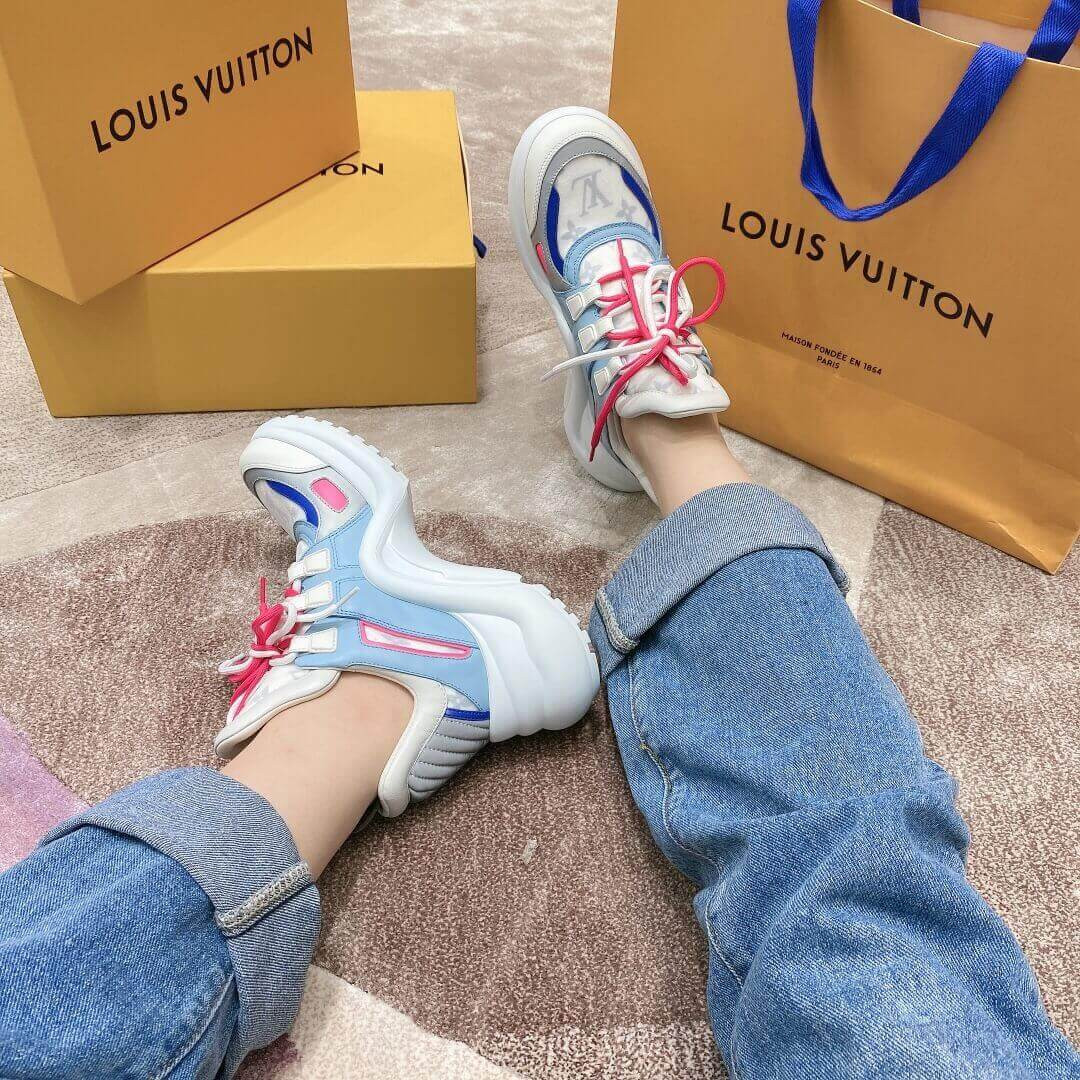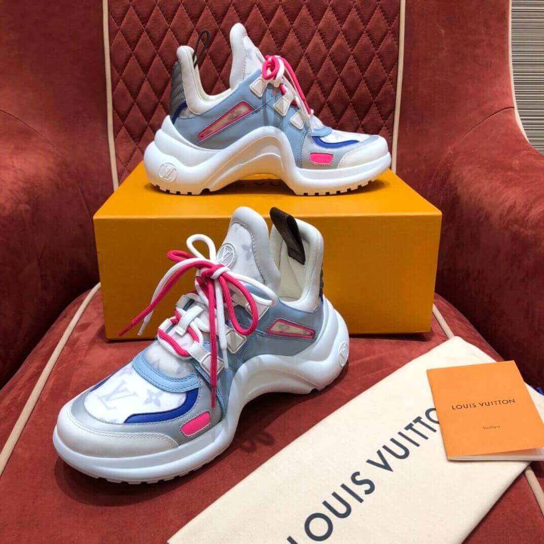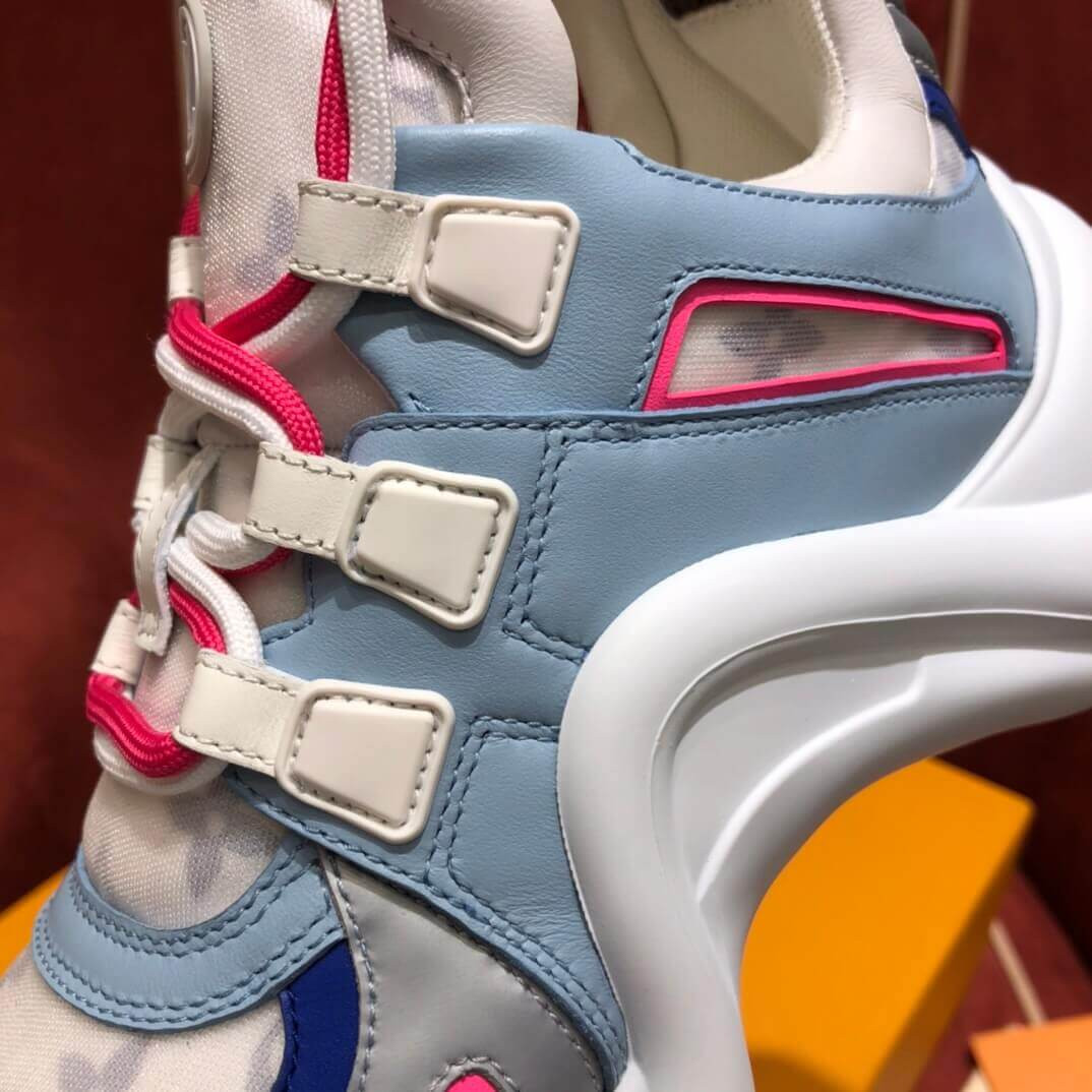 This seasonal interpretation of the iconic LV Archlight sneaker comes in leather and technical fabric with a Monogram print. Flashes of pop color complement this futuristic design, whose key features are an oversized tongue, low cut around the ankle and turbo outsole. It is finished with a back loop in Monogram canvas.