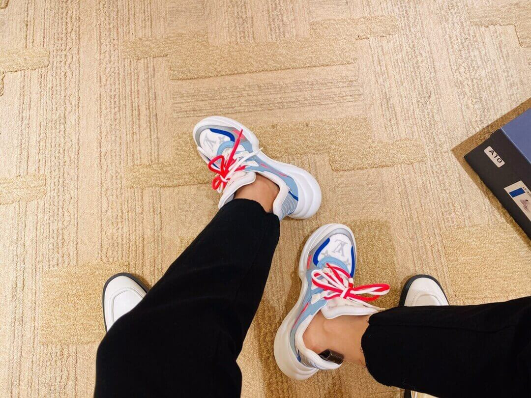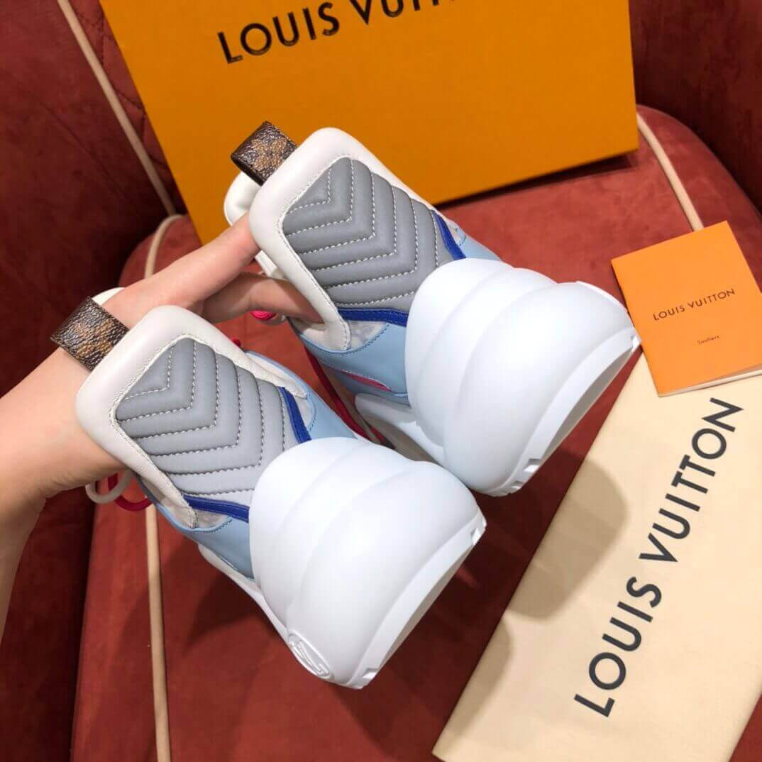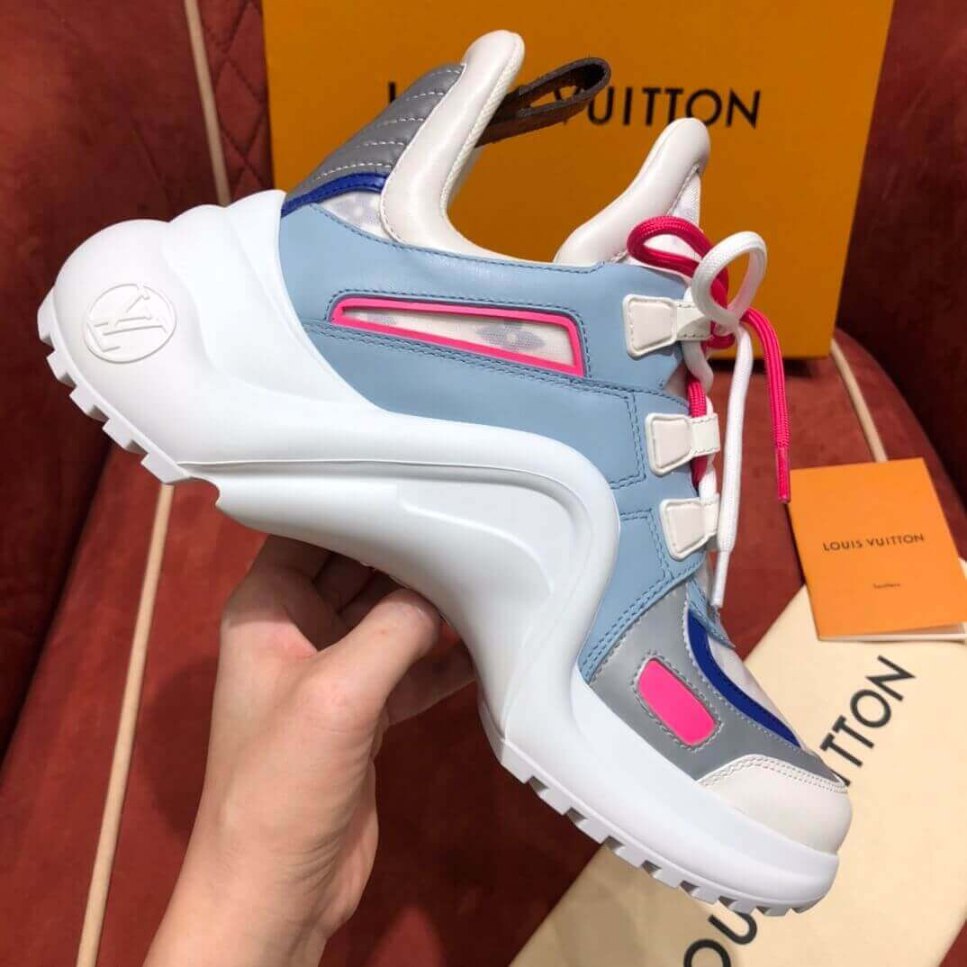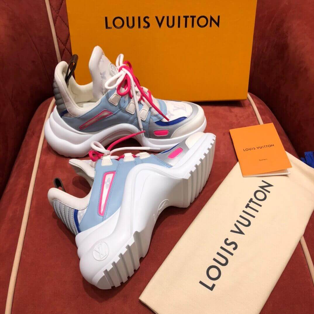 This seasonal interpretation of the iconic LV Archlight sneaker comes in leather and technical fabric with a Monogram print. Flashes of pop color complement this futuristic design, whose key features are an oversized tongue, low cut around the ankle and turbo outsole. It is finished with a back loop in Monogram canvas.