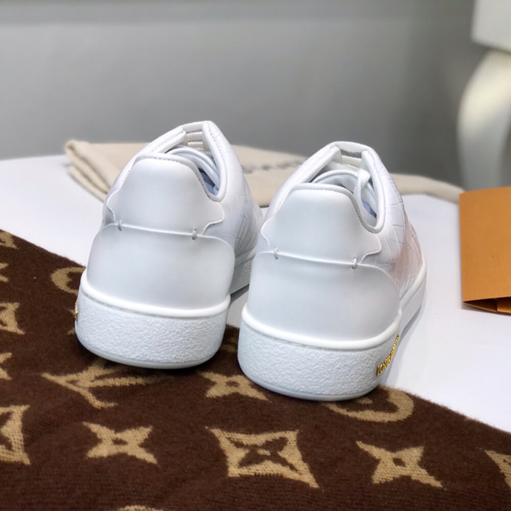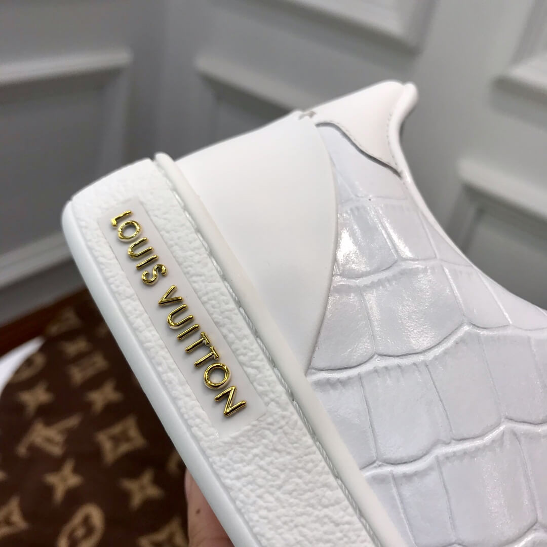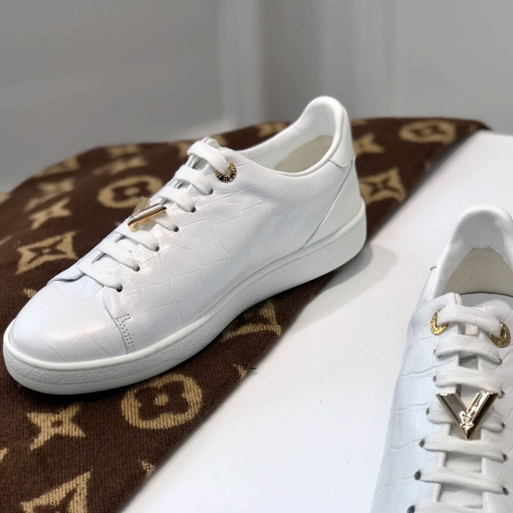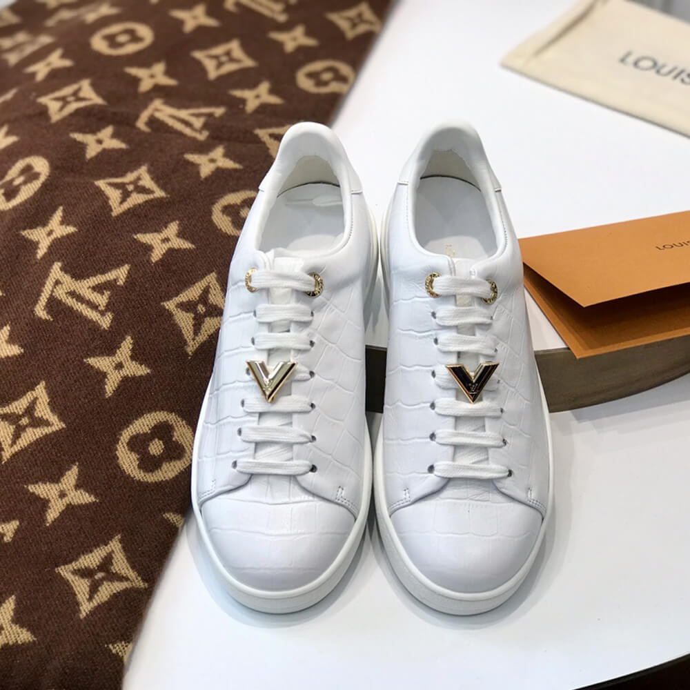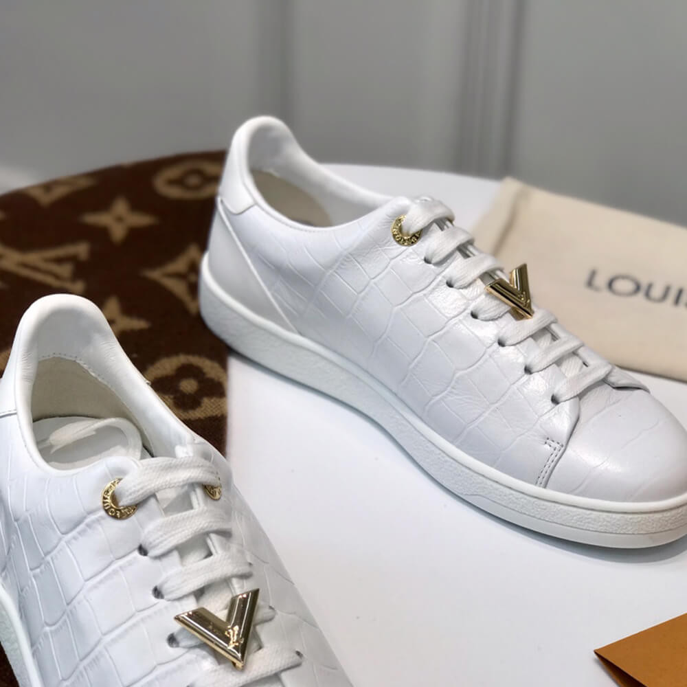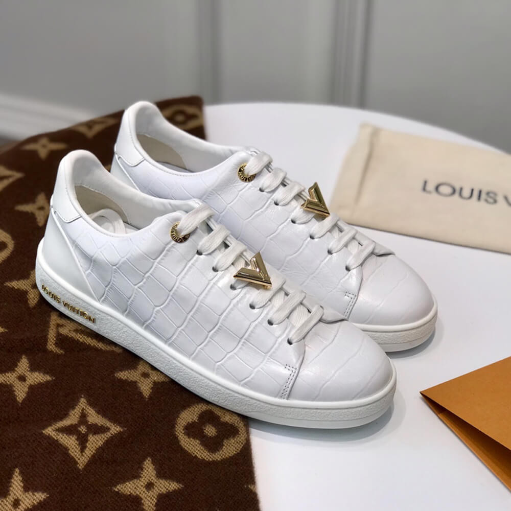 Louis Vuitton's Frontrow sneaker is given a fresh twist this season in crocodile-embossed white calf leather. A V-shaped lace accessory in gold-tone metal embellishes this sleek design, which also features gold-color eyelets and a Louis Vuitton signature on the rubber outsole.