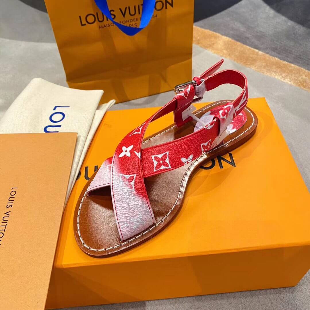 Capturing the laid-back spirit of summer, the Palma flat sandal is crafted from colorful patent Monogram canvas with a tie-dye effect. This model belongs to the LV Escale Summer 2020 collection. Its wide cross-over straps are adjusted with an engraved, silver-tone buckle.