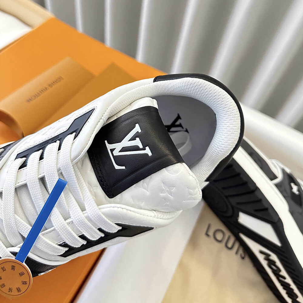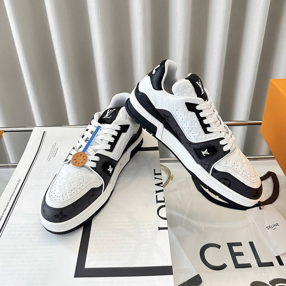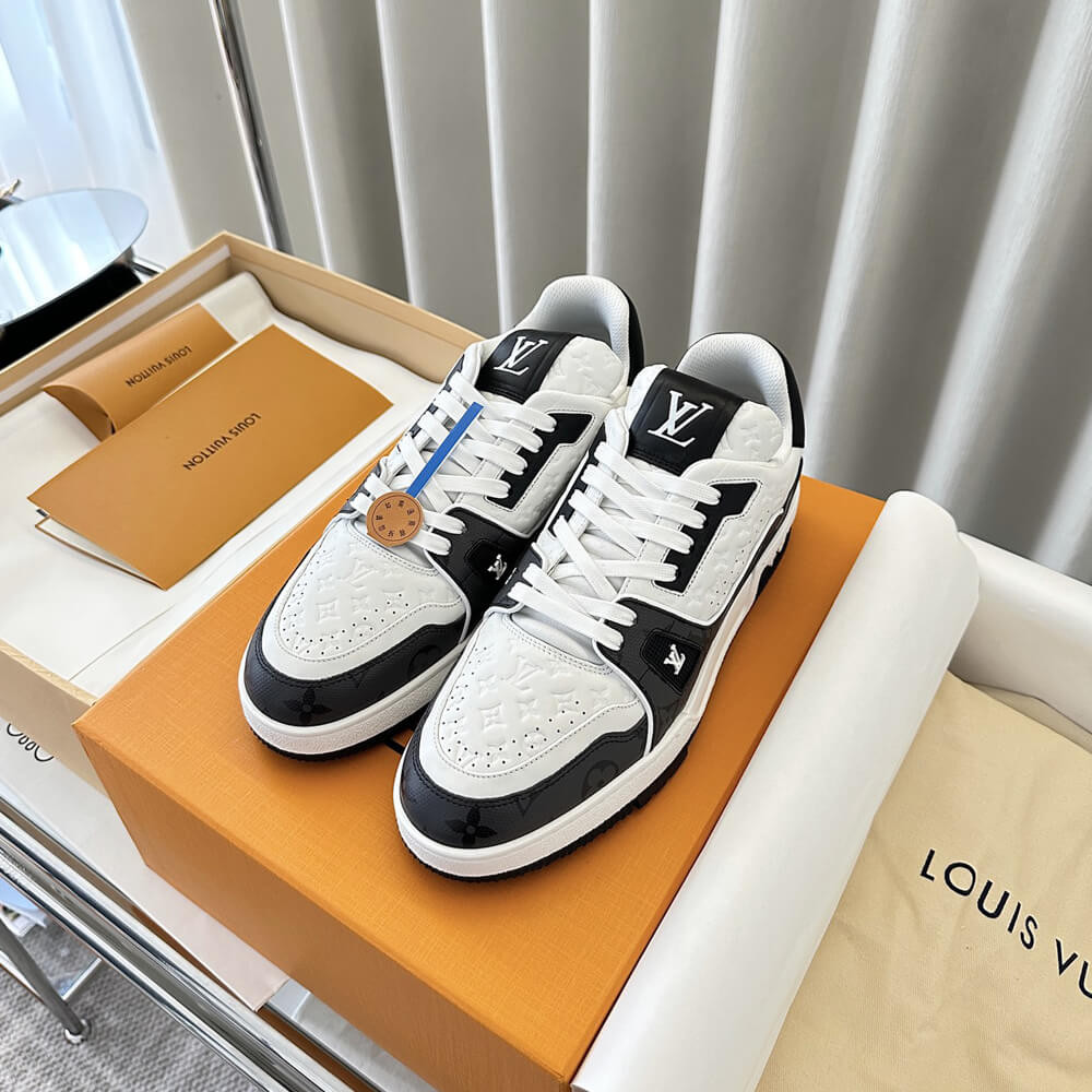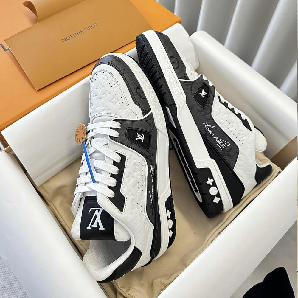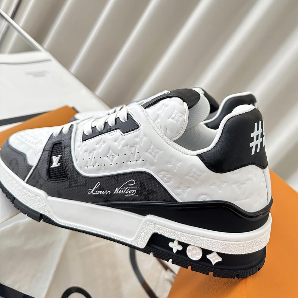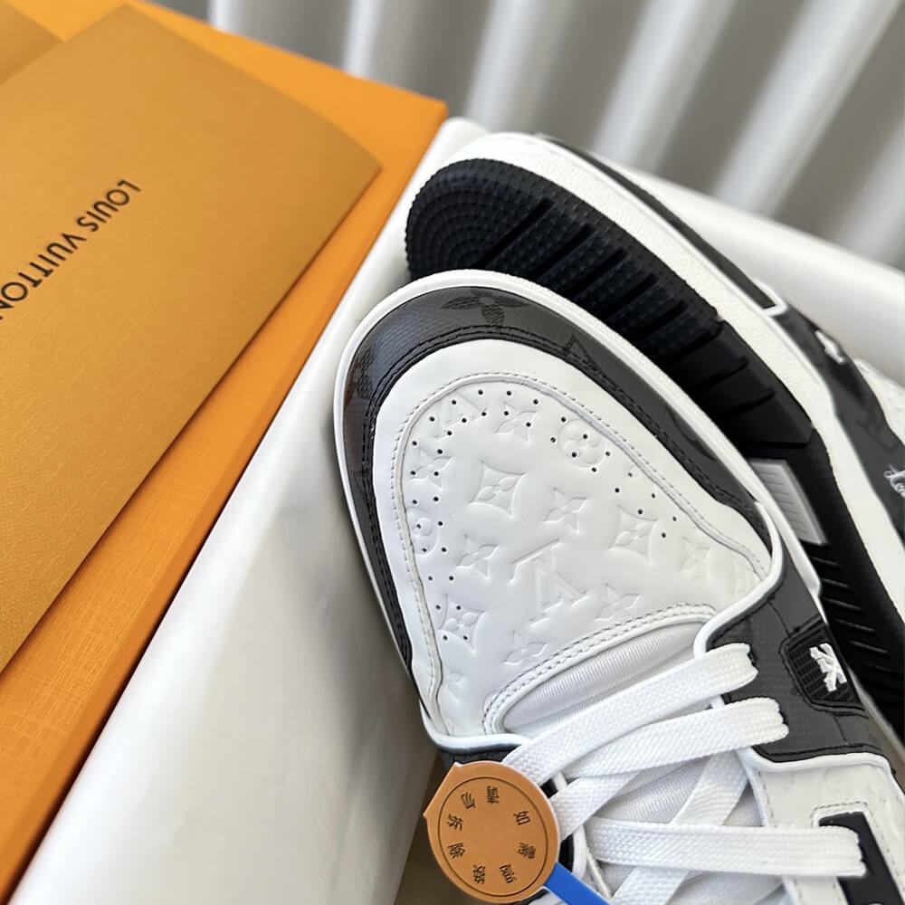 The Louis Vuitton LV Trainer #54 Black White combines Monogram leather with calfskin embossed with the Mini Monogram motif. Designed by Virgil Abloh, this iconic model is inspired by vintage basketball sneakers. Its elaborately constructed upper, which is distinguished by its rich details and Louis Vuitton signatures, takes seven hours to stitch.