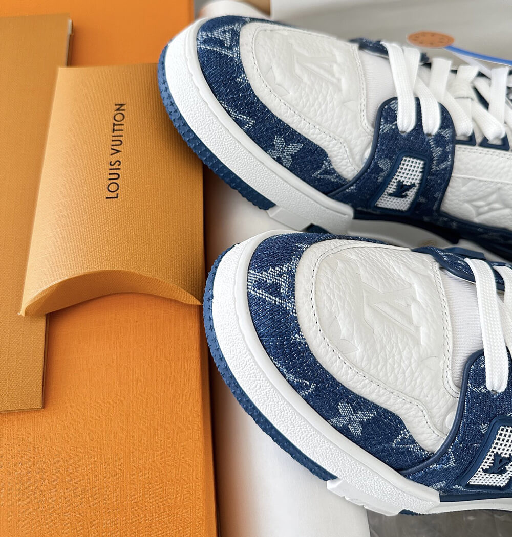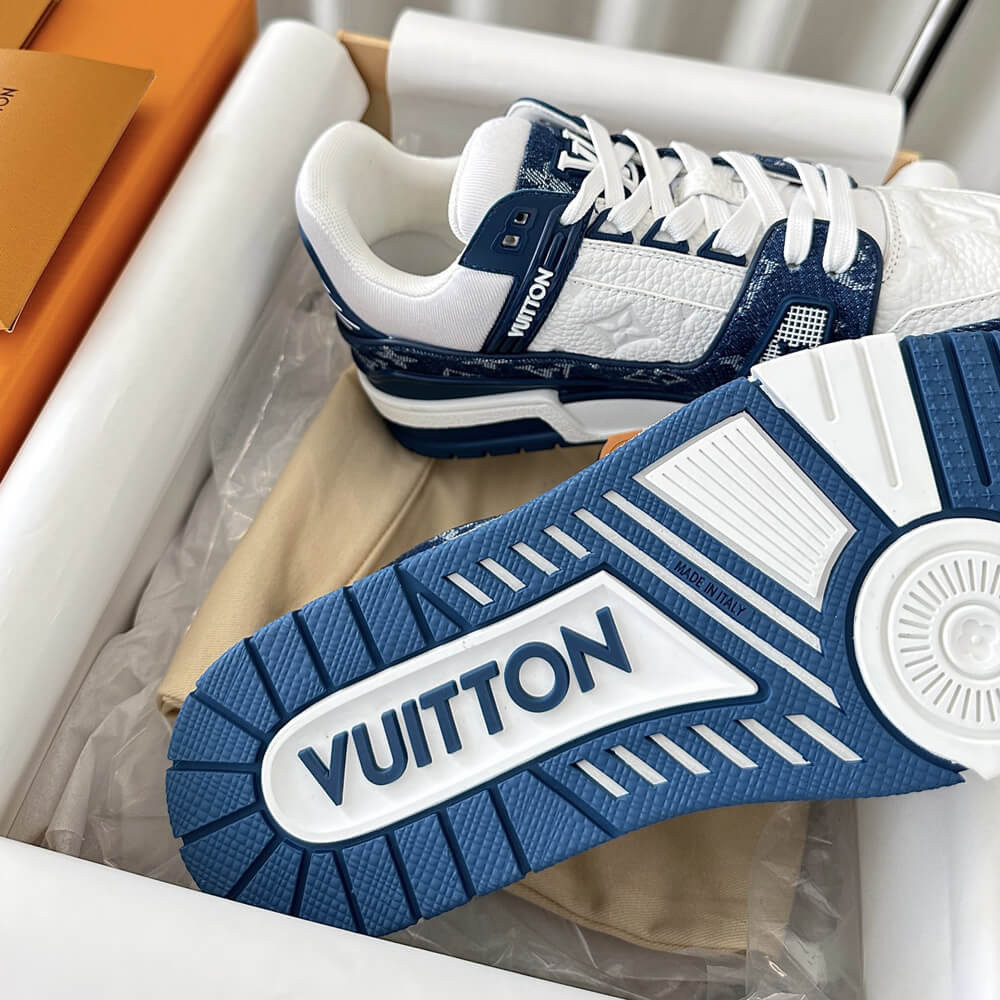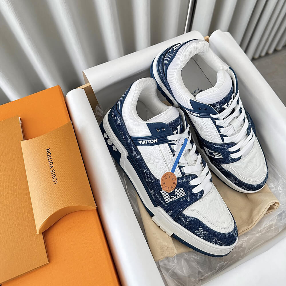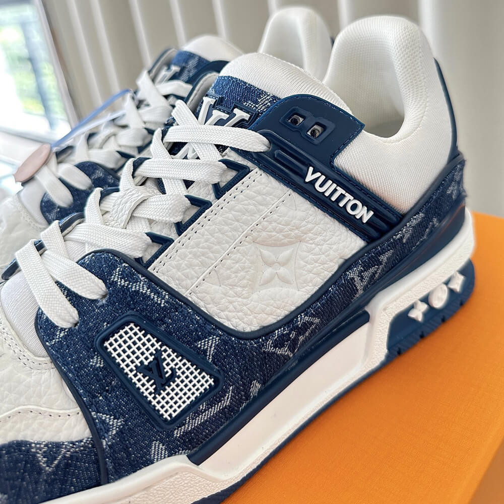 Louis Vuitton LV Trainer Monogram Denim White Blue - Designed by Louis Vuitton Artistic Director Virgil Abloh, the iconic LV Trainer sneaker is revisited this season in Monogram denim and Monogram embossed calfskin. Contrasting colors and materials highlight the elaborate construction of this model, inspired by vintage basketball sneakers. A single pair takes seven hours to sew.