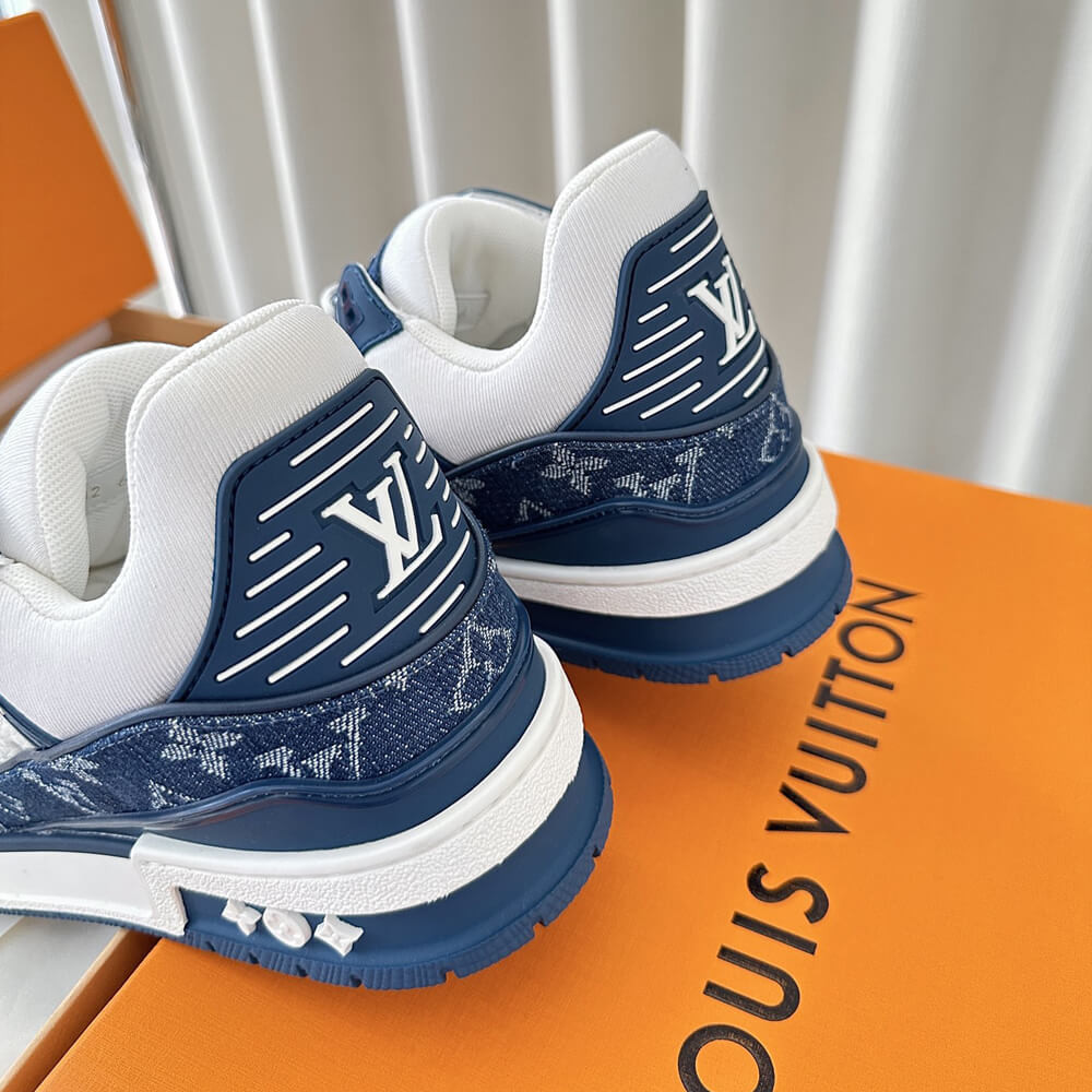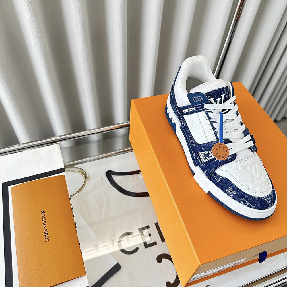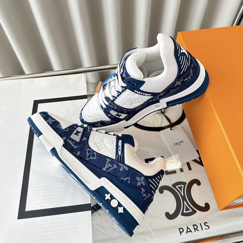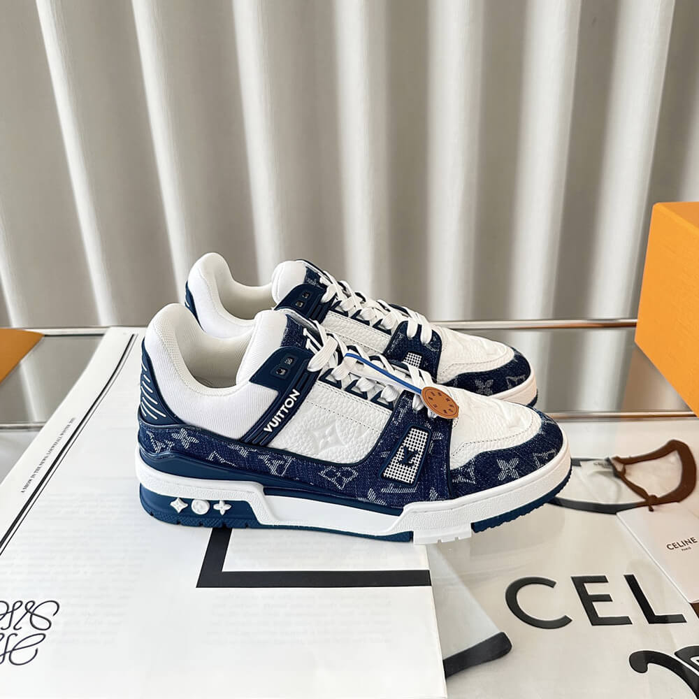 Louis Vuitton LV Trainer Monogram Denim White Blue - Designed by Louis Vuitton Artistic Director Virgil Abloh, the iconic LV Trainer sneaker is revisited this season in Monogram denim and Monogram embossed calfskin. Contrasting colors and materials highlight the elaborate construction of this model, inspired by vintage basketball sneakers. A single pair takes seven hours to sew.