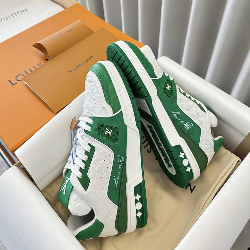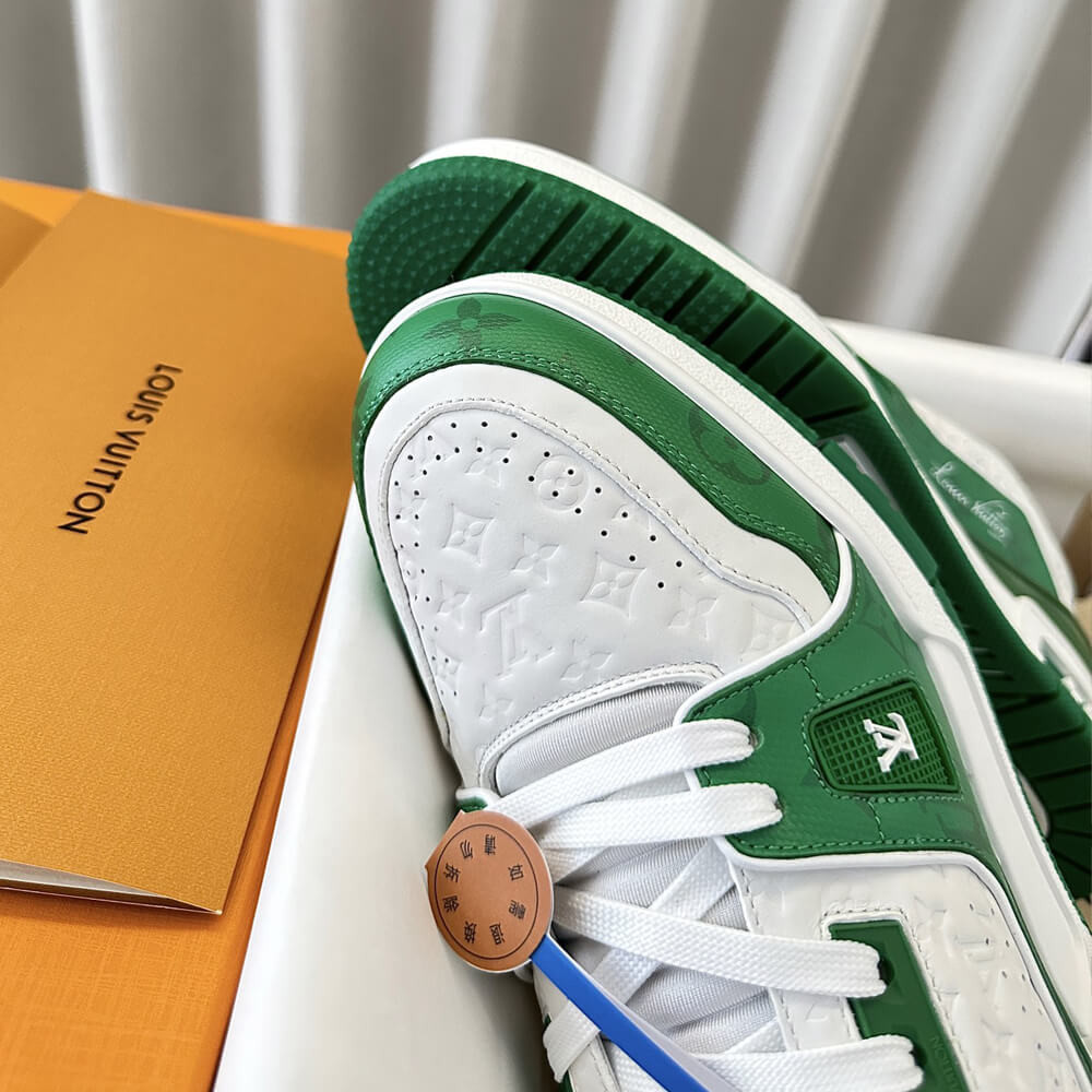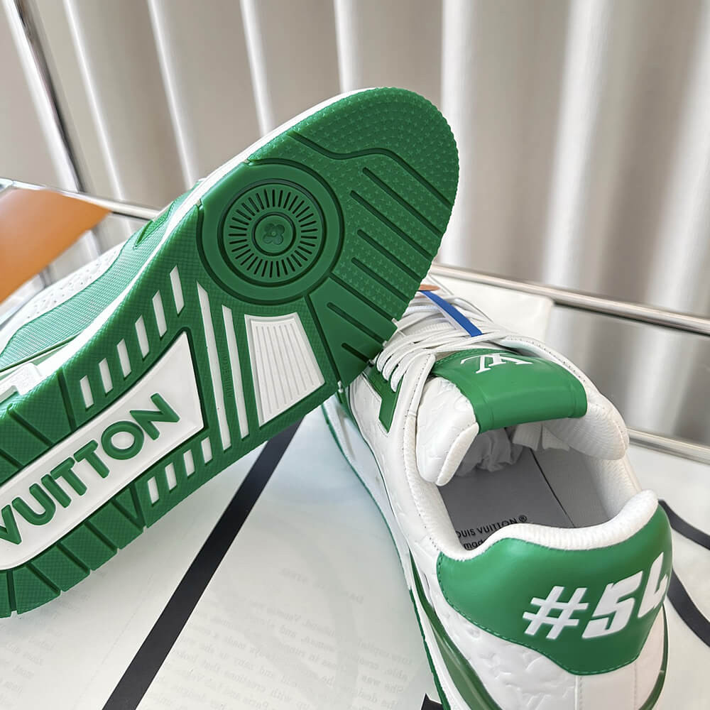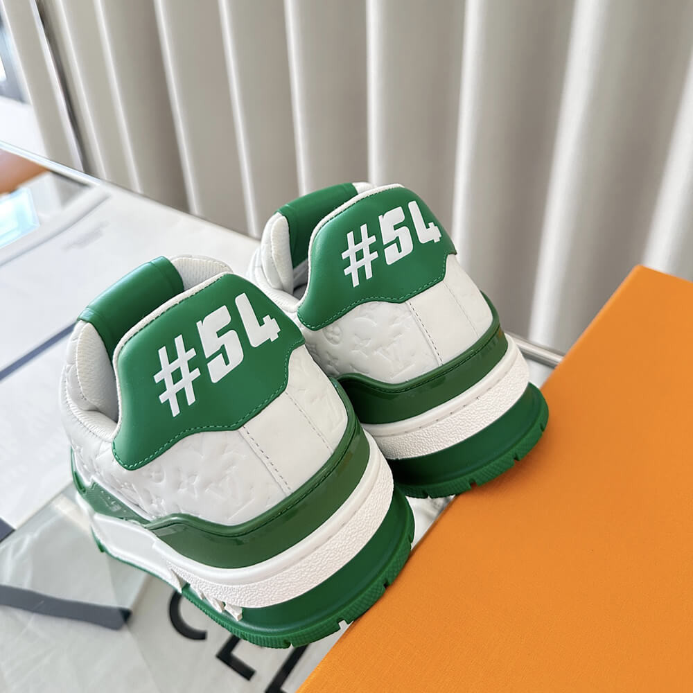 The Louis Vuitton Trainer #54 Signature Green White is distinguished by the combination of leather with the emblematic decoration of the Maison and calfskin with the Mini Monogram motif embossed. The iconic sneaker, designed by Virgil Abloh, is inspired by vintage basketball models. The original upper, whose creation takes seven hours of work, is embellished with exclusive details and the Louis Vuitton signatures.