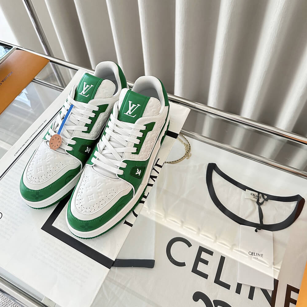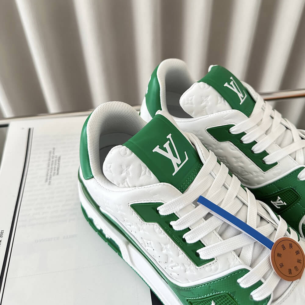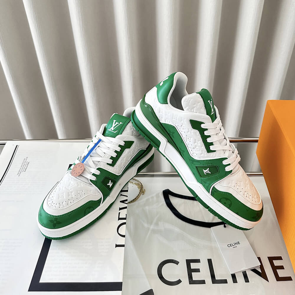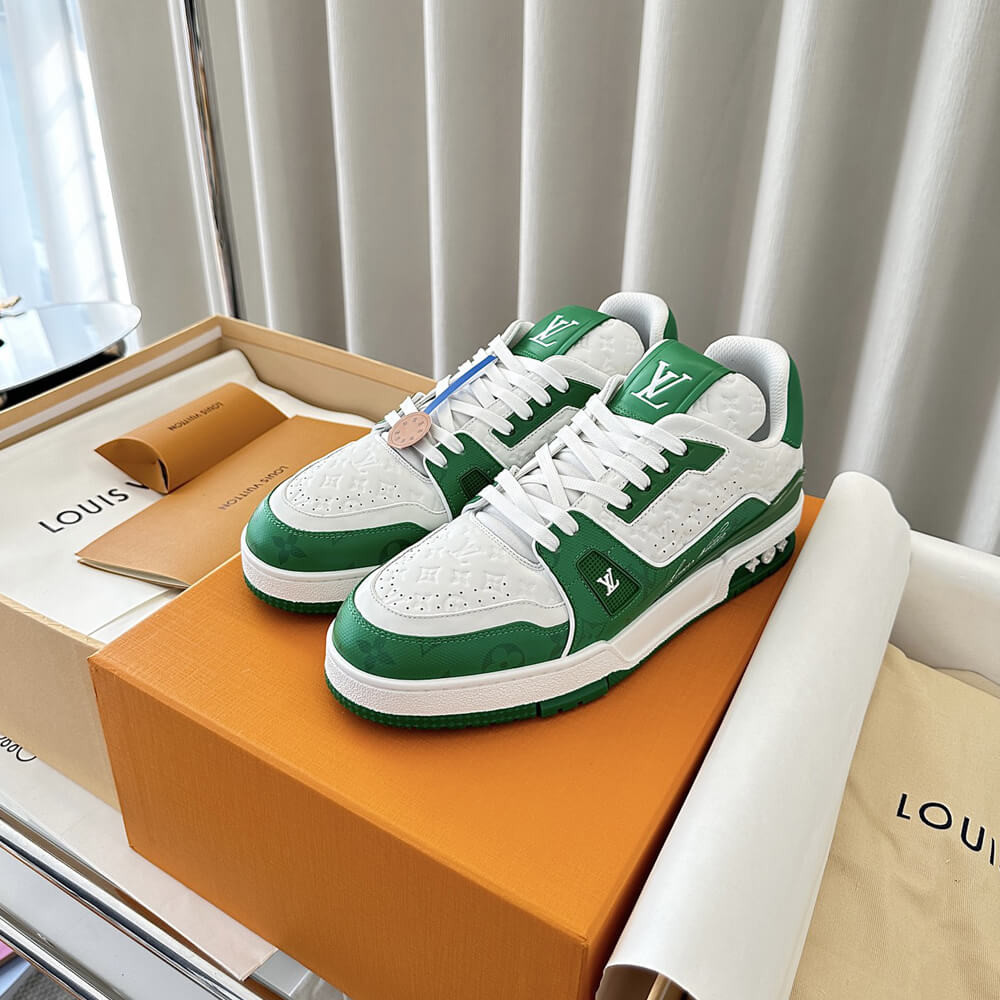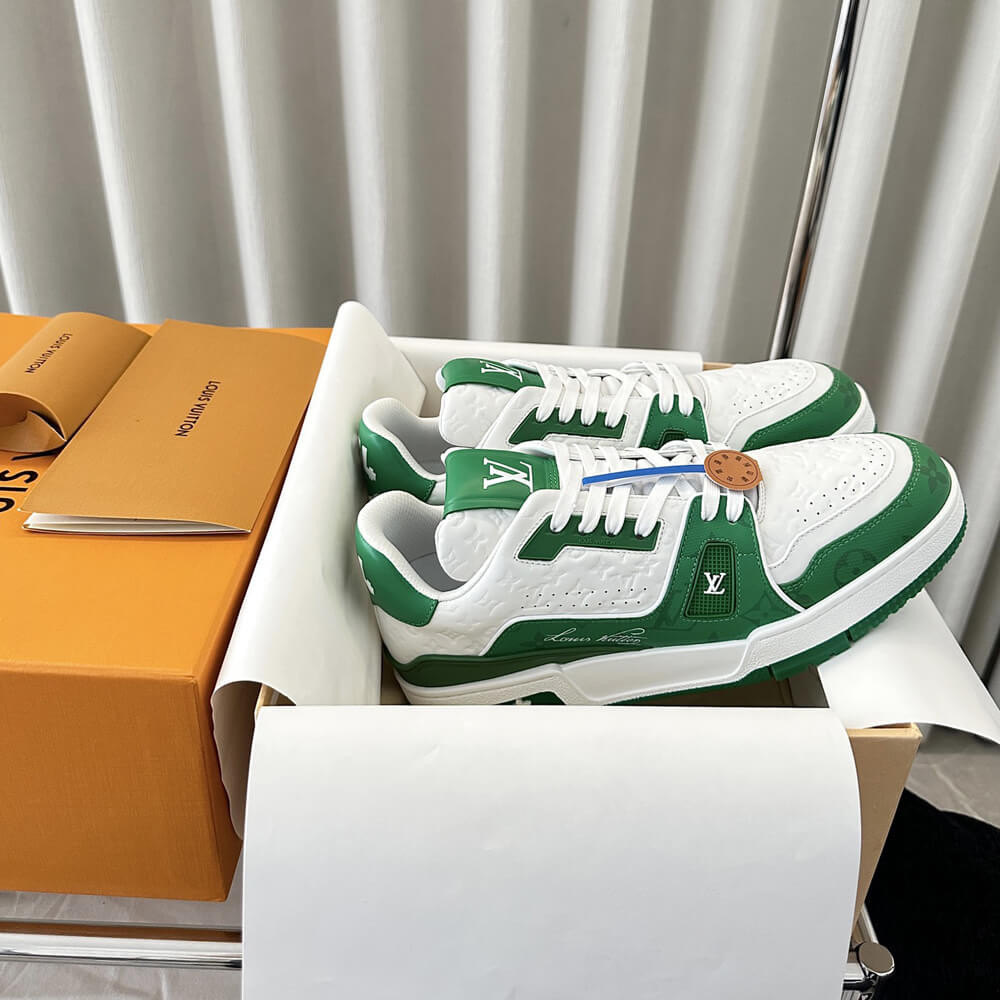 The Louis Vuitton Trainer #54 Signature Green White is distinguished by the combination of leather with the emblematic decoration of the Maison and calfskin with the Mini Monogram motif embossed. The iconic sneaker, designed by Virgil Abloh, is inspired by vintage basketball models. The original upper, whose creation takes seven hours of work, is embellished with exclusive details and the Louis Vuitton signatures.