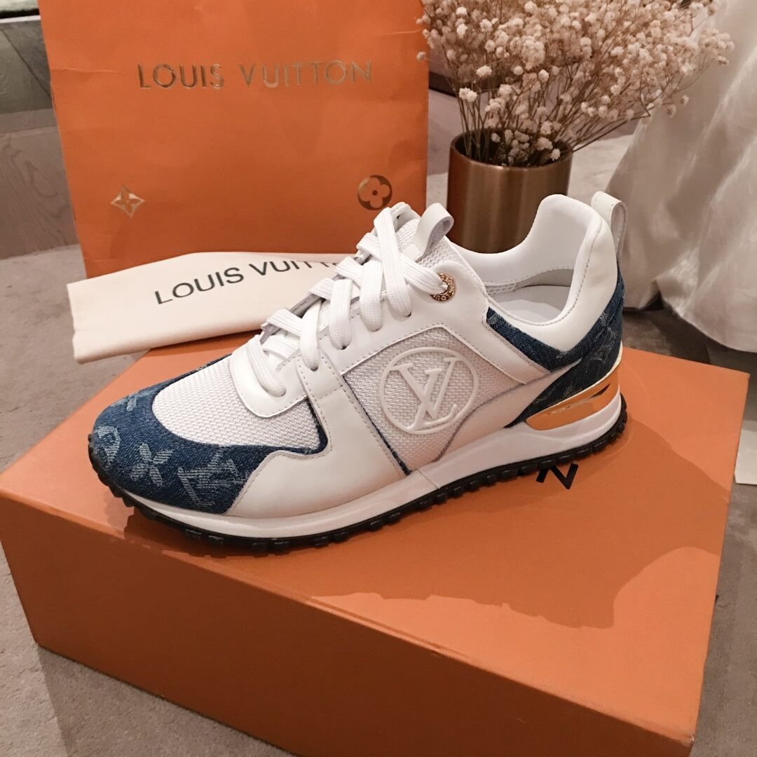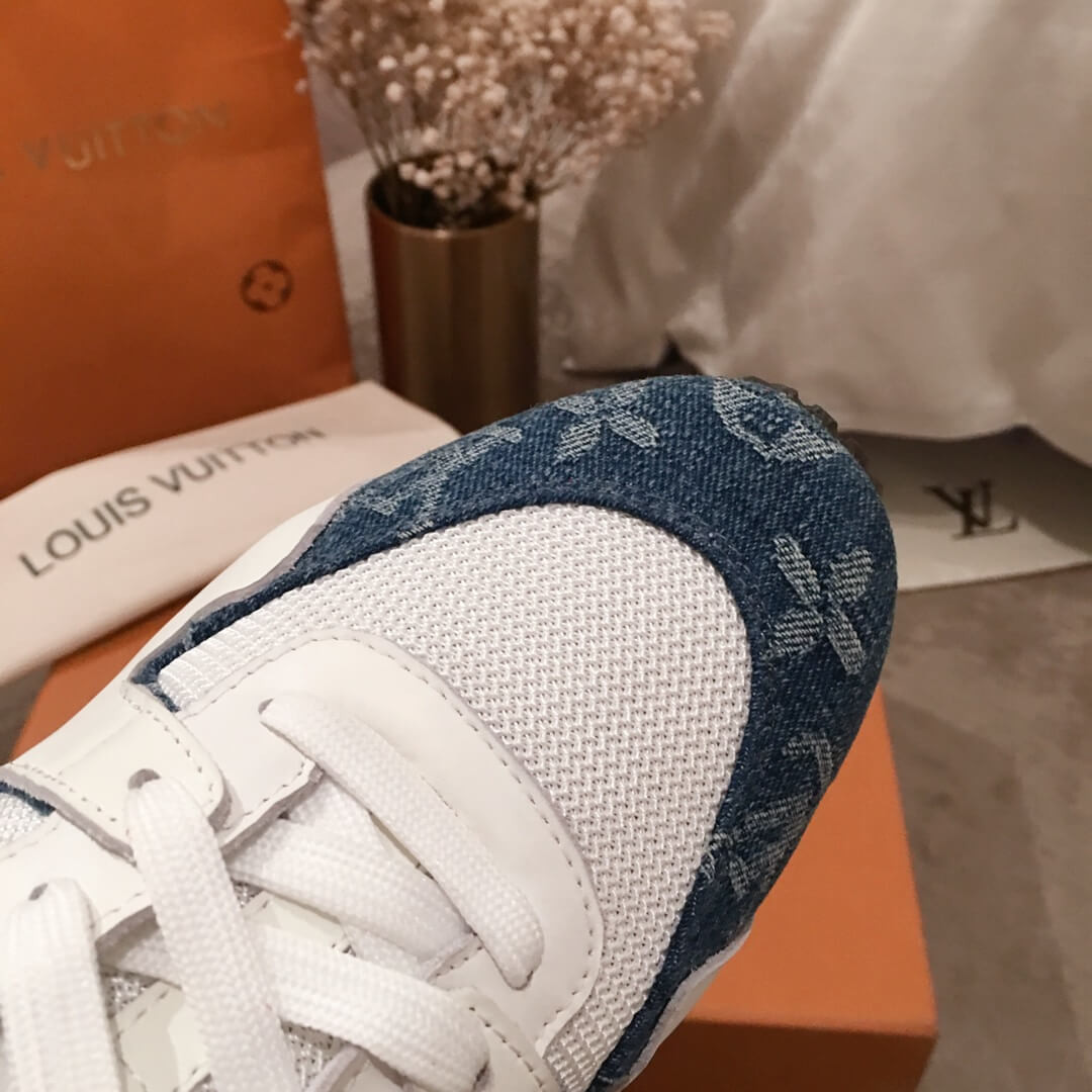 Reinterpreting a classic running shoe, the Run Away sneaker is one of the icons of the Louis Vuitton shoe collection. This versioncontrasts blue Monogram denim with white calf leather for a fresh, summery feel. It is signed with the LV Circle logo on the de, while the wedge-shaped outsole adds extra height.