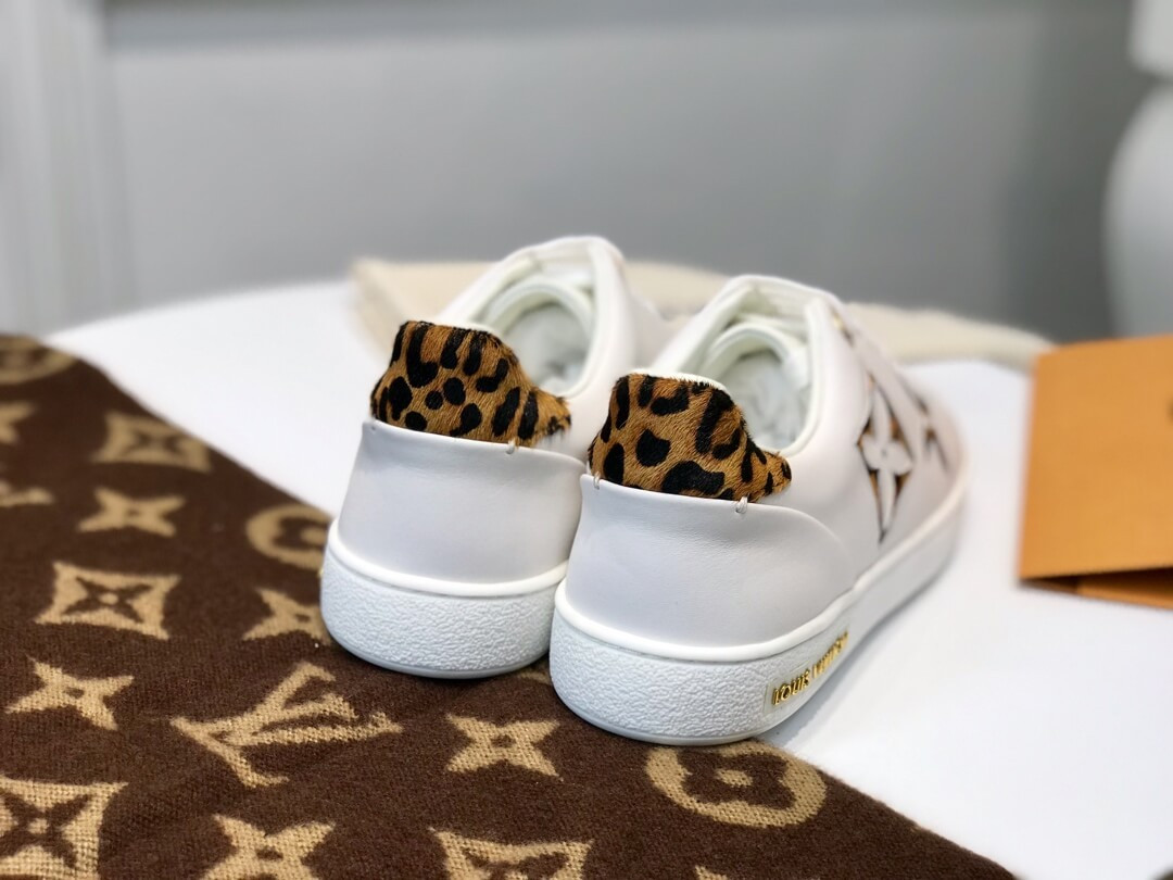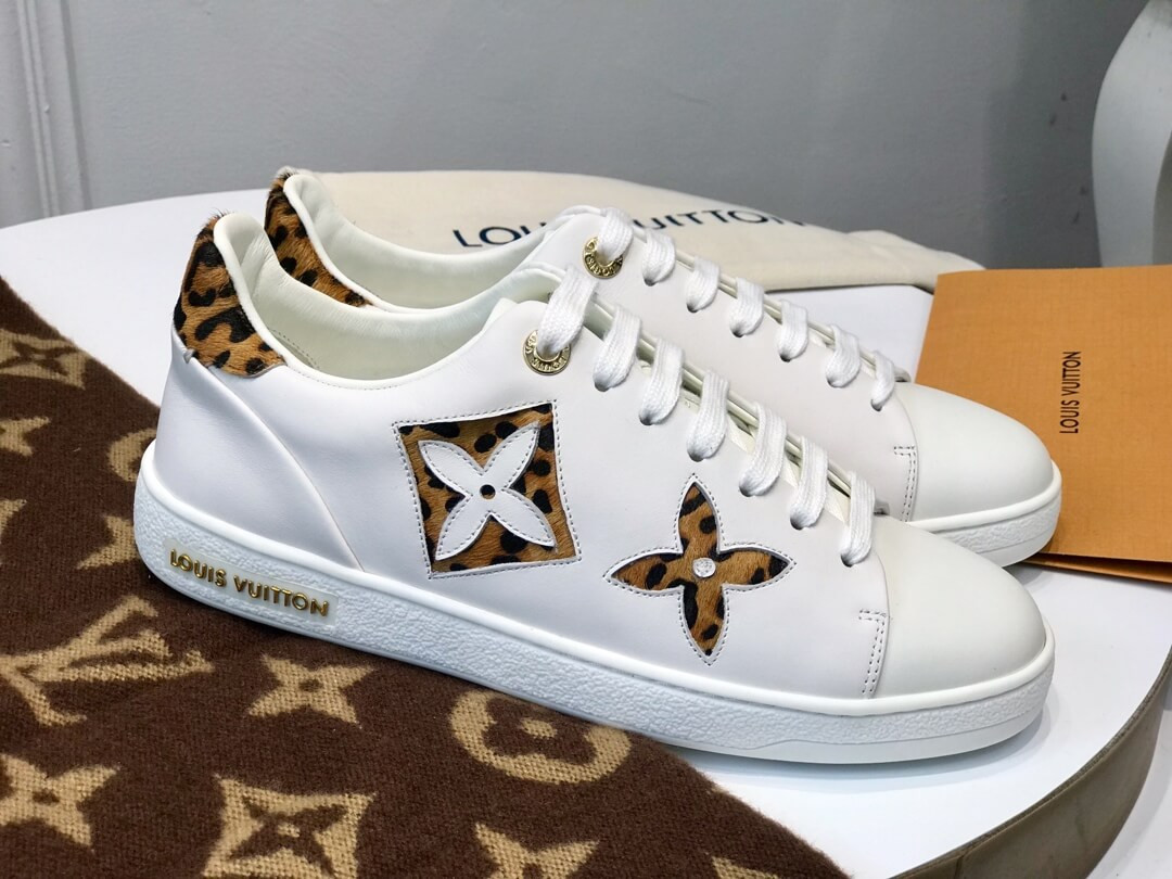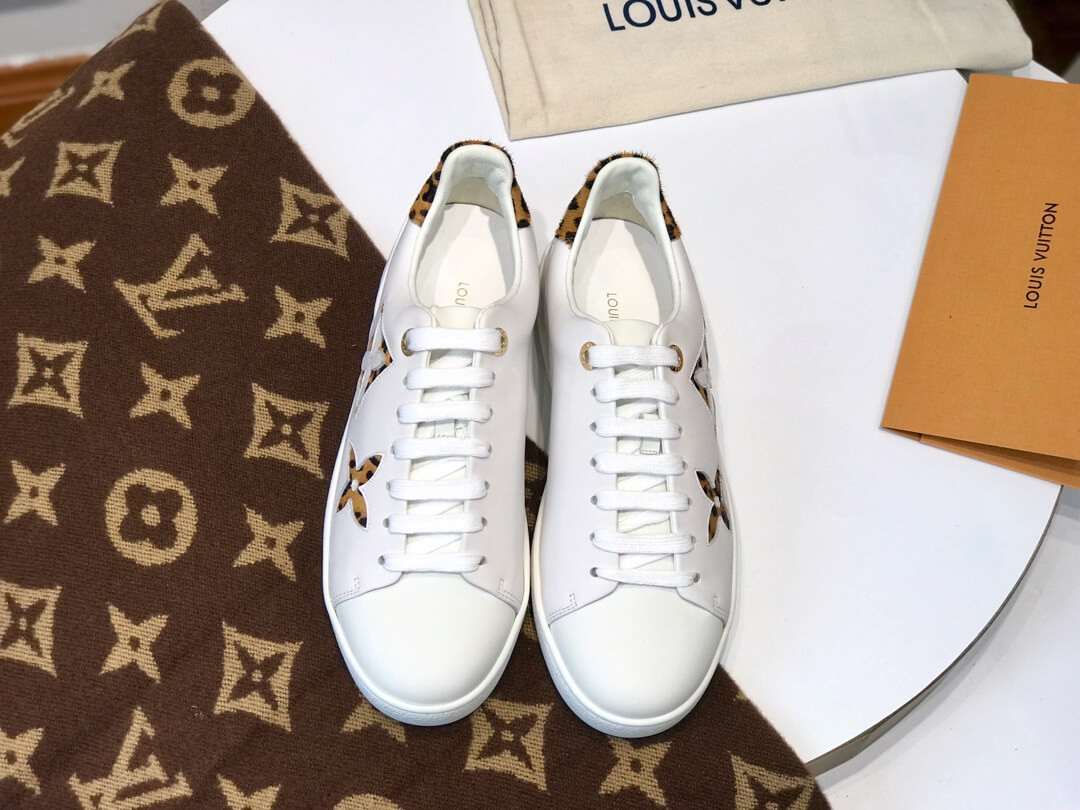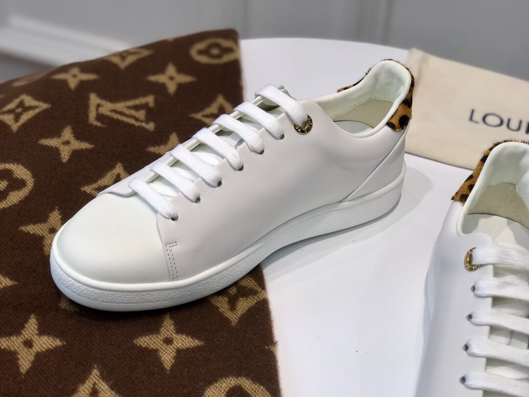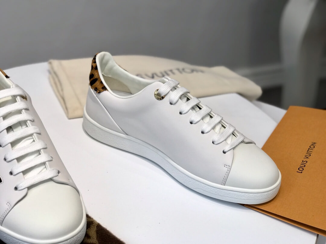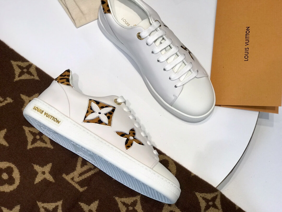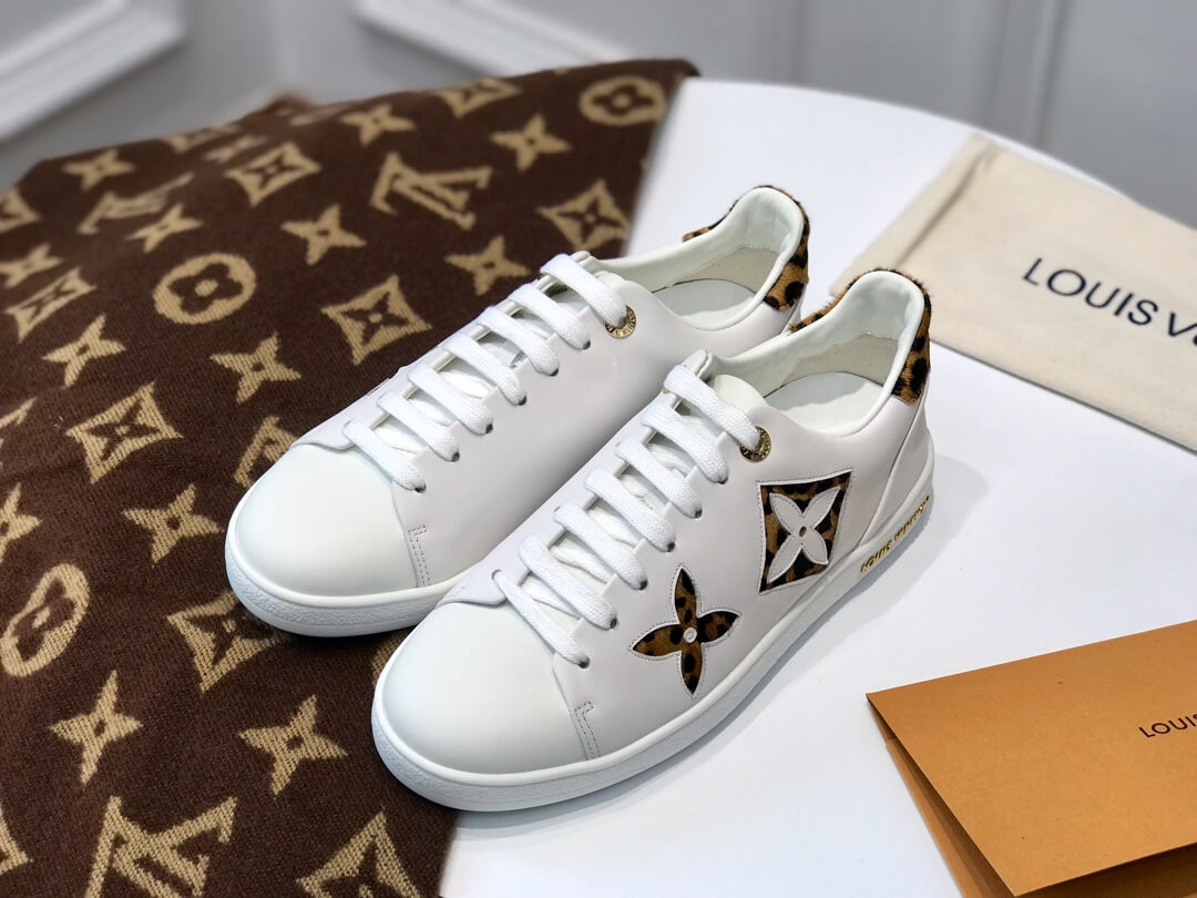 For the LV Jungle capsule collection of accessories and leather goods, the Frontrow sneaker is decorated with giant Monogram-Flowerpatches with a bold leopard print. They complement the white calf leather and sleek lines of this sneaker, which is one of Louis Vuitton's emblematic models.
