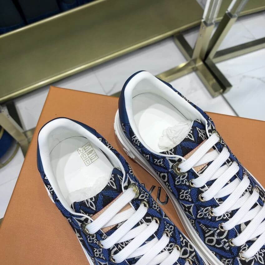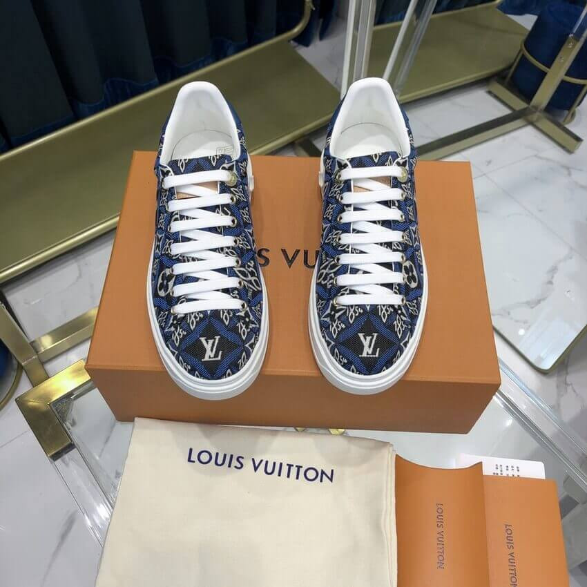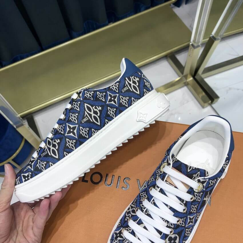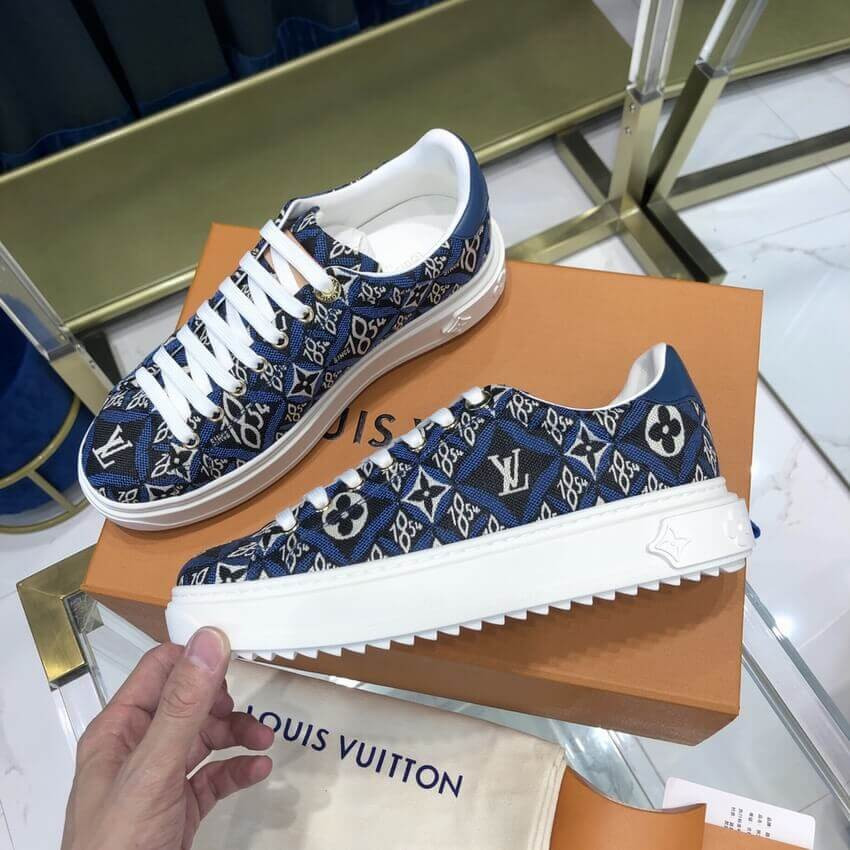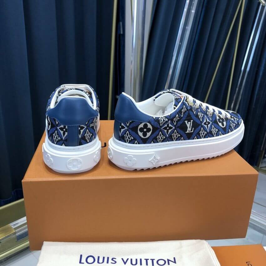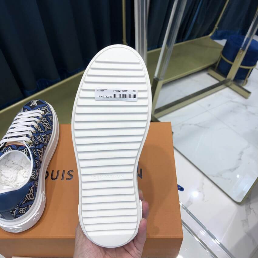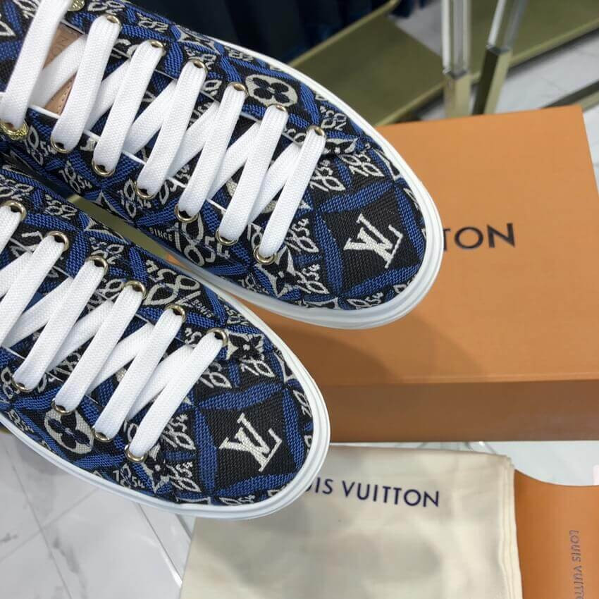 Characterized by its on-trend, elevated outsole, the Time Out sneaker is revisited in blue jacquard textile for the Since 1854 edition of accessories, leather goods and ready-to-wear. The date 1854, which is interwoven with Louis Vuitton symbols, is when the House was founded. A natural leather label on the tongue completes this design.